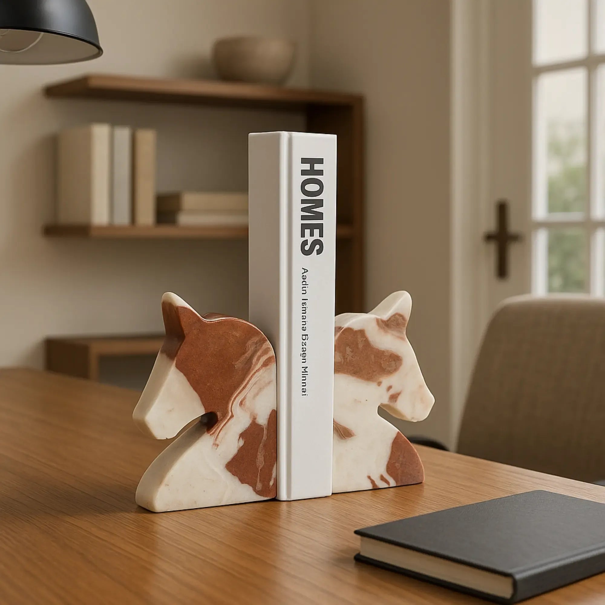 Buchstützen Pferd; Pferdekopf Buchhalter; Designer-Buchstützen; schwere Regalstützen; Marmorbuchstütze Optik; elegantes Bücherregal-Accessoire.