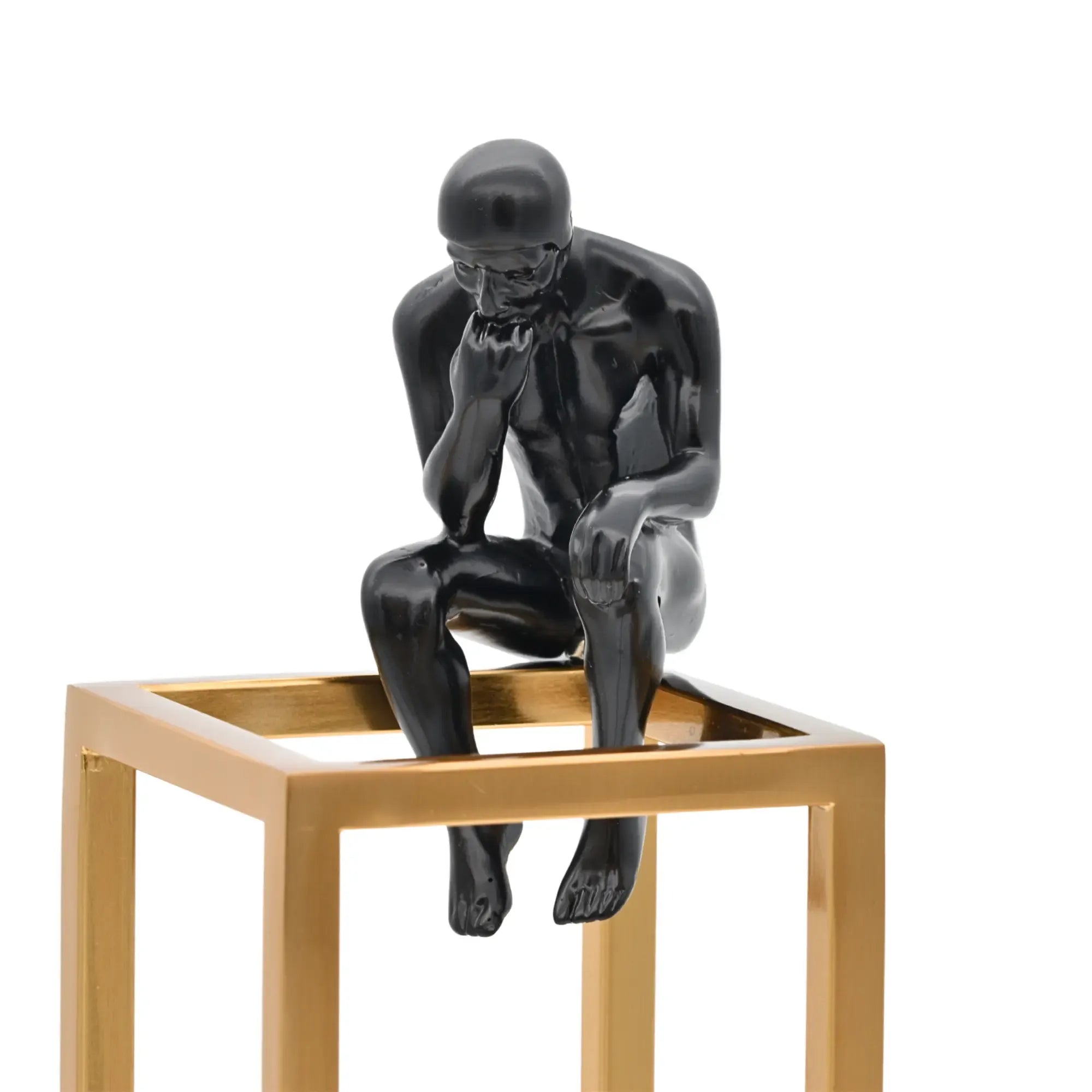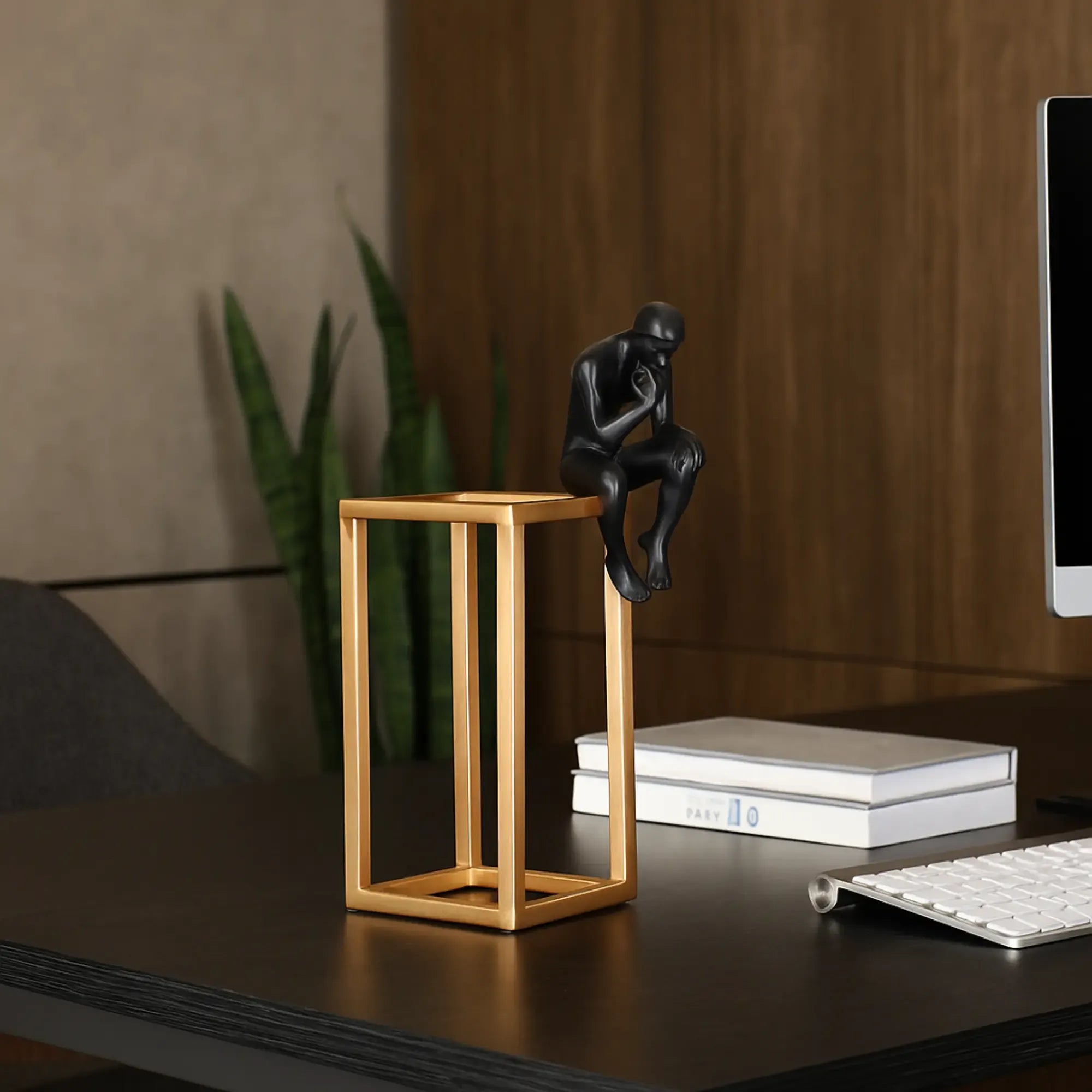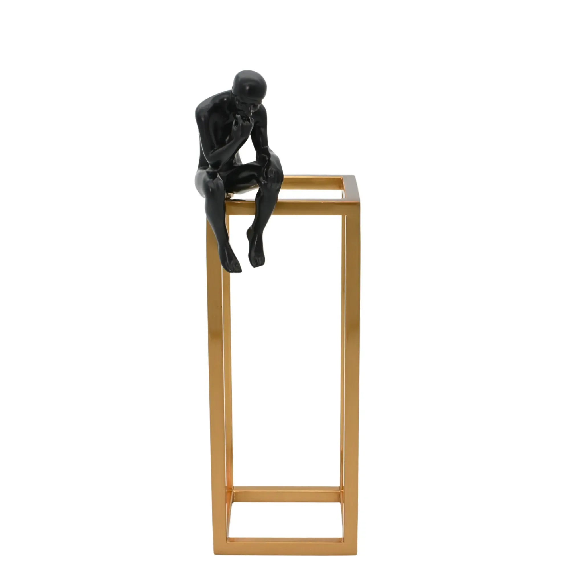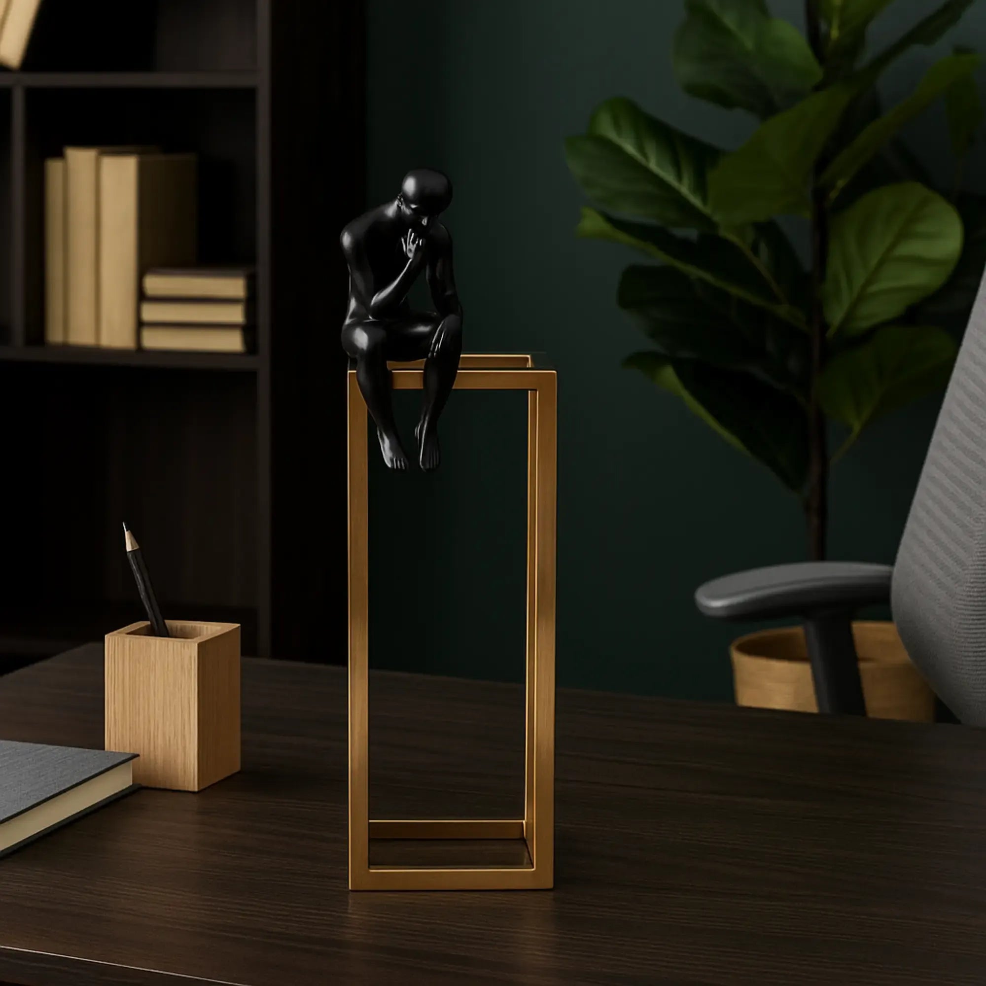 Ein zeitgenössisches Statement-Piece, das Reflexion sichtbar macht: Eine stilisierte Figur in klassischer Denkerpose sitzt auf einem offenen, geometrischen Rahmen in warmem Goldton. Die Komposition spielt mit Leere und Volumen, mit Schatten und Glanz – ein Dialog zwischen stiller Konzentration und moderner Architektur.