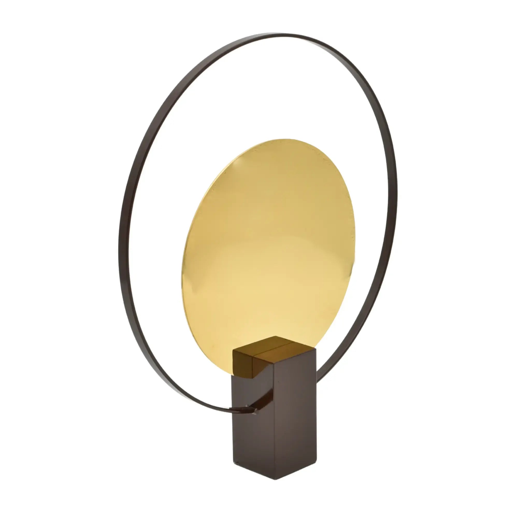 Ein reduziertes Kunstobjekt mit maximaler Wirkung. Eine kreisrunde, spiegelnde Edelstahlscheibe schwebt scheinbar frei in einem filigranen Metallring – gehalten von einem präzise gearbeiteten Träger auf einem soliden Sockel. Die bewusste Distanz zwischen Scheibe und Ring schafft Negativraum, der das Objekt leicht und architektonisch zugleich erscheinen lässt.