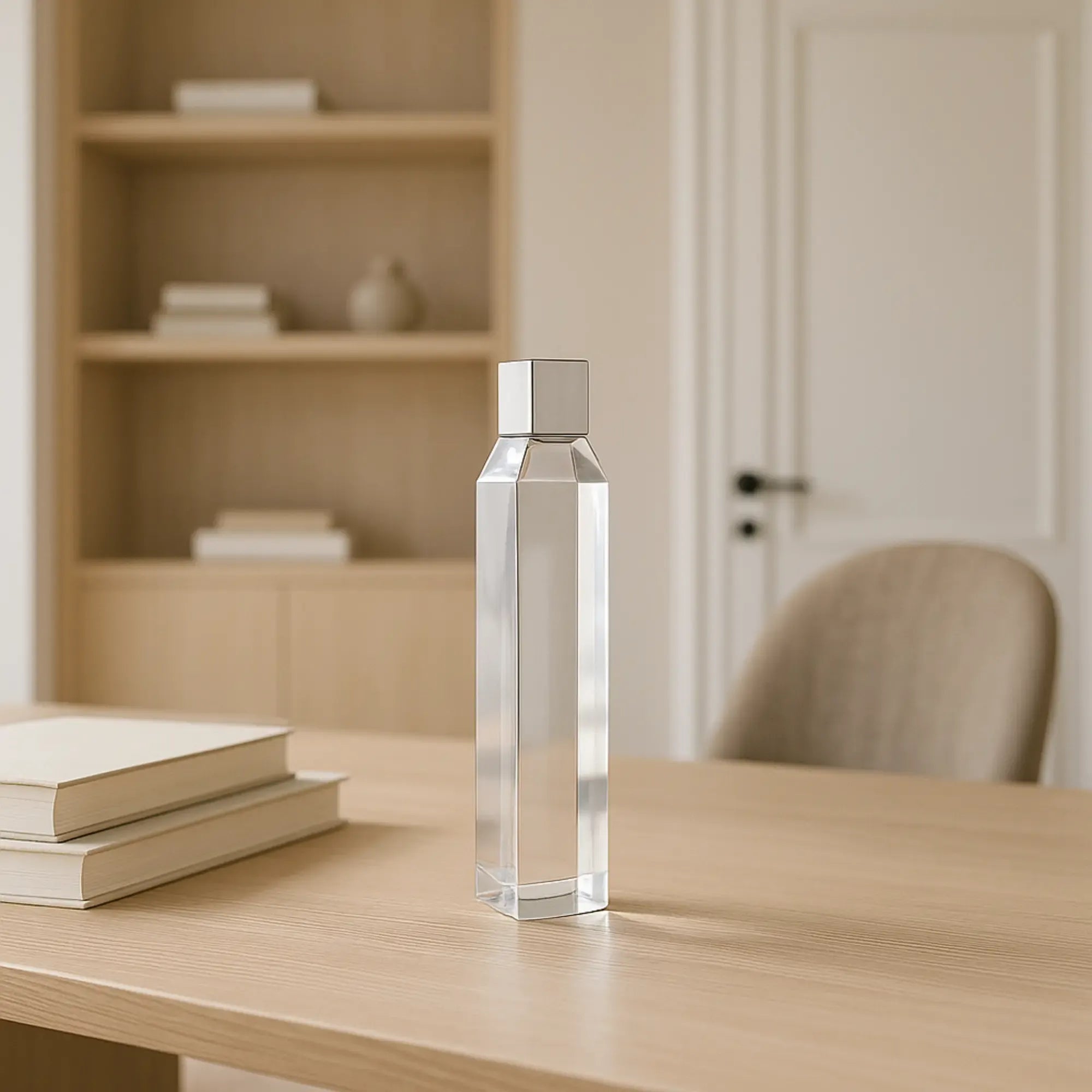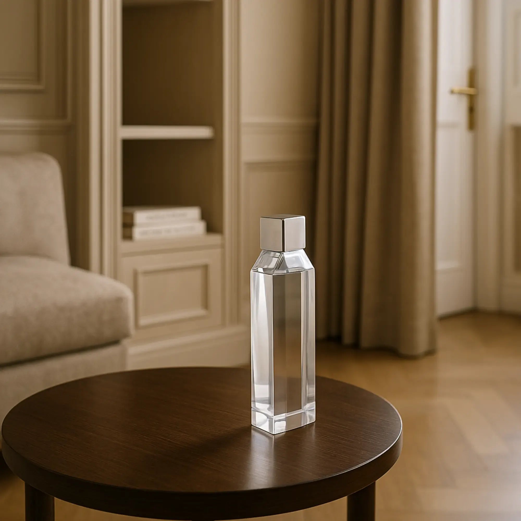 Klar, facettiert, ikonisch. Diese dekorative Kristallflasche inszeniert die zeitlose Silhouette eines Flakons als moderne Skulptur. Handpolierte Kanten brechen das Licht in feinen Prismen, mikroskopische Luftbläschen schweben wie eingefangene Funken – ein poetisches Spiel aus Transparenz, Tiefe und Glanz.