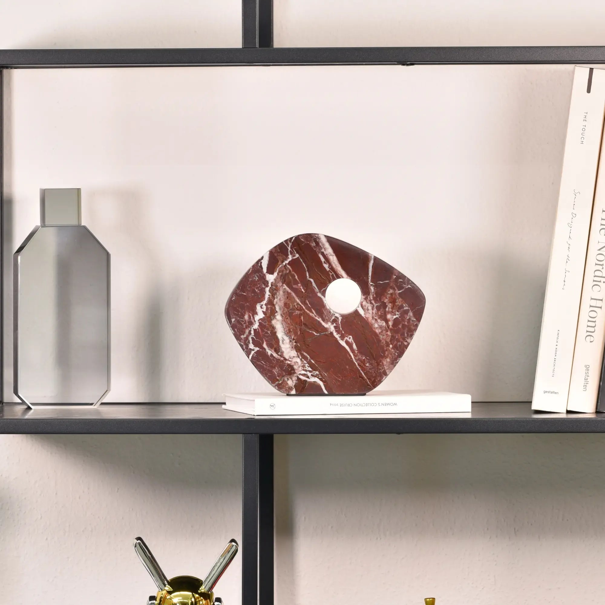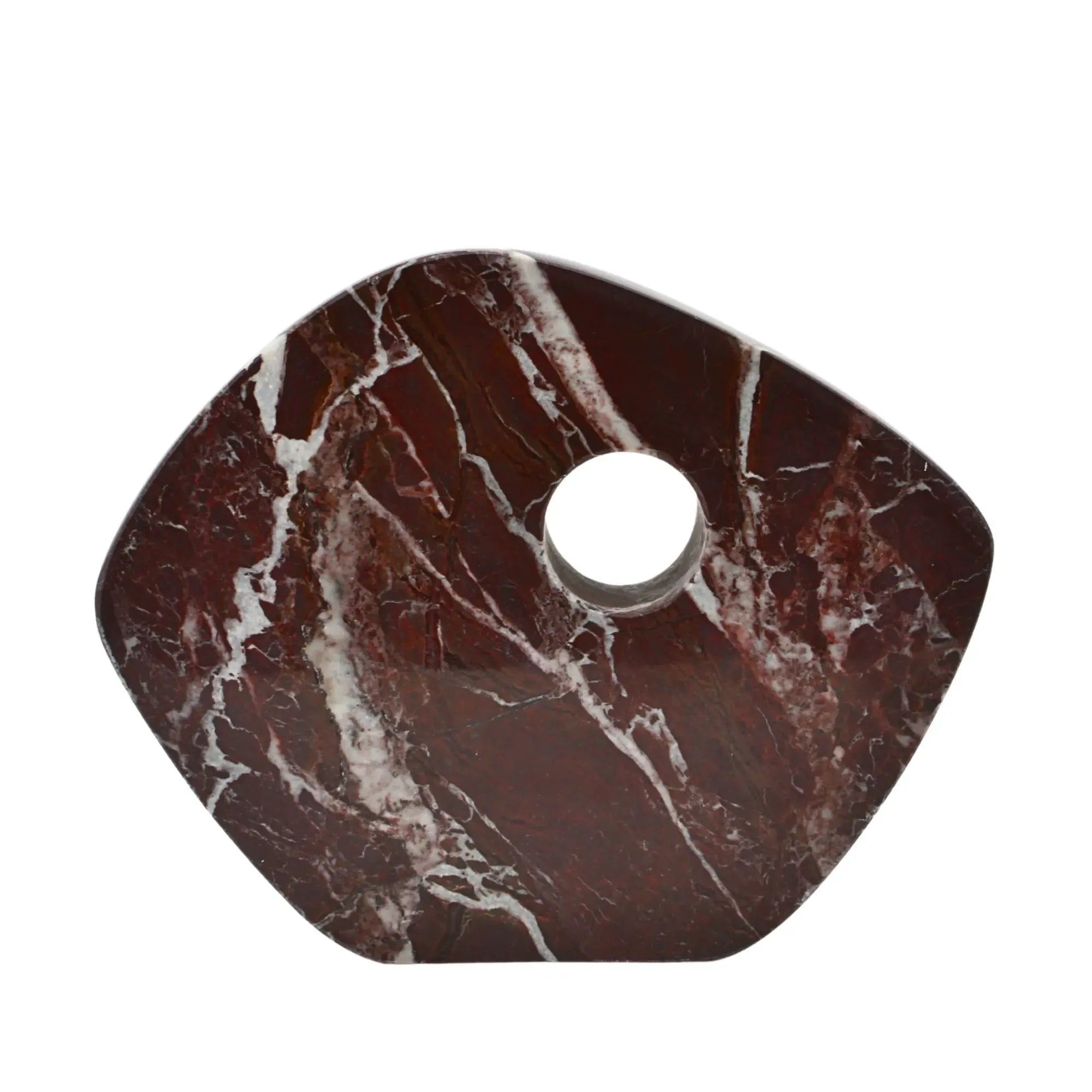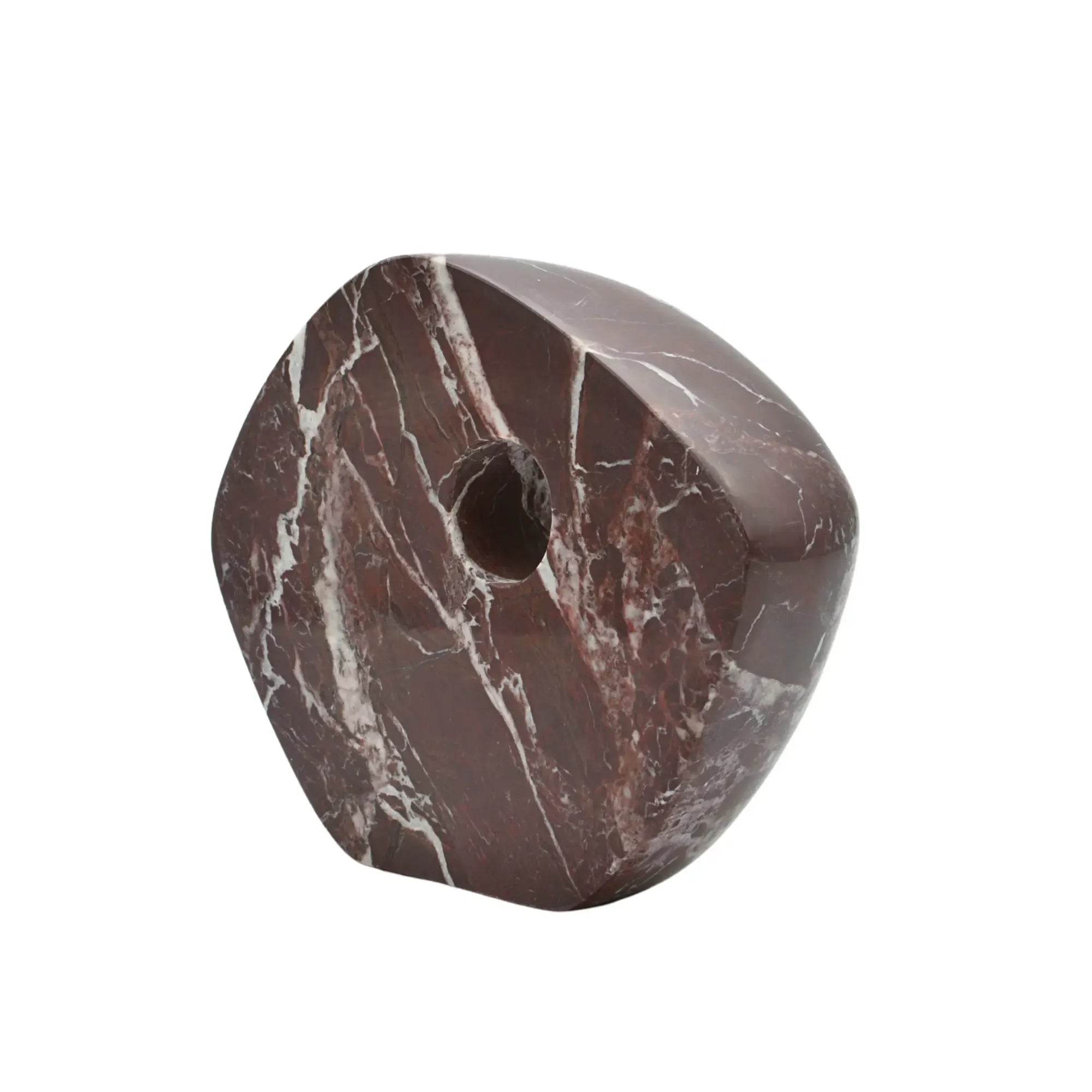 Die Oberfläche präsentiert ein edles Spiel aus tiefem Rotbraun und Schwarz, von feinen, weißen Adern durchzogen. Jede Aderung folgt der Logik des Gesteins und macht das Objekt zum unverwechselbaren Unikat. Der hochglänzende Schliff betont die Tiefe des Marmors und reflektiert sanft das Umgebungslicht – subtil, luxuriös, zeitlos.