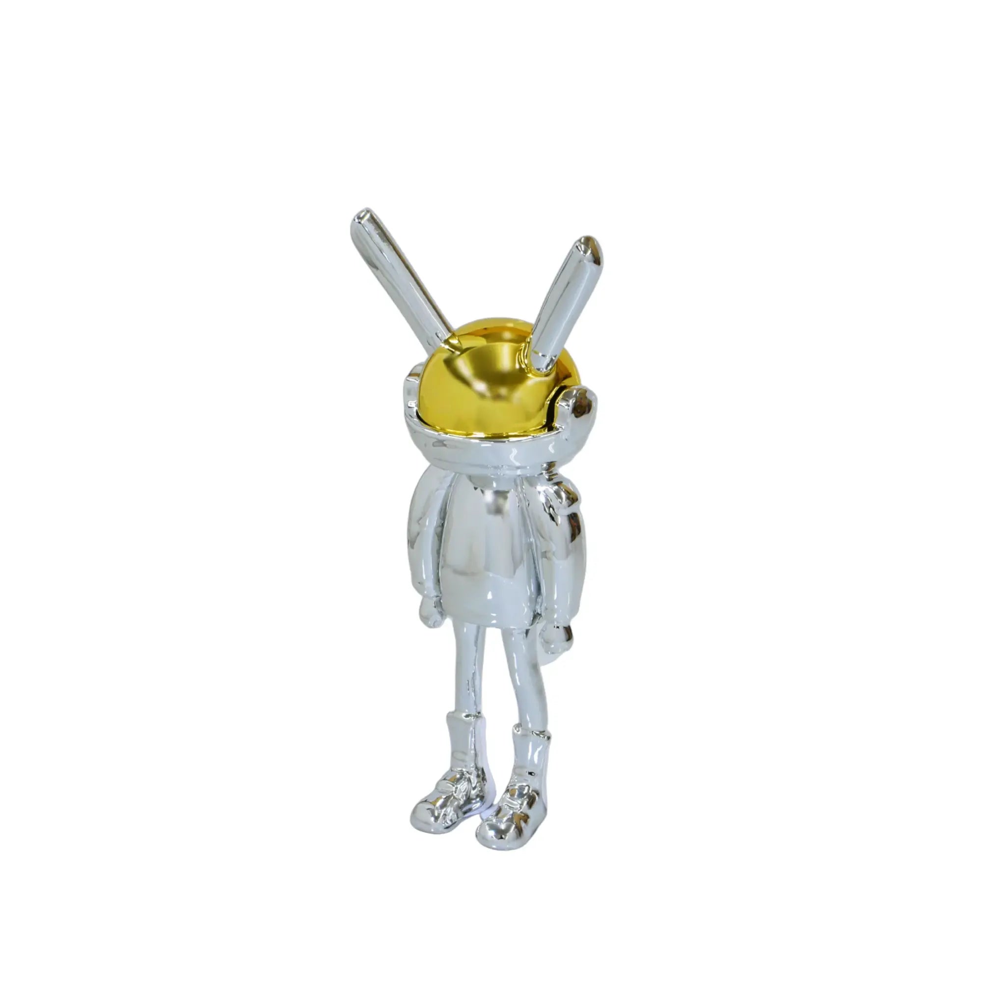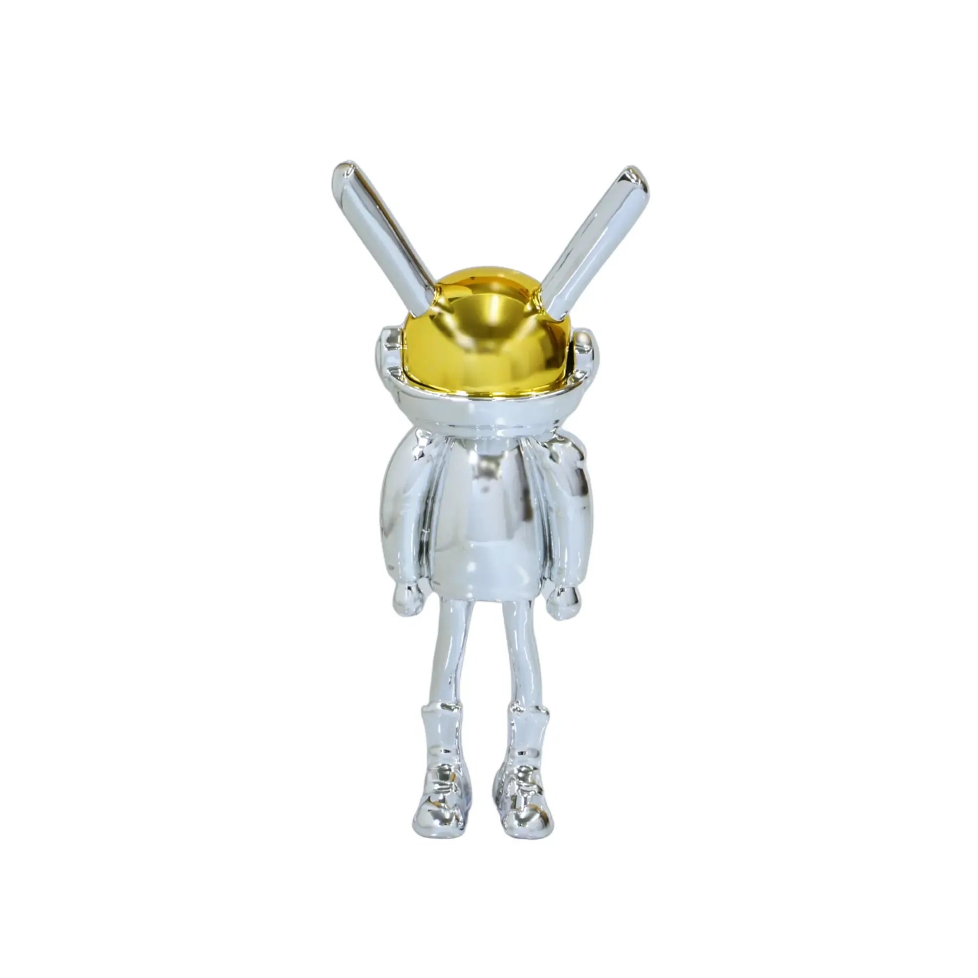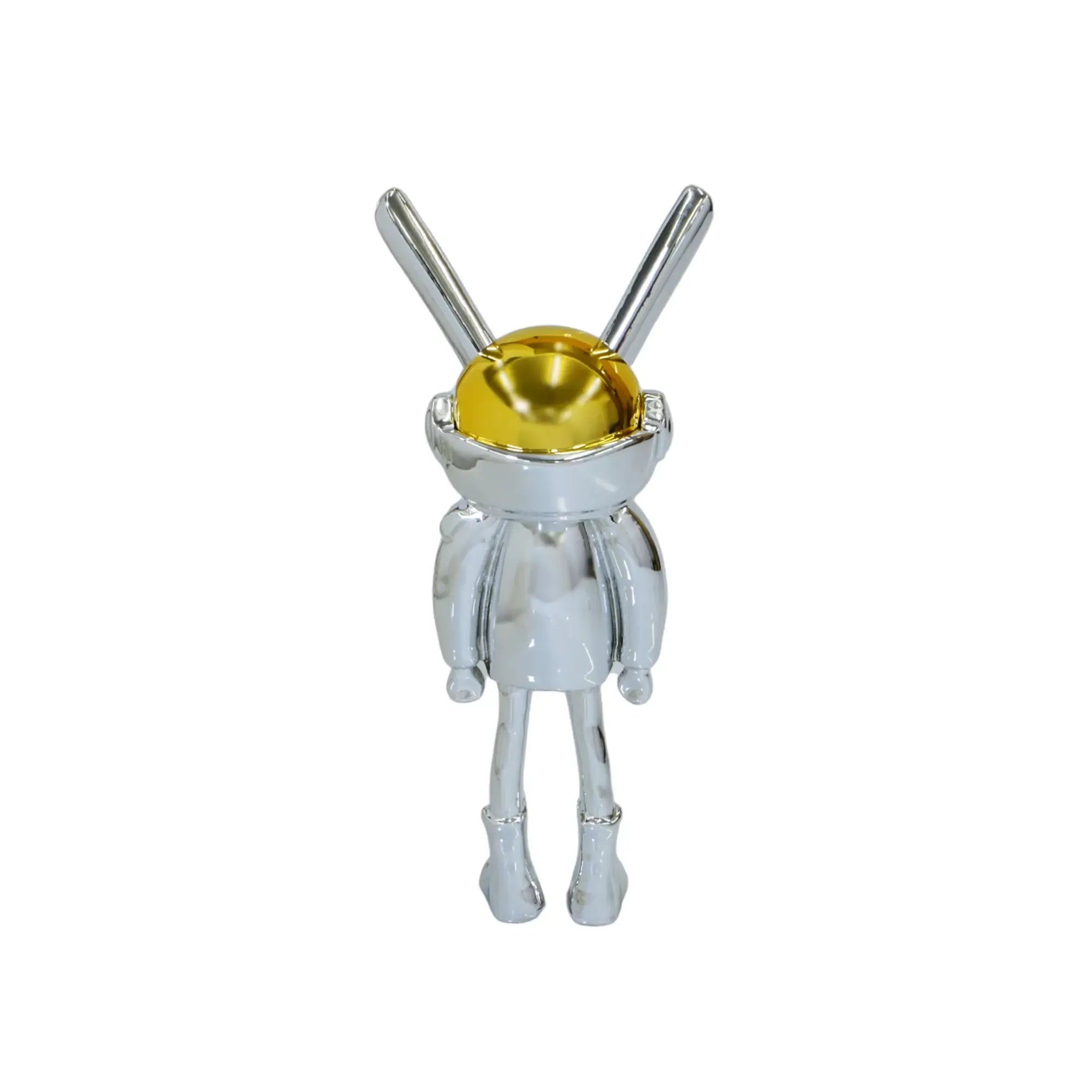 Bildmotiv & EindruckDie Figur steht aufrecht wie ein kleiner Entdecker: kompakter Torso, prägnante Stiefel, schlanke Gliedmaßen und zwei auffällige, ohrenähnliche Antennen. Die spiegelnde Oberfläche reflektiert ihre Umgebung und erzeugt je nach Lichtsituation lebendige Highlights – typisch für Pop‑Art mit spielerischer Ironie und klarer Formensprache. Das Zusammenspiel aus Silber und Gold verleiht der Skulptur eine edle, gleichzeitig augenzwinkernde Präsenz.