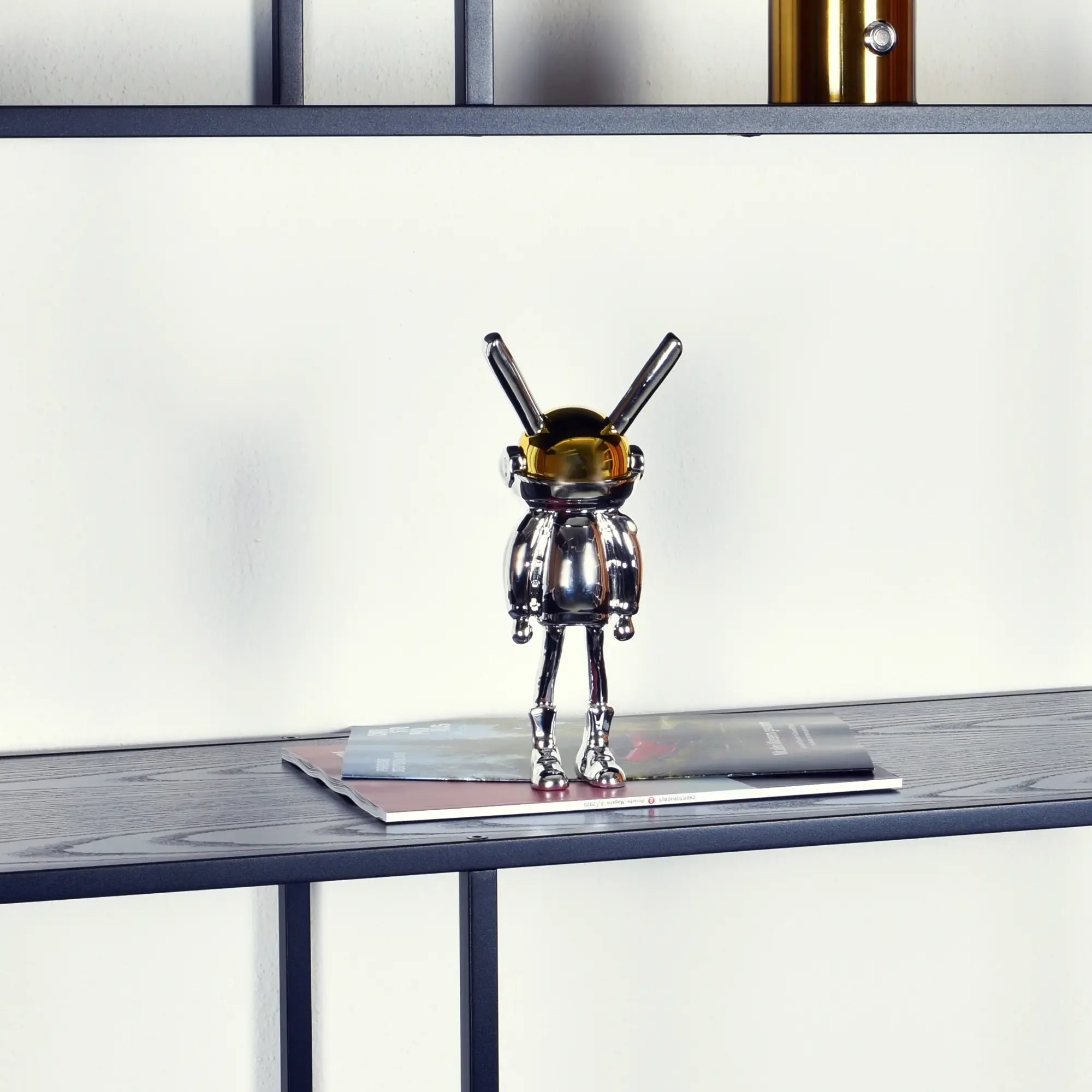 Ein modernes Statement für Technikbegeisterte und Designliebhaber. Diese Pop‑Art Skulptur interpretiert den Space‑Age-Traum als charmanten Roboter mit klaren, reduzierten Linien. Der Körper zeigt sich in hochglänzendem Spiegelsilber, der helmartige Kopf mit langgestreckten Antennen erinnert an futuristische Kommunikation – akzentuiert durch ein goldfarbenes Visier, das das Licht elegant einfängt.
