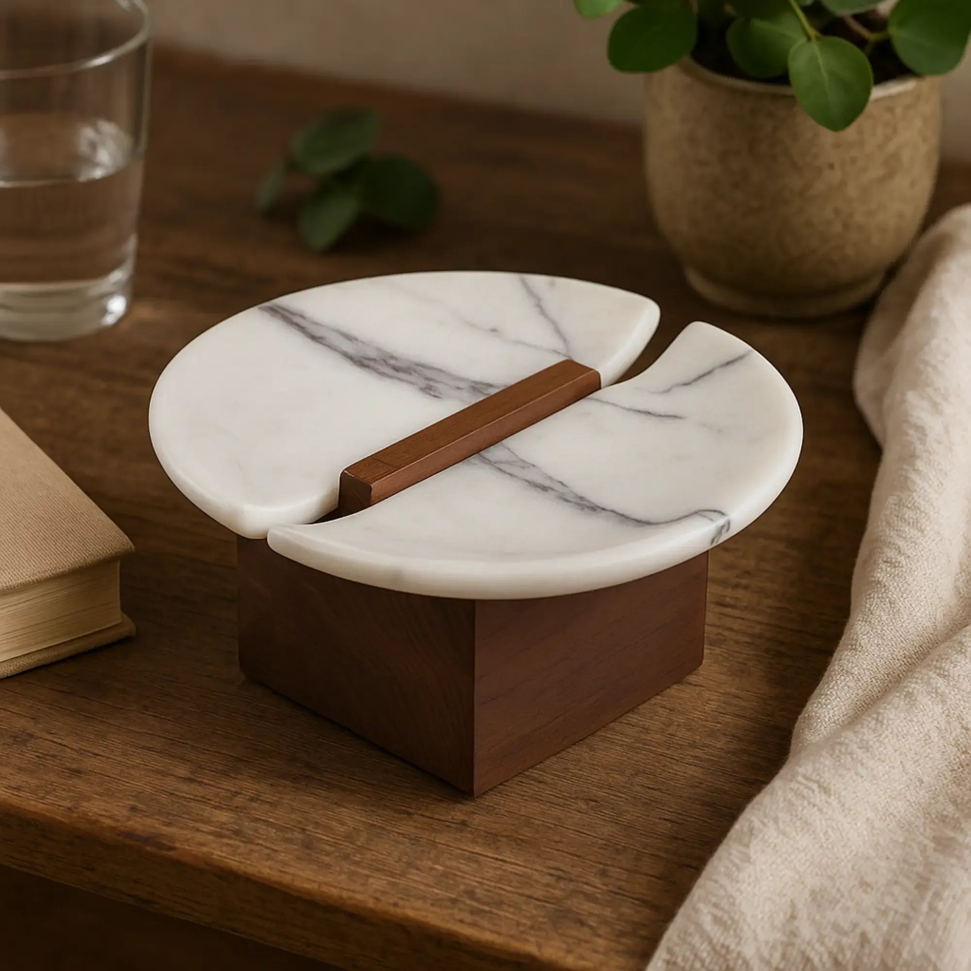 Marmorschale mit Holzgestell, Walnussholz-Design, funktionale Eleganz, modernes Wohnaccessoire, vielseitig einsetzbar für Zuhause, Hotels, Restaurants oder als hochwertiges Geschenk zur Einweihung.