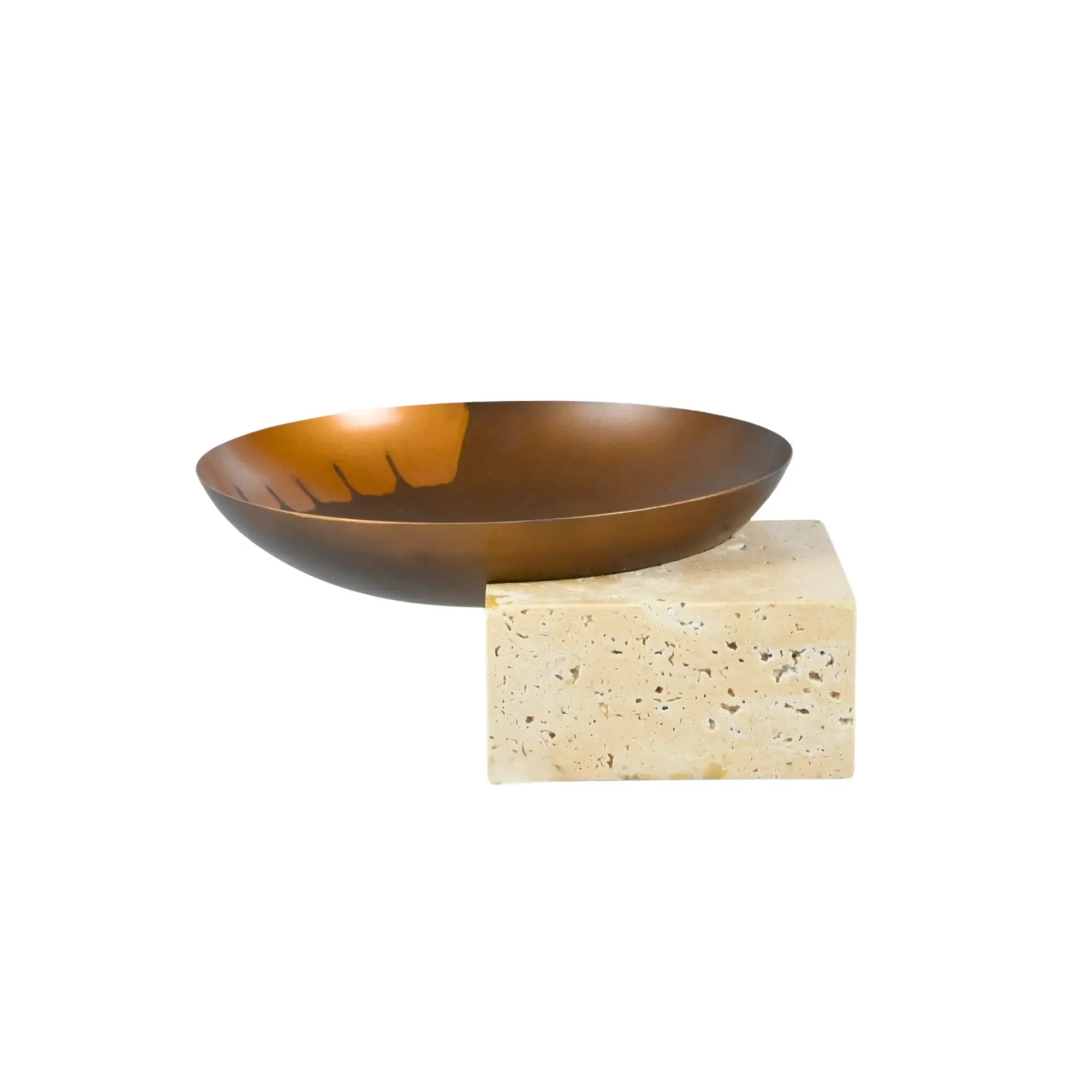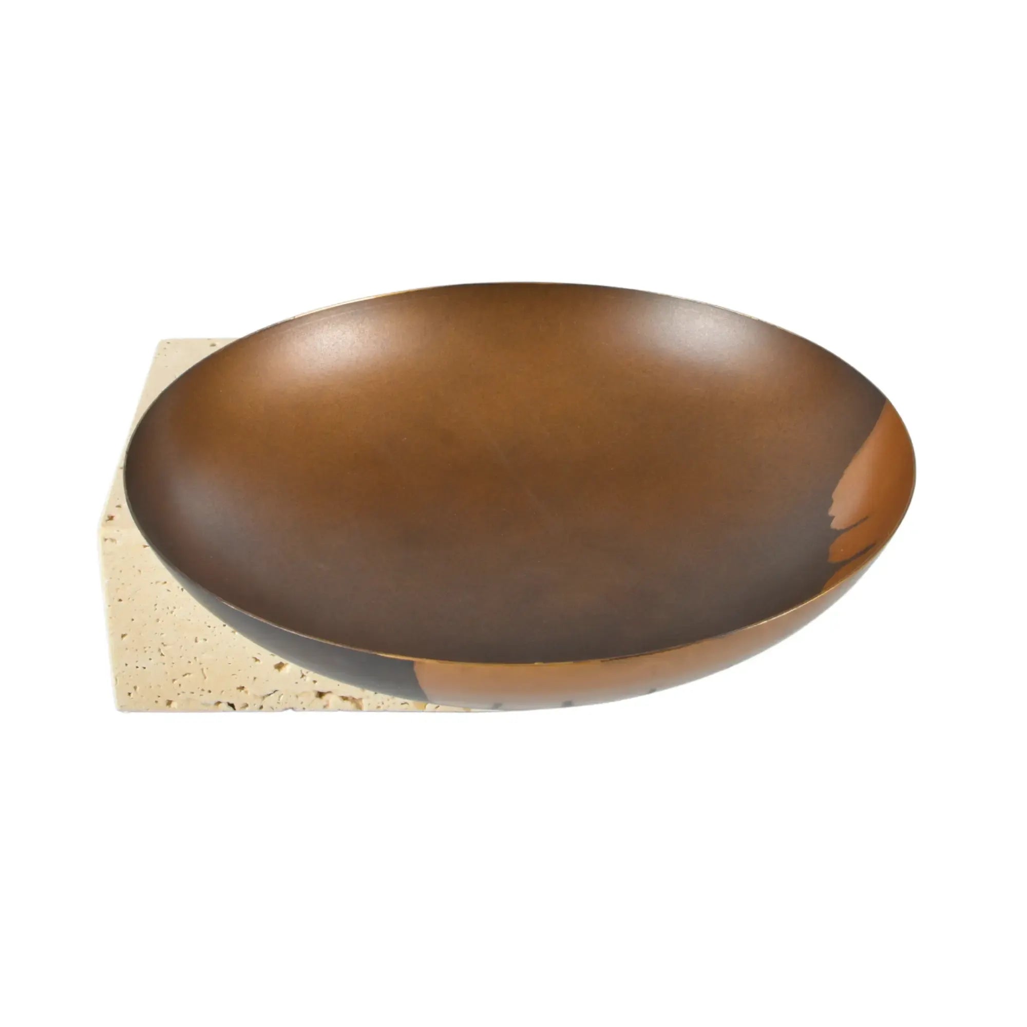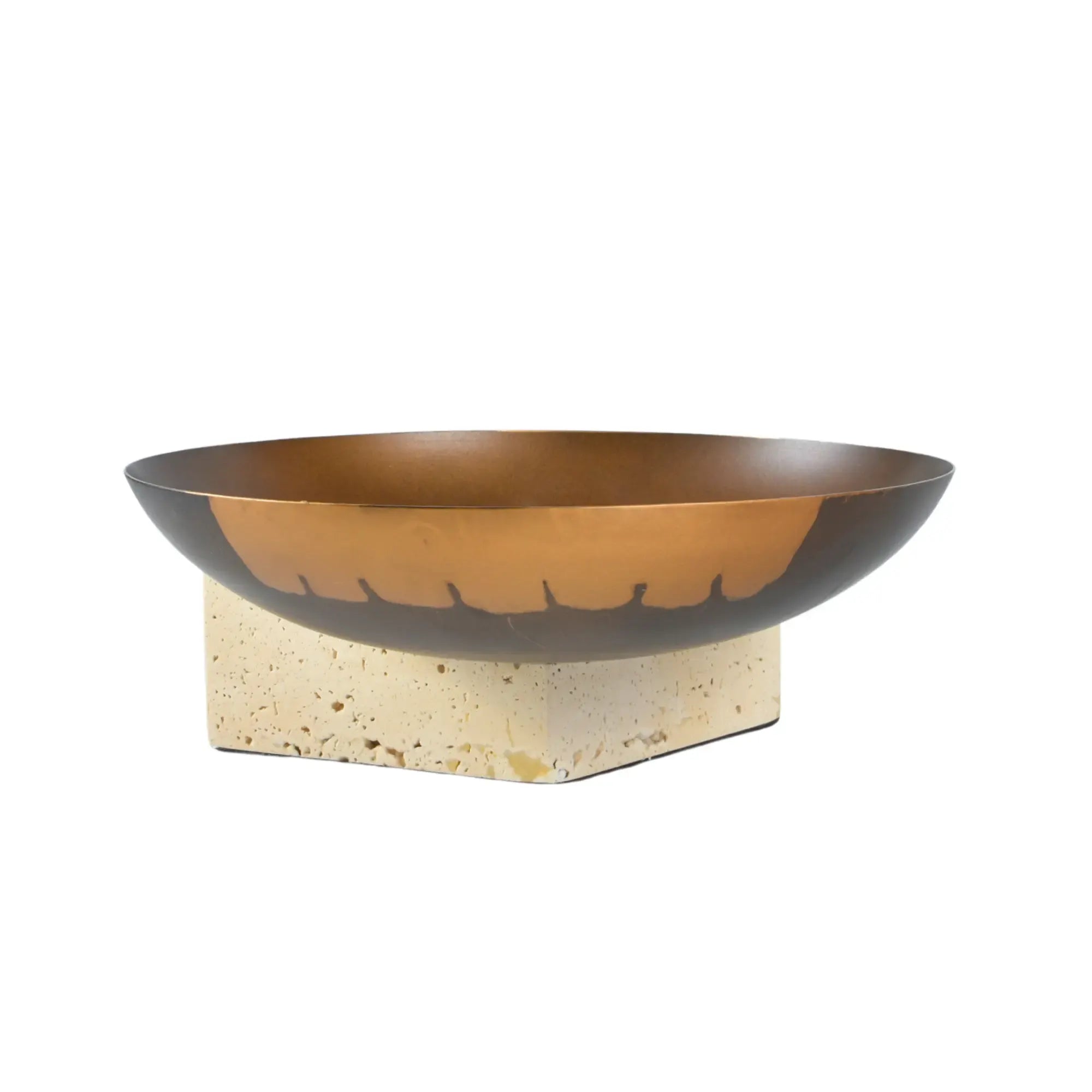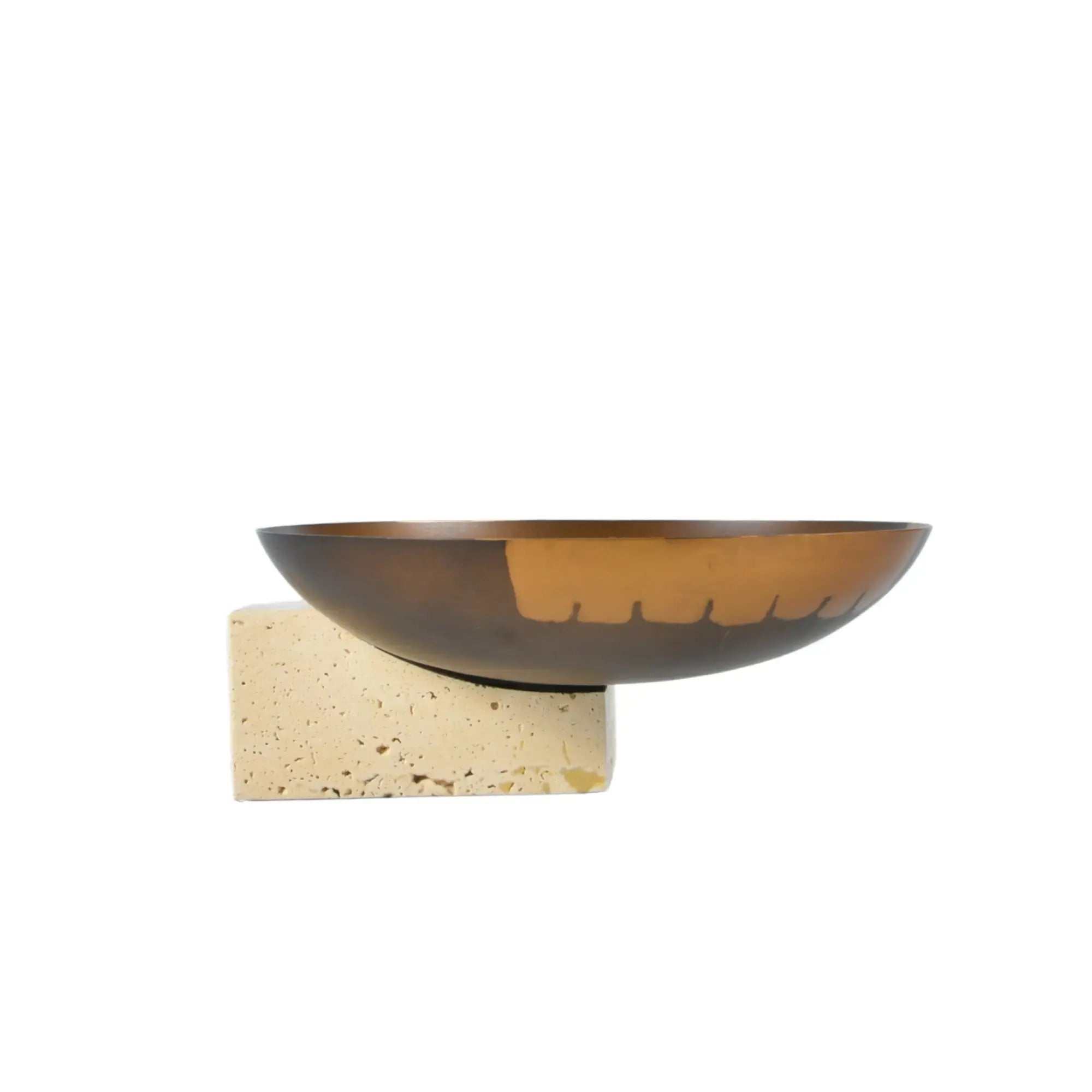 Travertin-Sockel, handbemalte Antikbronze-Schale, einzigartiges Design mit goldenen Akzenten, harmoniert mit Rundschale Romano, luxuriöses Wohnaccessoire, vielseitige Dekoideen – auch ein unikales Einweihungsgeschenk mit bleibendem Eindruck.