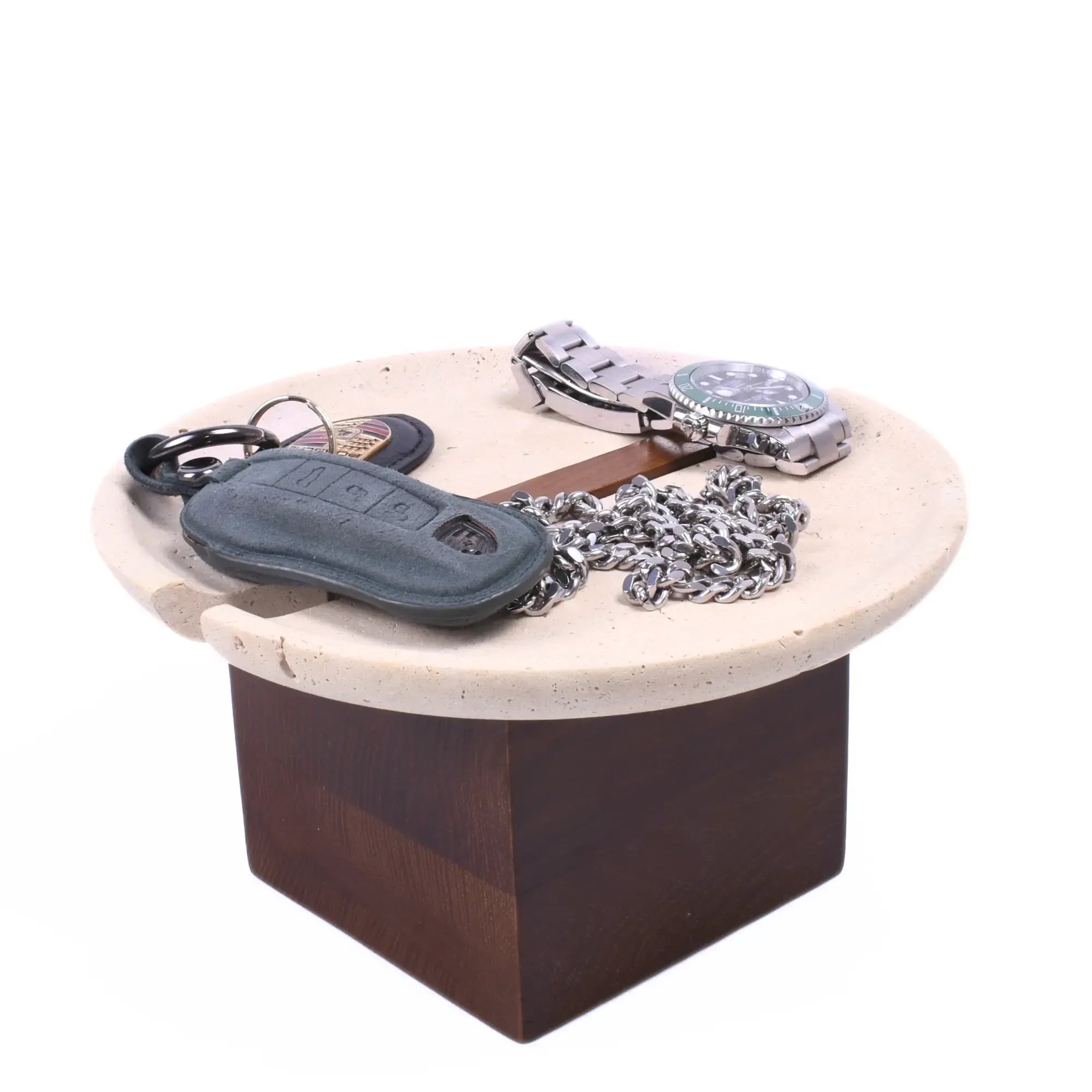Die schöne Schale aus beigem Travertin-Marmor vereint natürliche Eleganz mit zeitlosem Design. Zwei harmonisch verbundene Marmorplatten ruhen auf einem stabilen Walnussholz-Gestell in tiefem Braun, das einen edlen Kontrast setzt. Diese außergewöhnliche Schale ist ein echter Hingucker und perfekt als Ablage für Schmuck, Schlüssel oder Kleinteile sowie für Dekorationsideen mit Obst und Früchten geeignet. Sie fügt sich mühelos in jede Einrichtung ein – ob als stilvolles Dekostück in der Küche, auf dem Tisch oder im Badezimmer. Ein edles Wohnaccessoire aus Naturstein und Holz, das Ihrem Raum eine gehobene Atmosphäre verleiht. Die Kombination aus Travertin und Walnuss macht sie zu einem eleganten Highlight – ideal auch als Geschenk für Designliebhaber.