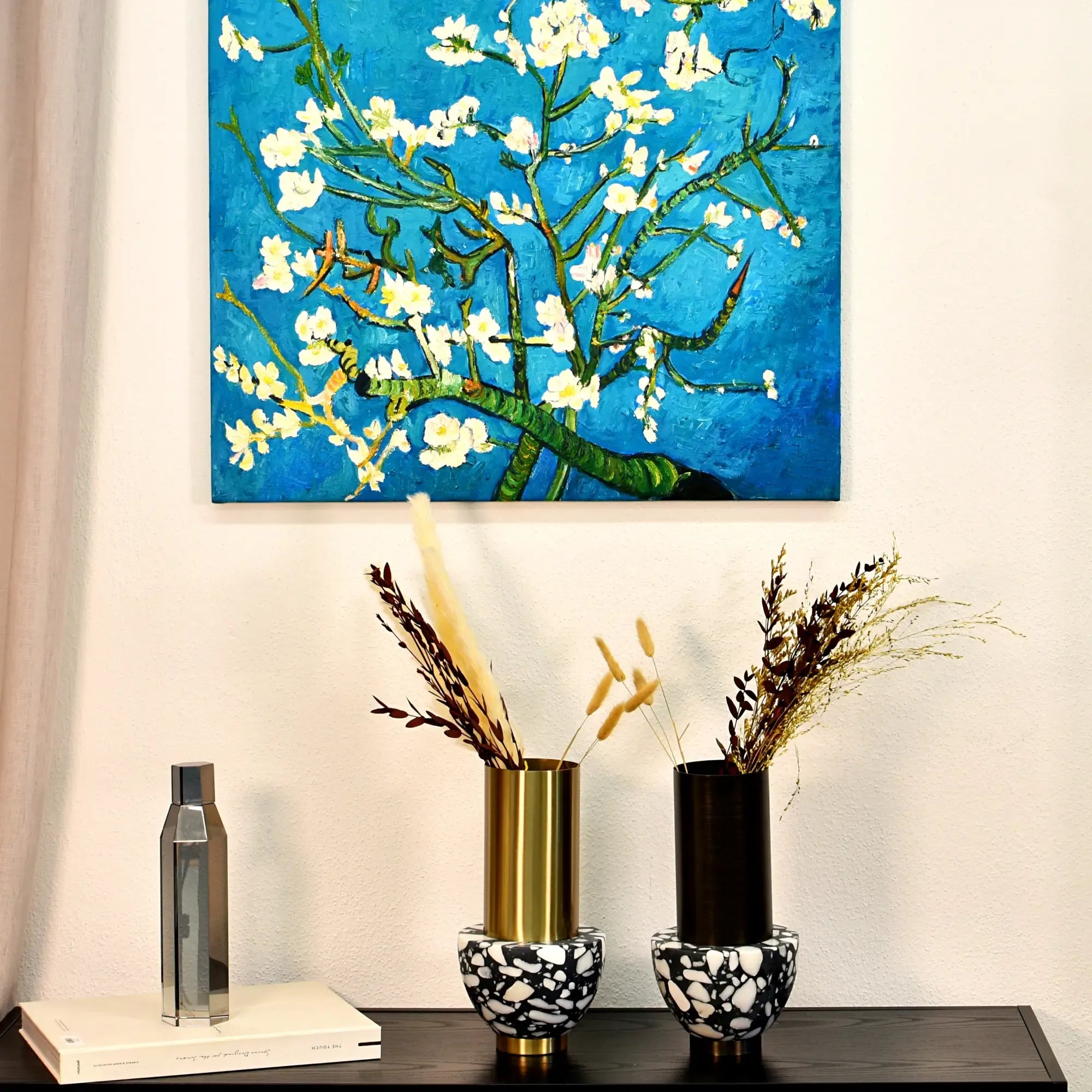 Die Vase „Noble“ beeindruckt mit ihrer Kombination aus massivem Marmorsockel im Terrazzo-Look und einem elegant gebürsteten Edelstahl-Zylinder in Schwarz oder Gold. Dank ihres hohen Gewichts ist sie besonders standfest und auch für den Außenbereich geeignet, etwa auf Terrassen, Balkonen oder Hauseingängen. Ob mit Trockenblumen, frischen Schnittblumen oder ganz puristisch ohne Inhalt – diese schwere Designvase wirkt immer als dekorative Skulptur. Ihre Form erlaubt vielfältige Dekorationsideen, sei es im Wohnzimmer, Schlafzimmer oder im Gartenbereich. Durch das Zusammenspiel von glänzendem Metall und strukturreichem Marmor wird „Noble“ zur stilvollen Vase für innen und außen, die sowohl moderne als auch klassische Wohnstile aufwertet. Ein besonderes Geschenk für designliebende Frauen oder Männer – zeitlos, luxuriös und langlebig.