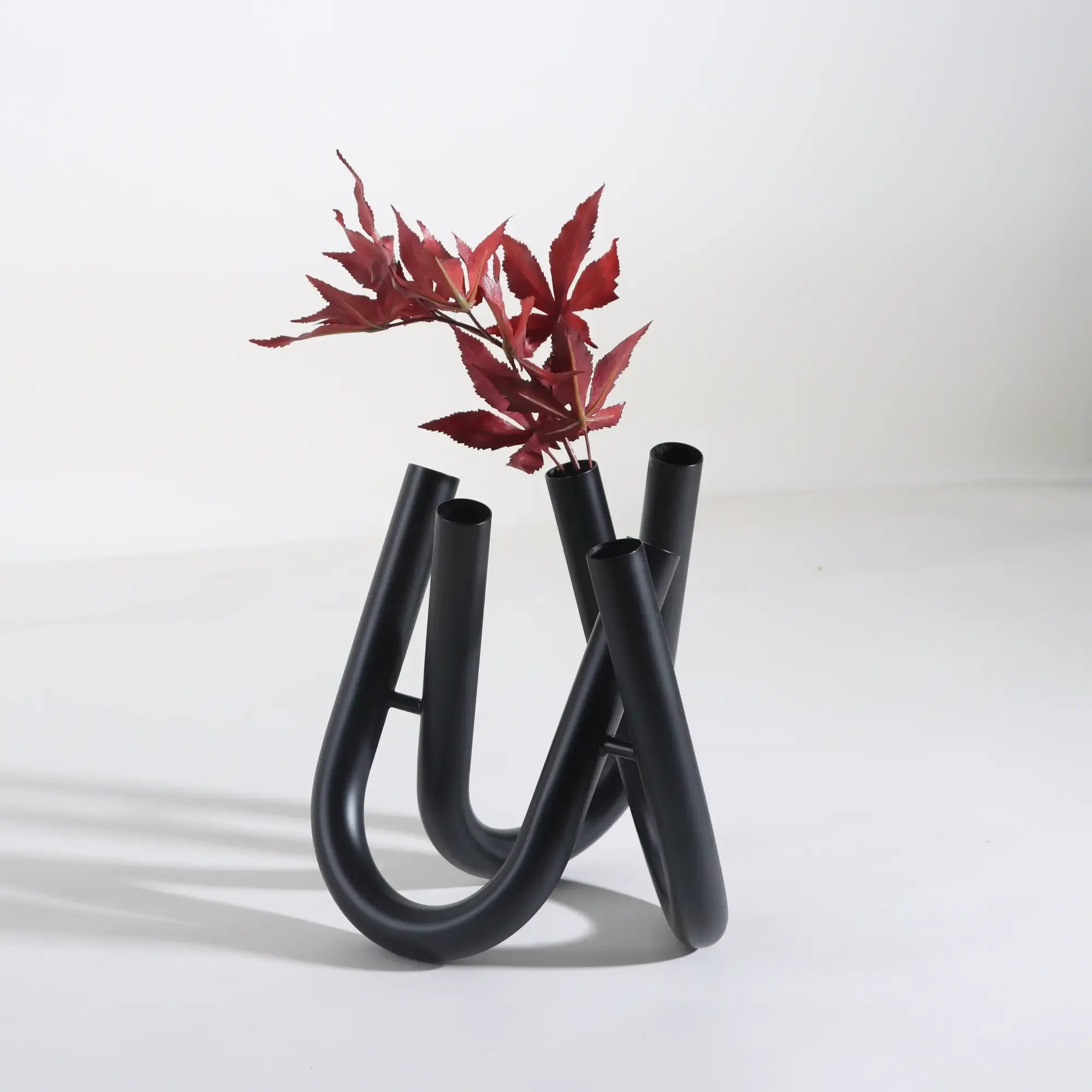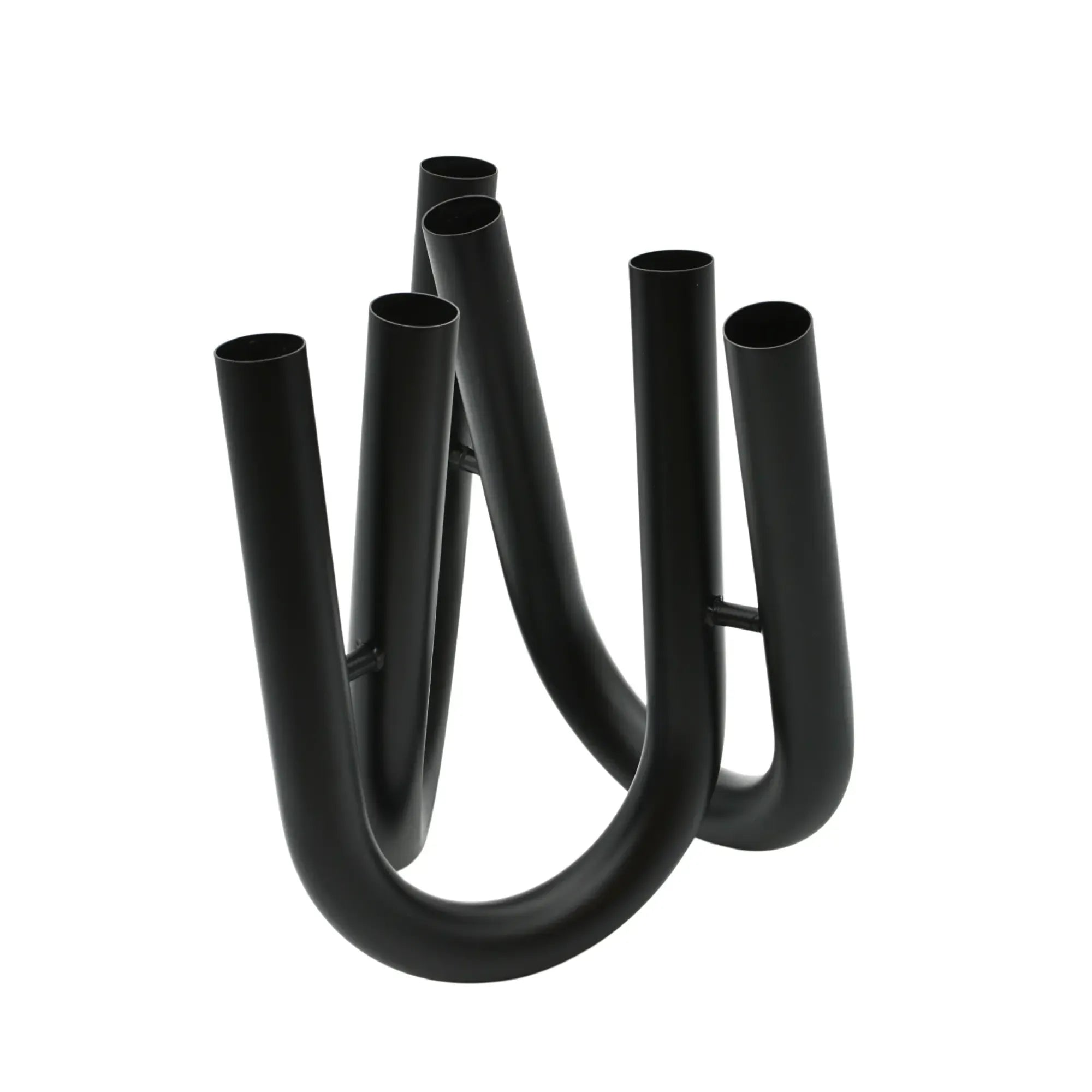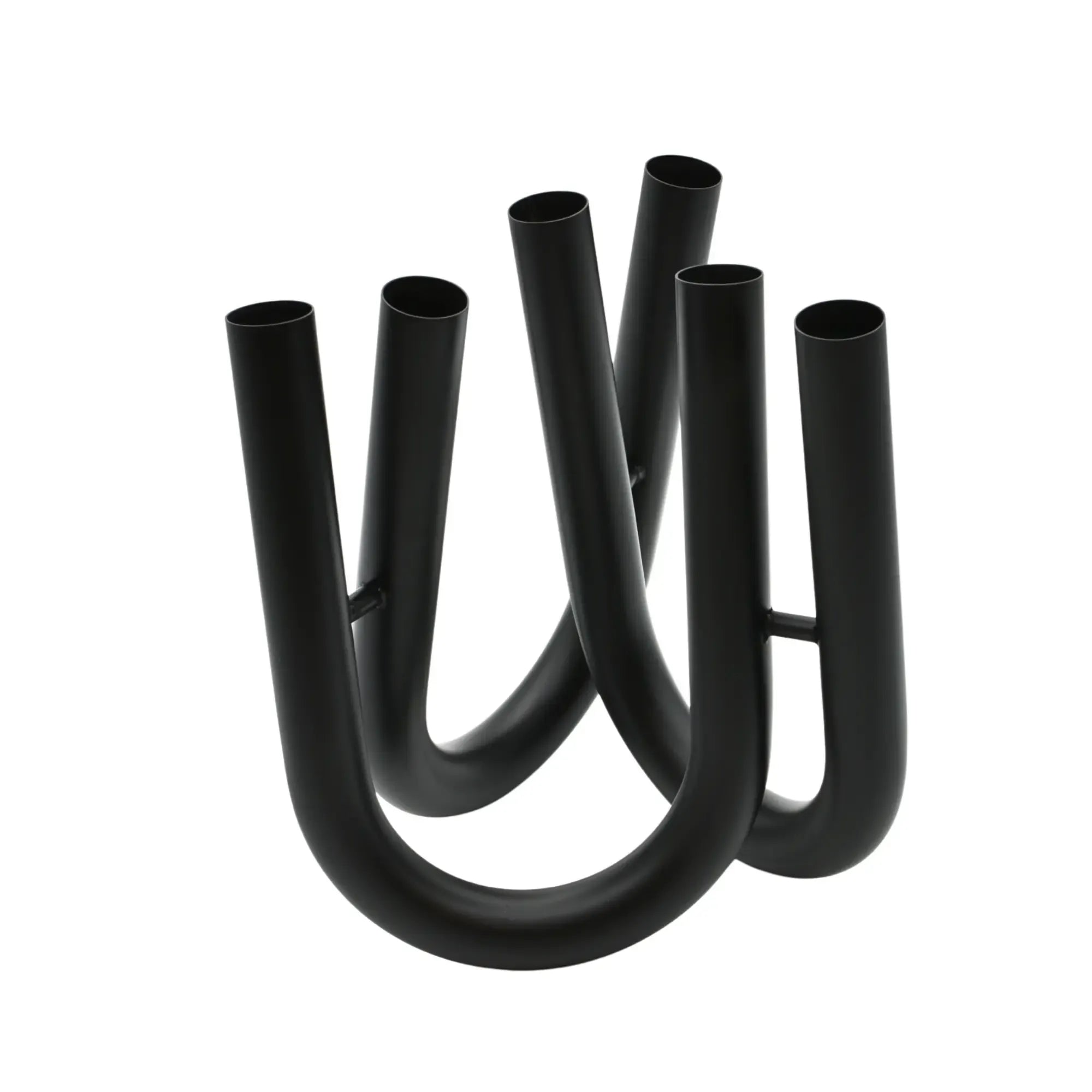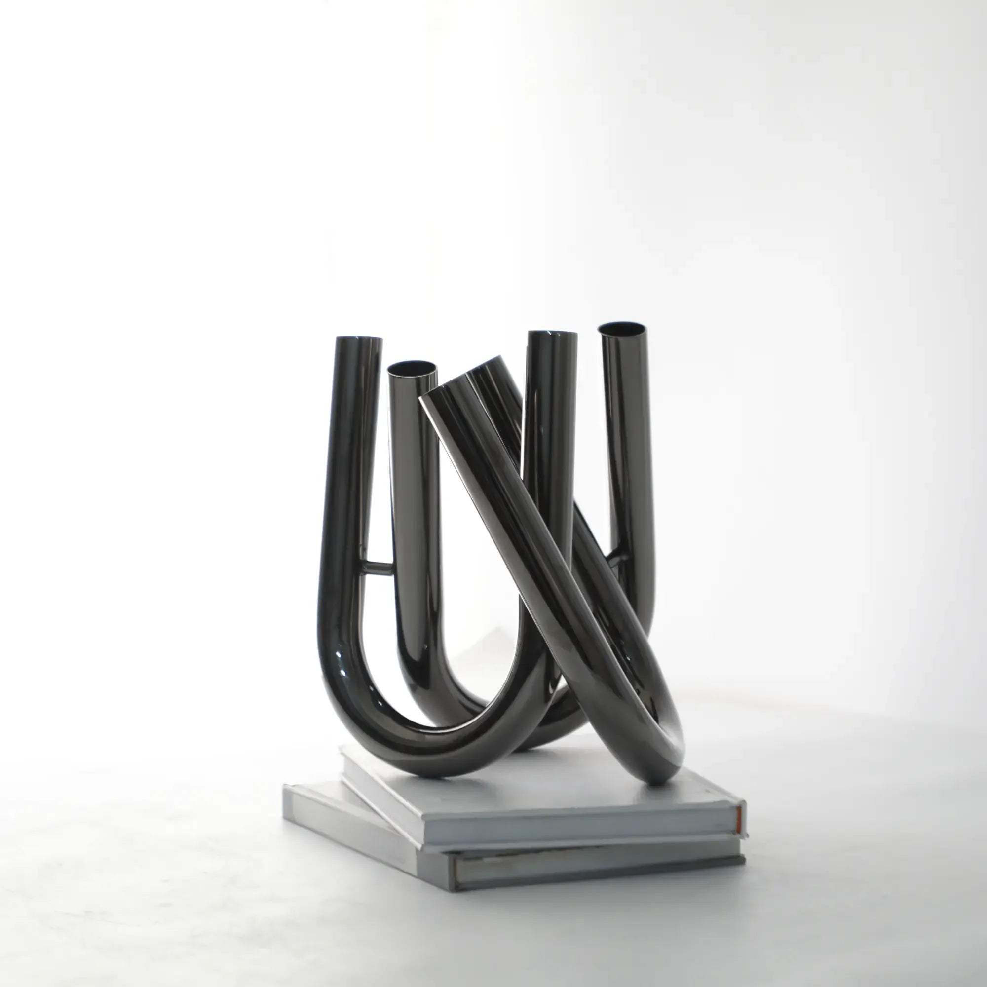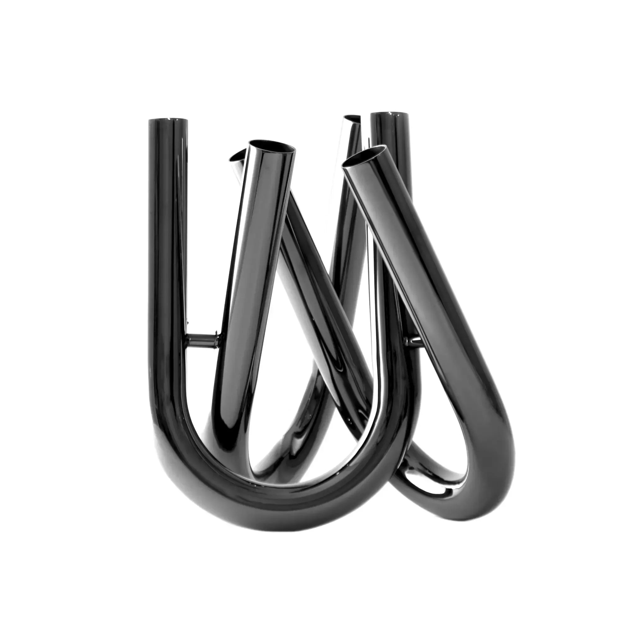 Drei elegant geschwungene, U-förmige Röhrenarme bilden eine skulpturale Vase mit sechs Öffnungen, die kreative Freiheit bei der floralen Gestaltung bieten – auch ganz ohne Blumen ein Designobjekt mit starker Präsenz.