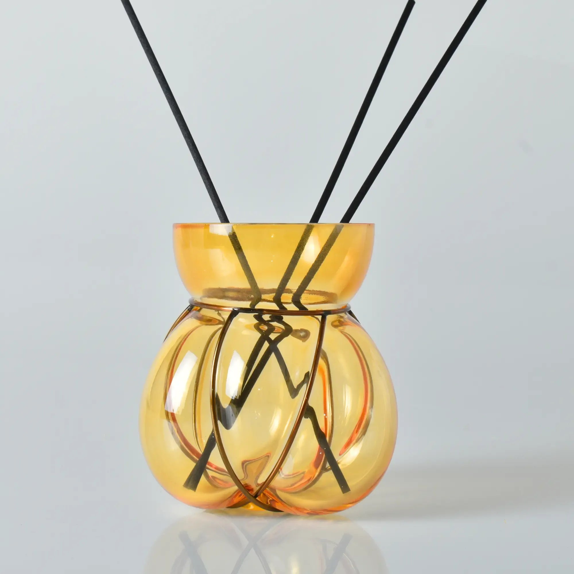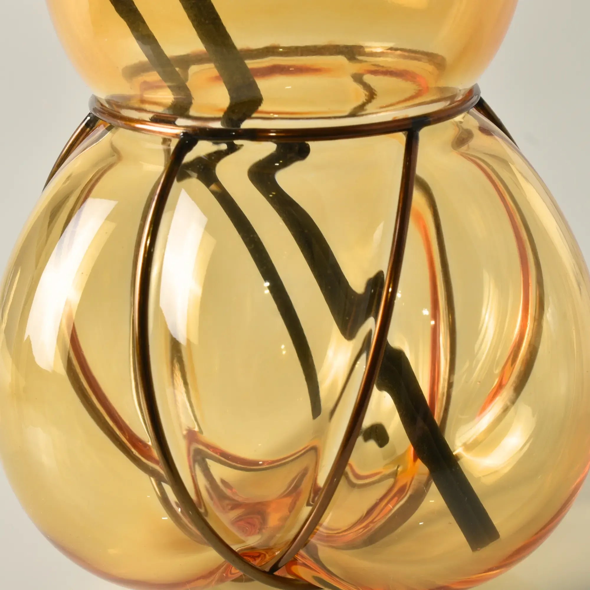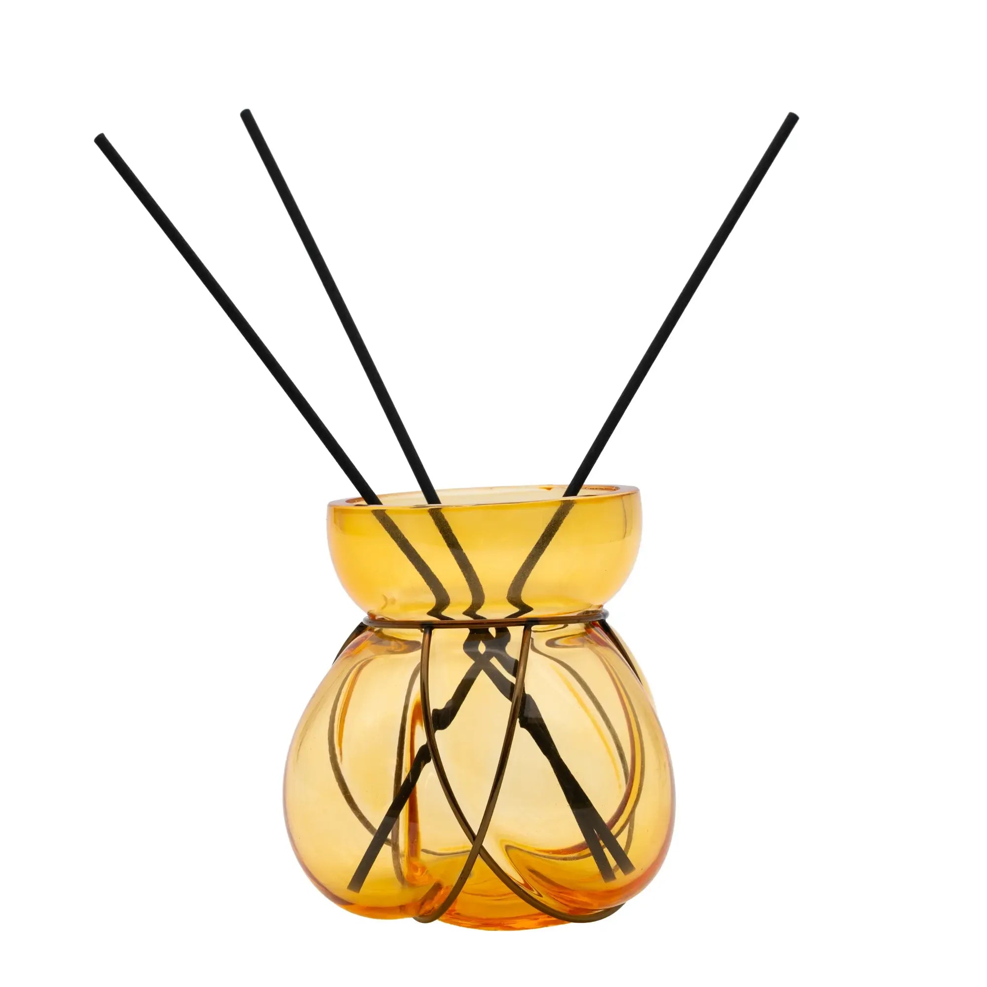 Große Duftvase aus bernsteinfarbenem Glas, akzentuiert mit einer feinen Metallumrandung – modern, elegant und hochwertig verarbeitet.