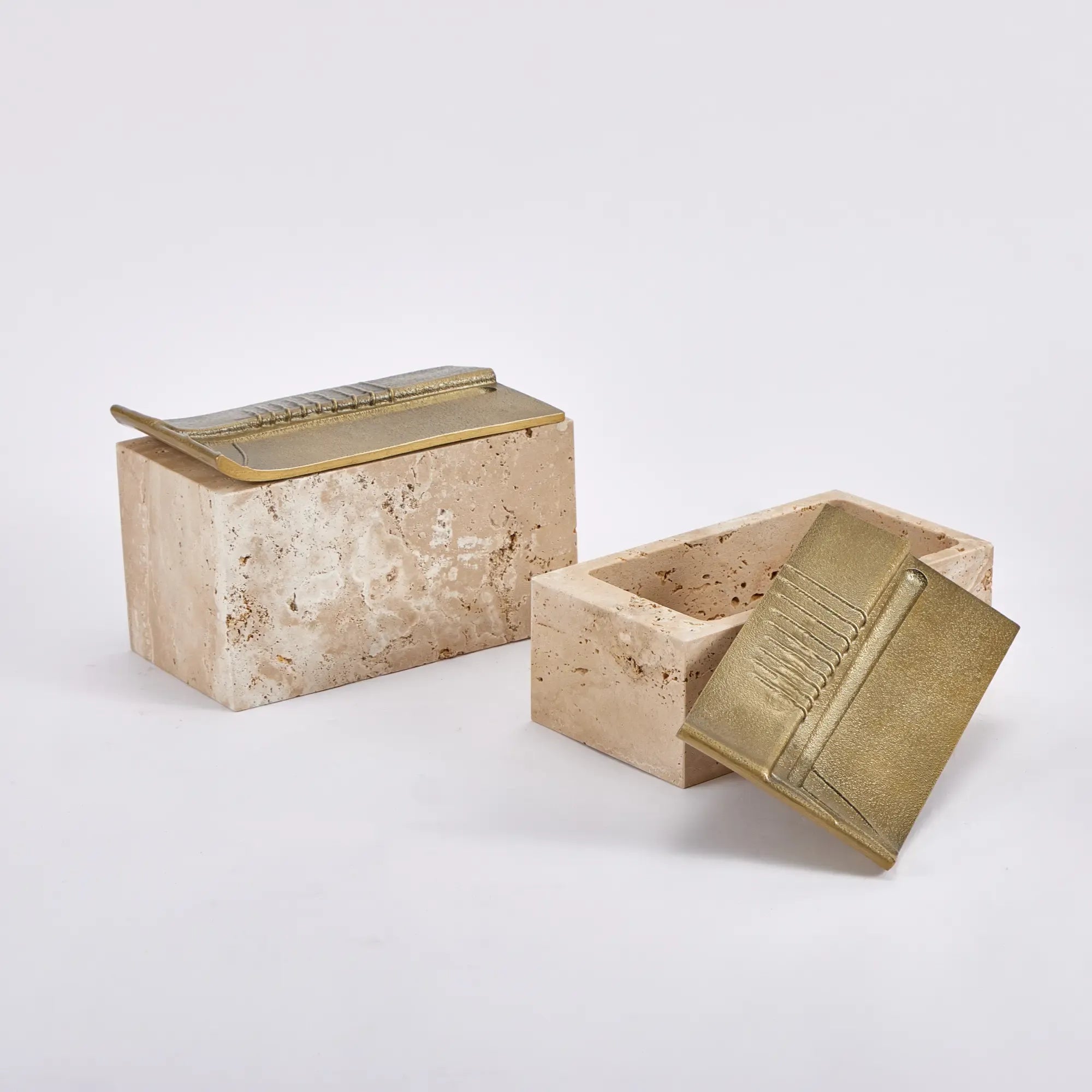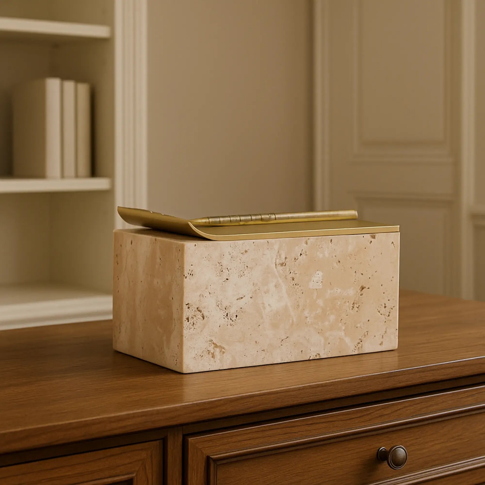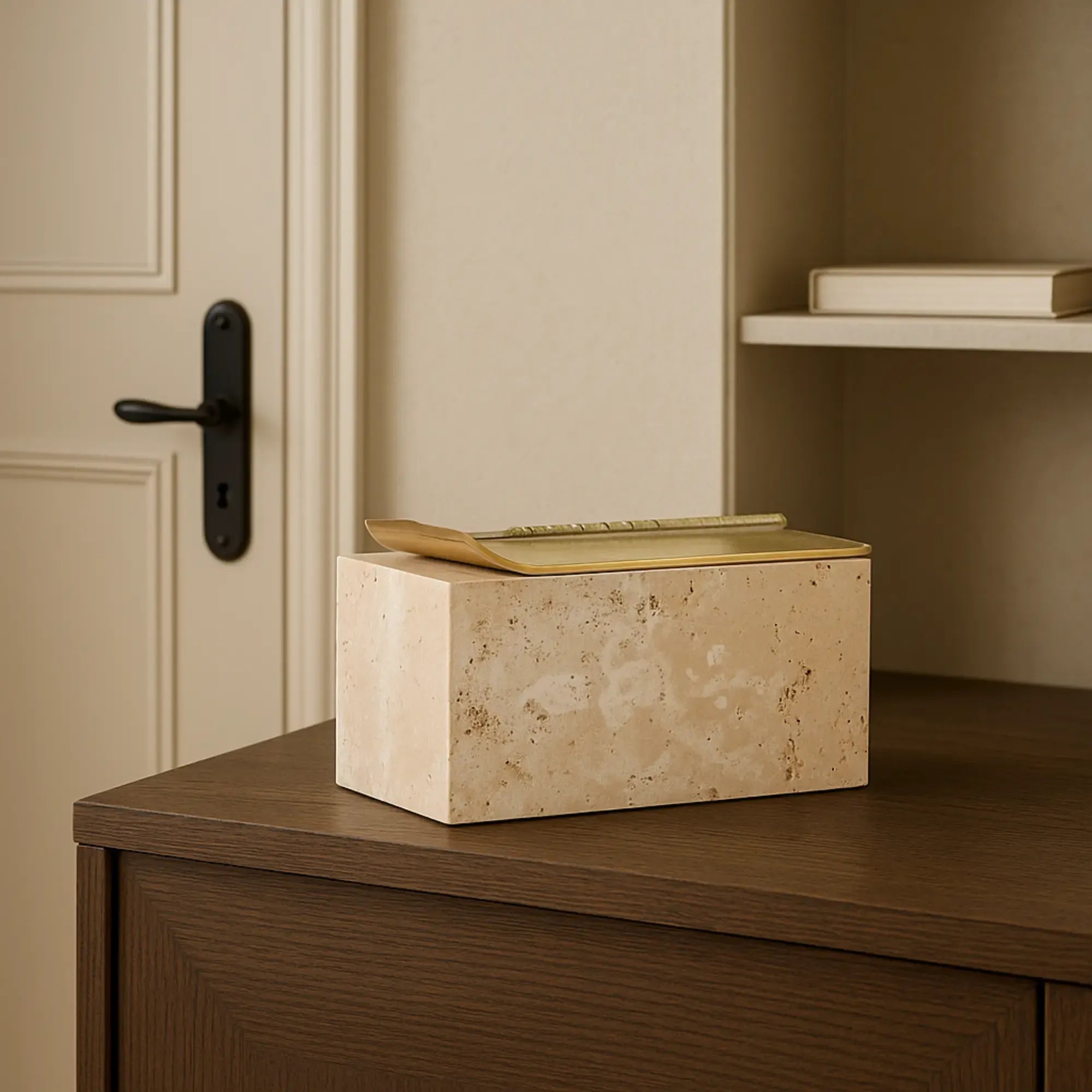 Aufbewahrungsbox - Arca Antiquum Edelstahl & Travertin, Gold & Beige, gross und robust, vom stil Elegant & Minimalistisch & Zeitlos