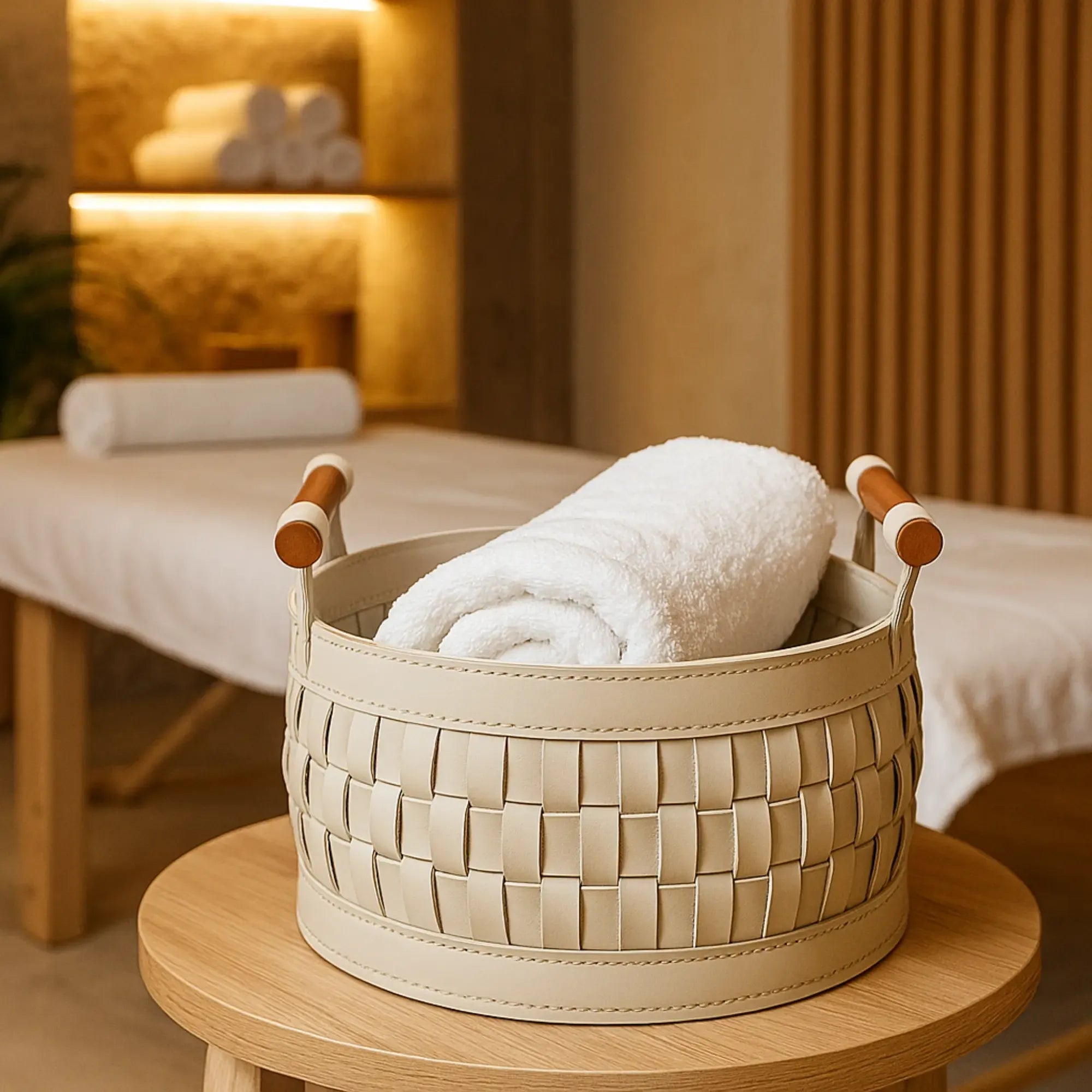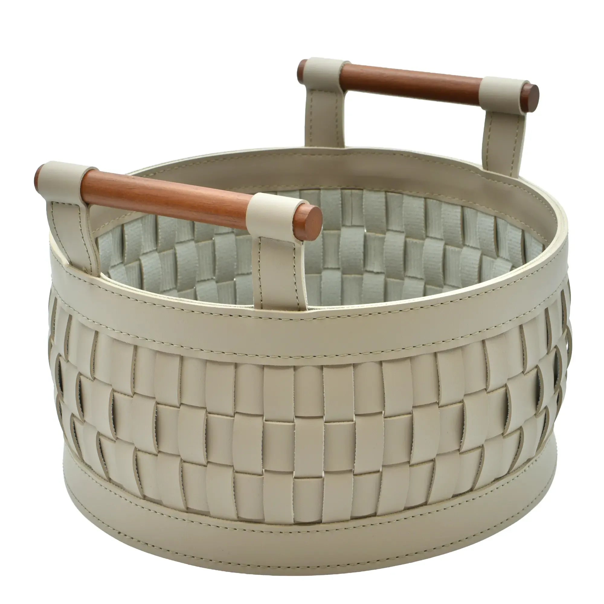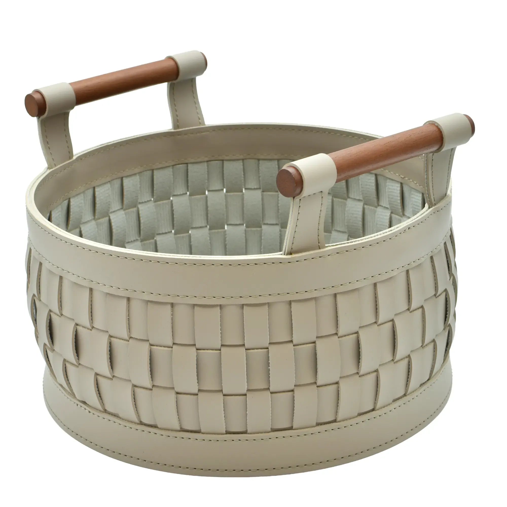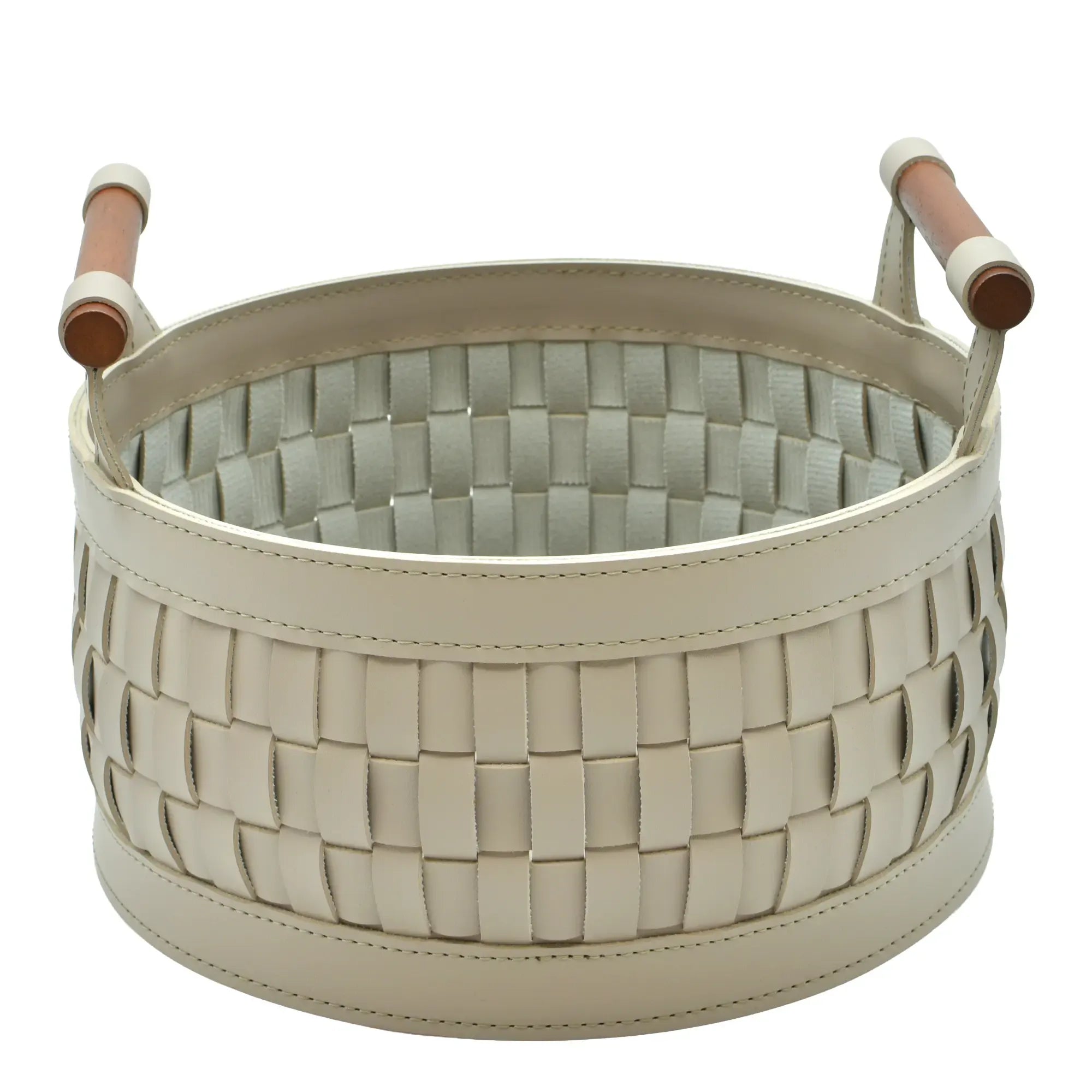 Skulpturaler Lederkorb in runder Architektur, gefertigt aus präzise geflochtenen Lederbändern mit sauber eingefasstem Rand. Das elfenbeinfarbene Material zeigt eine ruhige, matte Textur; zylindrische Holzgriffe setzen einen warmen Kontrast und bieten sichere Führung. Eine feste Bodenscheibe stabilisiert die Form, innen schützt ein textiles Trägermaterial. Als ästhetisches Aufbewahrungsobjekt verbindet der Korb weiche Haptik und klare Geometrie zu einem geordneten, zugleich wohnlich wirkenden Gefäß für Alltagsdinge.