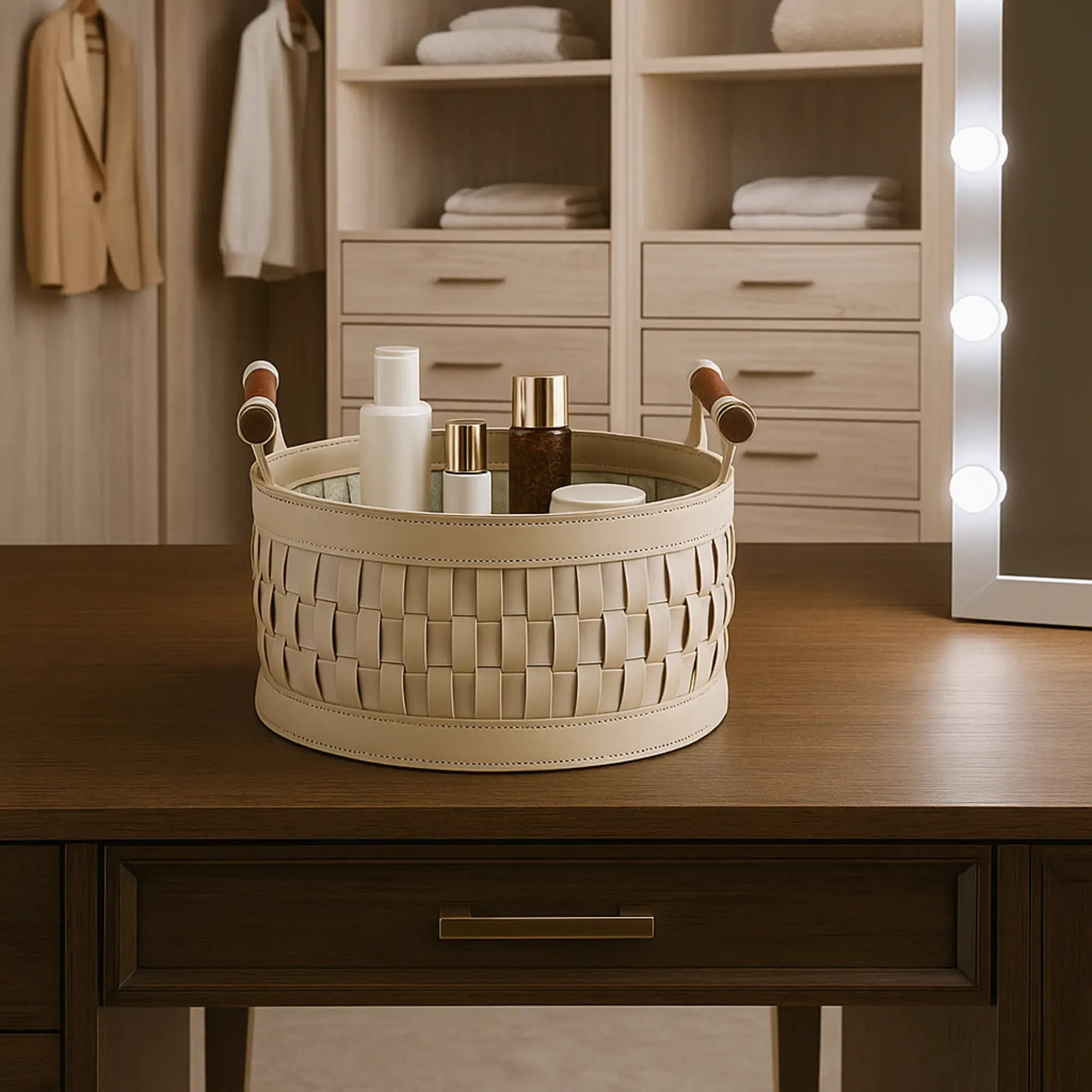 Andere Bezeichnungen und Eigenschaften: Aufbewahrungskorb, Lederkorb, Ablagekorb, Rundkorb, Kosmetikkorb