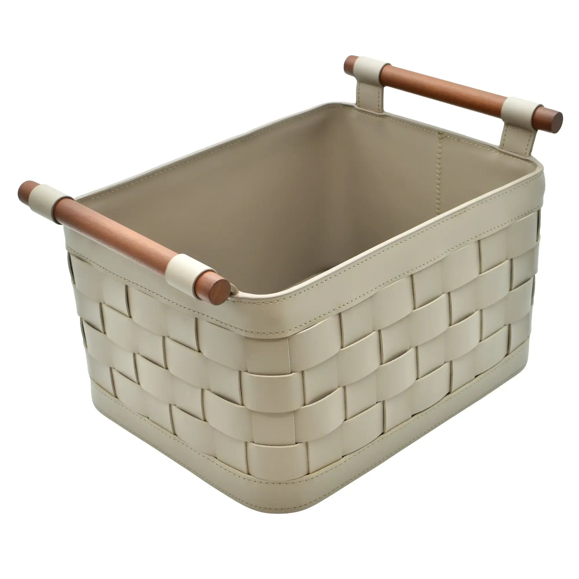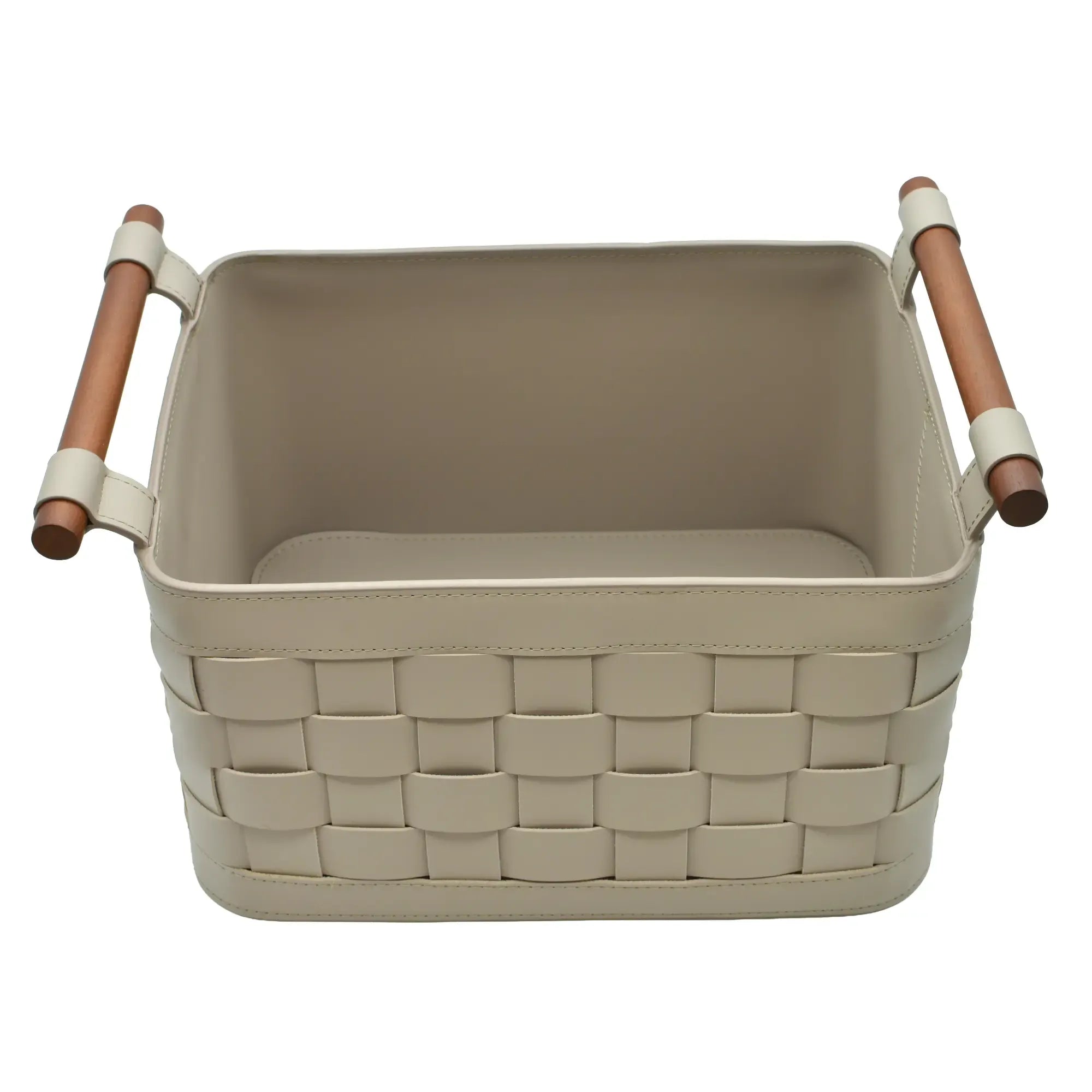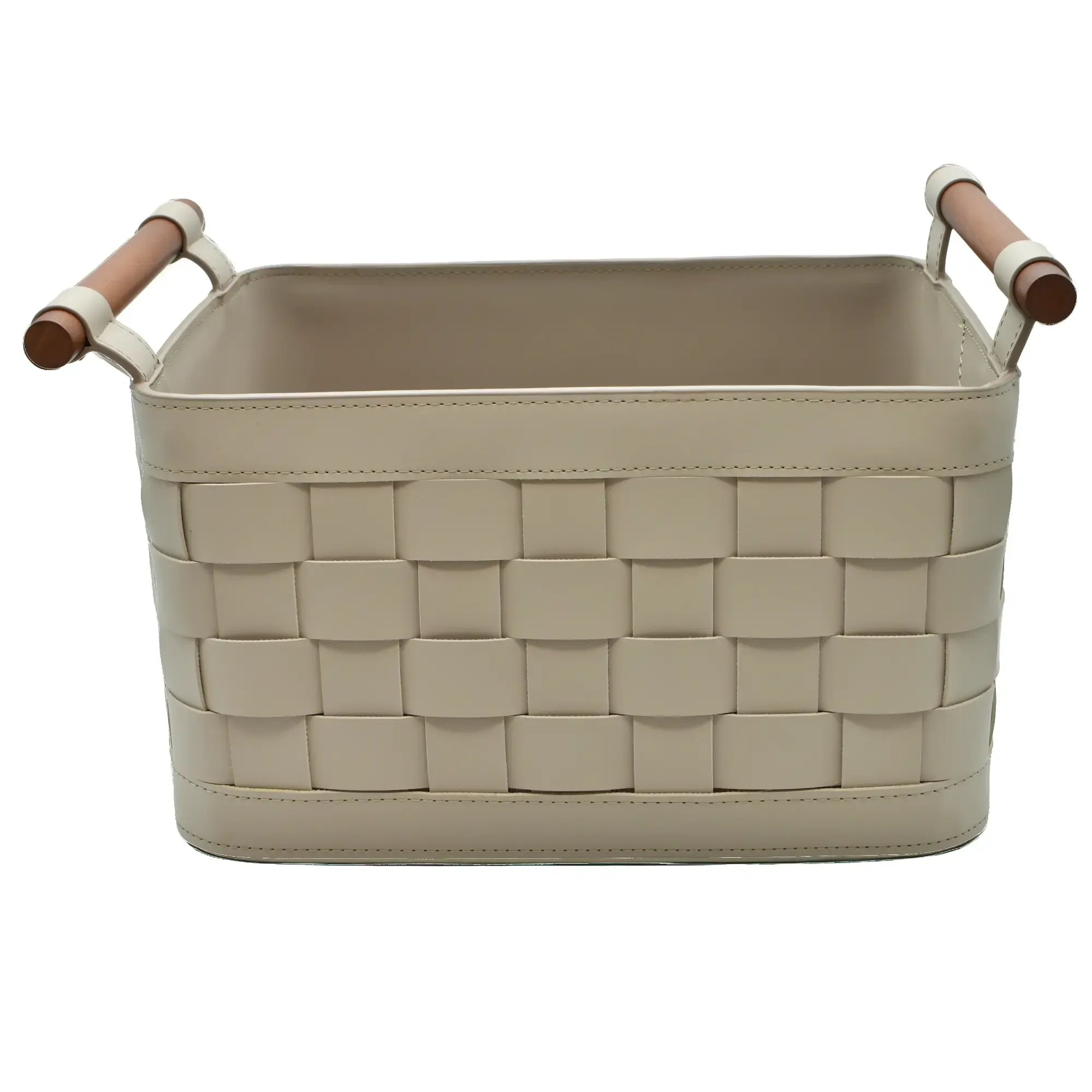 Aufbewahrungskorb - Kunstlederkorb Geflochtener Aufbewahrungs-Organizer mit Holzgriffen Handtuchablage – Panier Aurea Kunstleder, Hellgrau, gross und robust, im Stil: Modern, Elegant, Zeitlos