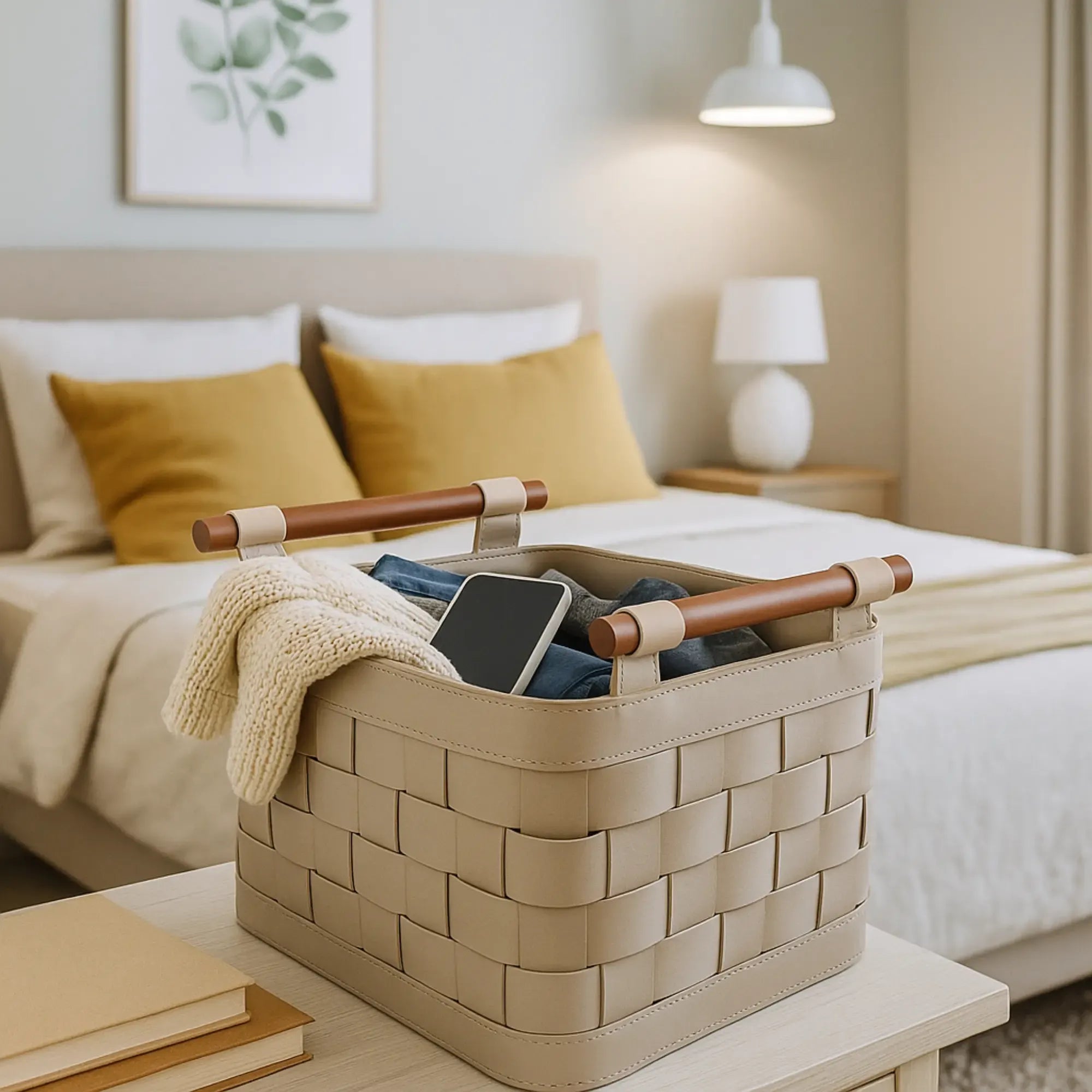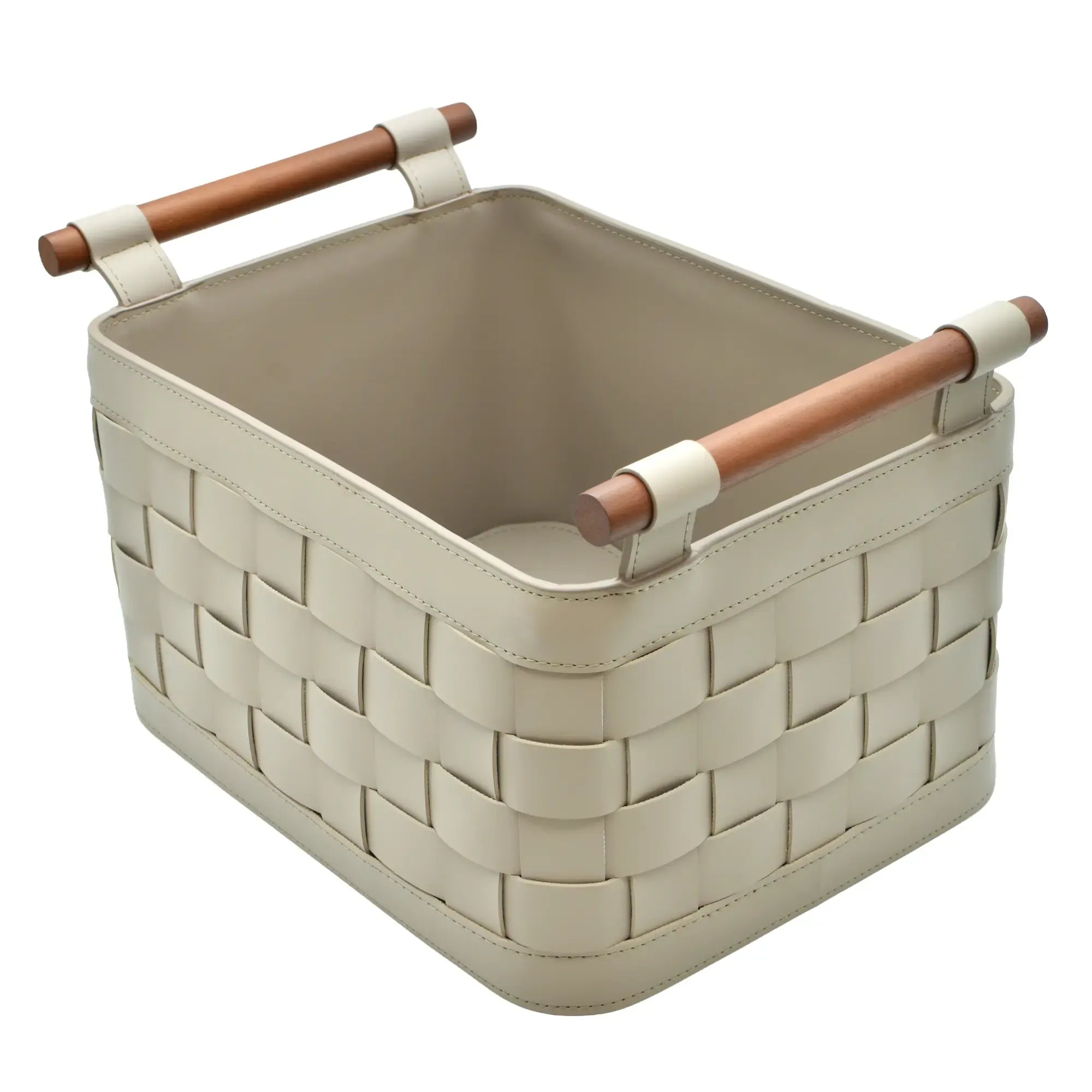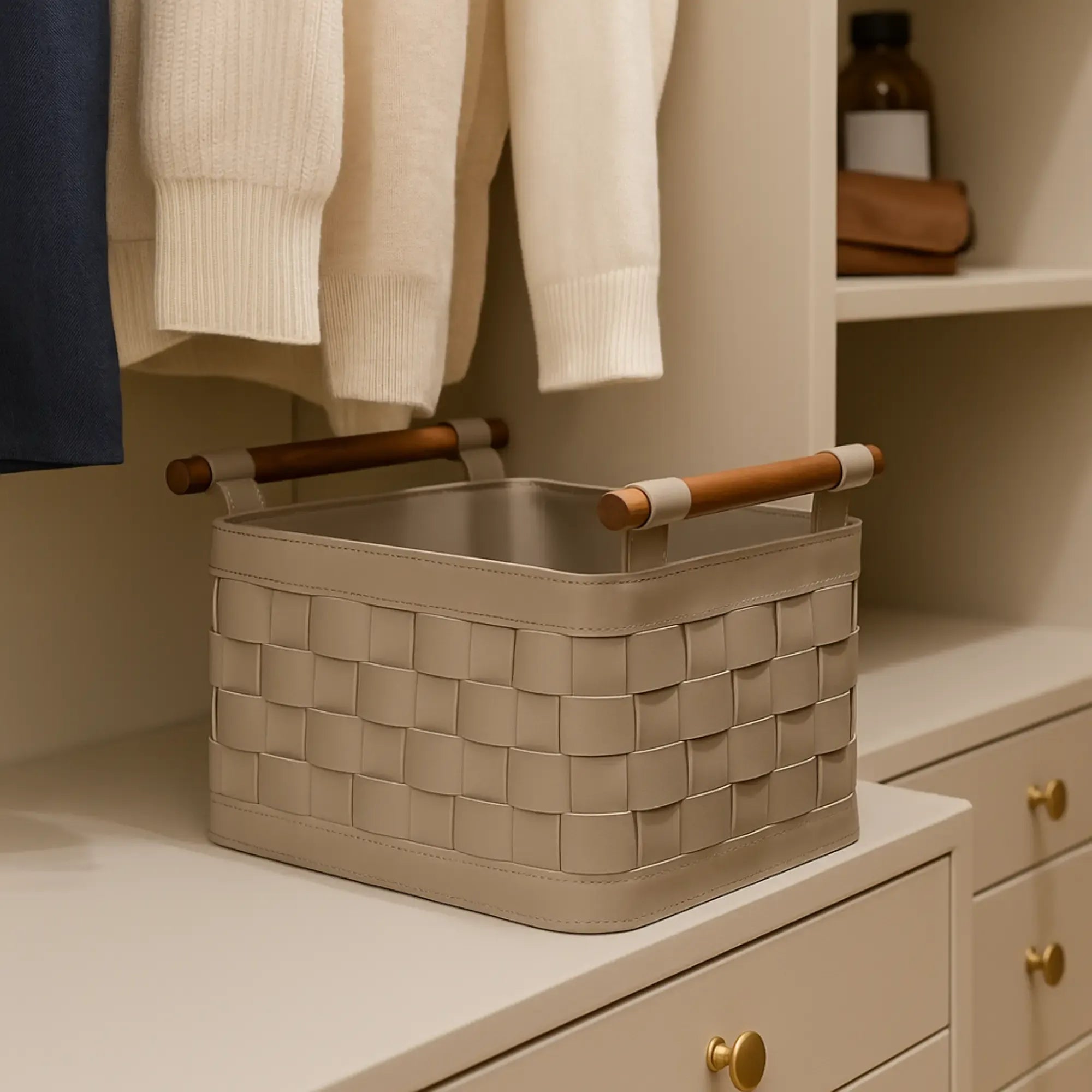 Aufbewahrungskorb - Kunstlederkorb Geflochtener Aufbewahrungs-Organizer mit Holzgriffen Handtuchablage – Panier Aurea Kunstleder, Hellgrau, gross und robust, im Stil: Modern, Elegant, Zeitlos