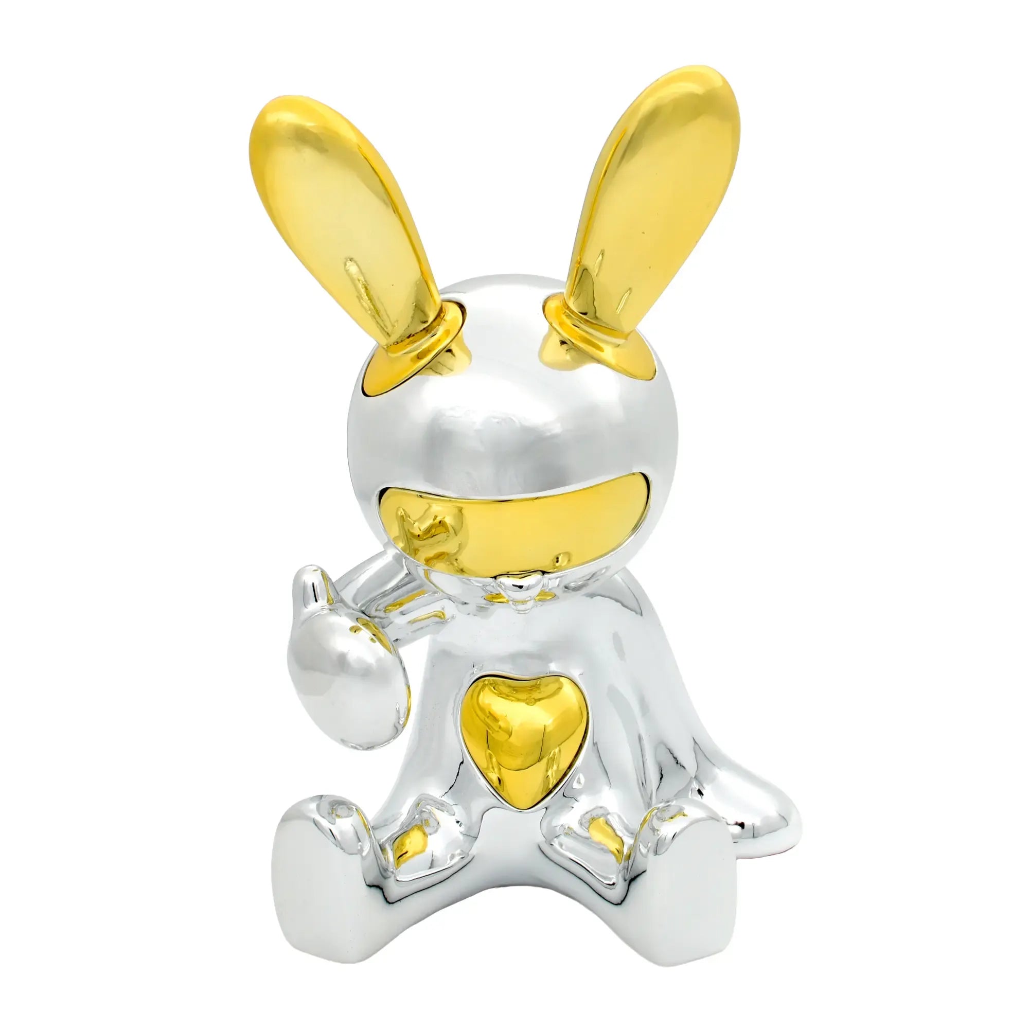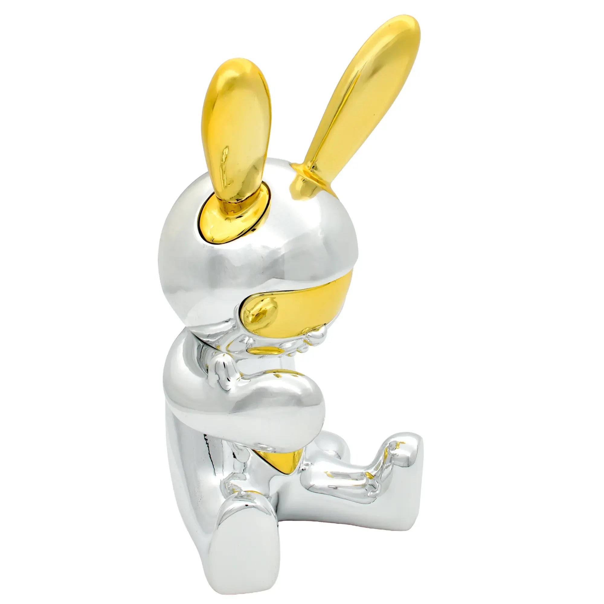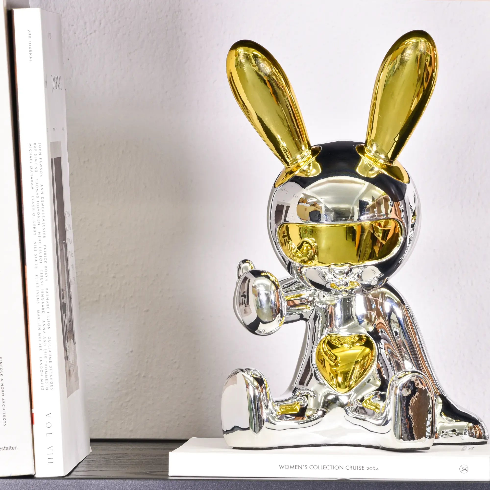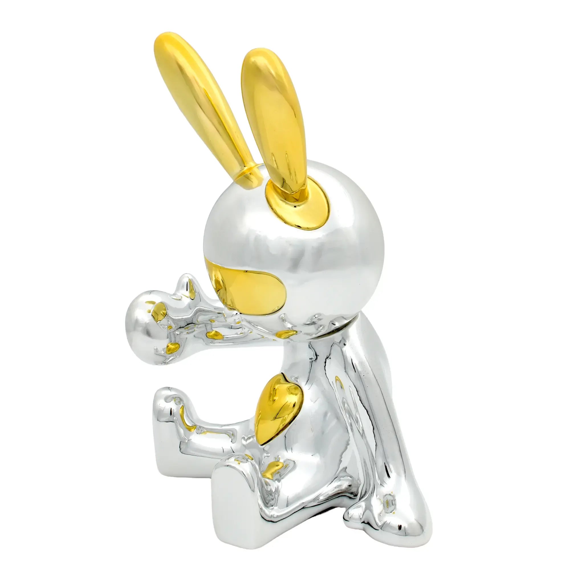 Diese Skulptur als glänzendes Designobjekt zeigt eine sitzende Hasenfigur mit visierartigem Gesicht und Herzdetail. Aus hochwertigem Kunstharz in Handarbeit geformt, fein verschliffen und mit spiegelndem Chromsilber-Finish veredelt; Ohren, Visier und Akzente in Gold setzen klare Kontraste. Weiche Volumen, präzise Rundungen und die ruhige Haltung verleihen der Dekoration eine zeitgenössische, futuristische Ruhe. Die Formensprache knüpft an Designer-Toys und populäre Cartoon-Hasen an – ausdrücklich als freie, eigenständige Interpretation ohne Lizenz.