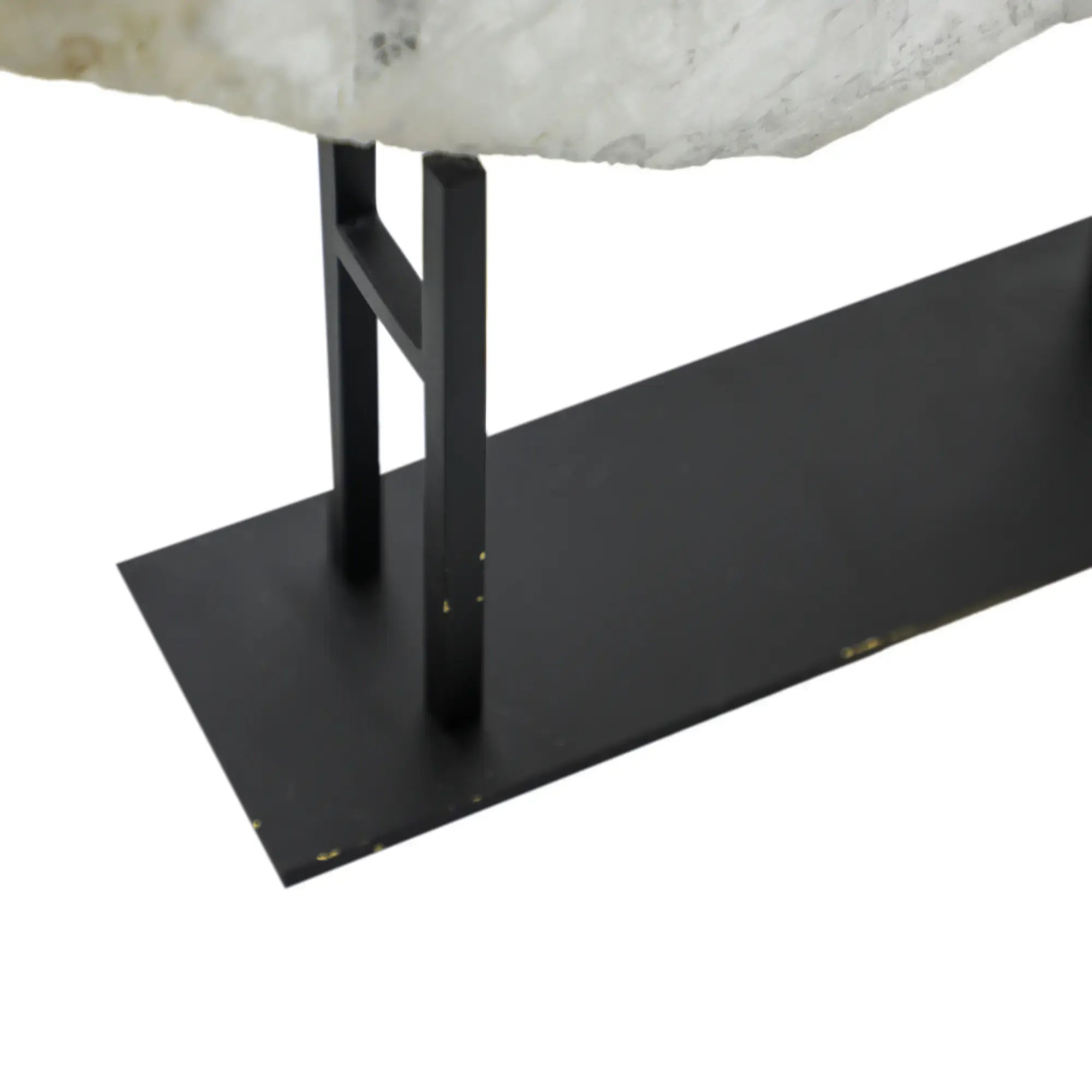 Gipsbergwerk-Stein mit alabasterähnlicher Optik – zart, natürlich, hochwertig. Goldene Meditationsfigur (inspiriert von Mönch oder Dalai Lama) auf schwarzem Stahlgestell – stabil, edel, kontrastreich.