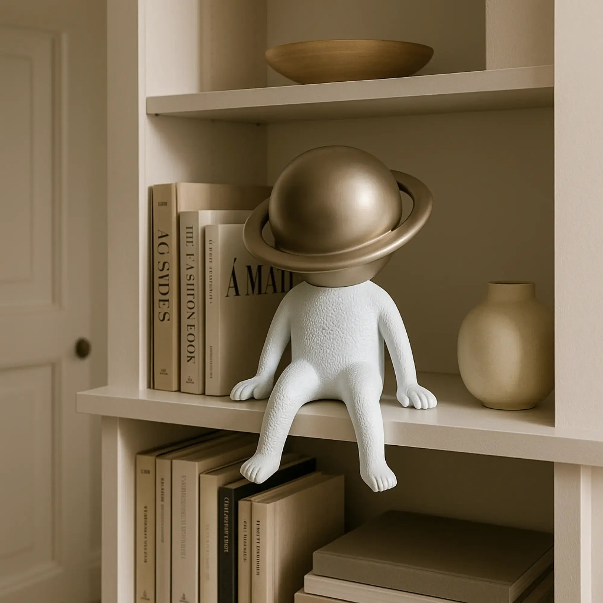 Die moderne Dekorationsfigur „Marsmensch“ vereint futuristische Eleganz mit stilvollem Design und einem Hauch von Humor. Die sitzende weiße Figur mit strukturierter Oberfläche trägt einen großen silbernen Planetenkopf mit umlaufendem Ring – ein Blickfang im Stil eines Astronauten oder spacigen Wesens. Gefertigt aus robustem Kunststoff, ist sie langlebig, pflegeleicht und hochwertig verarbeitet. Perfekt für Regale, Sideboards, Fensterbänke oder das Bücherregal – ideal für alle, die nach kreativen Ideen zum Bücherregal dekorieren & gestalten suchen. Auch als lockerer Buchhalter oder Buchstütze einsetzbar. Besonders beliebt bei Kindern im Kinderzimmer, wo sie für Staunen und Fantasie sorgt. Ein originelles Wohnaccessoire – und eine fantasievolle Geschenkidee für Technikfans, Sci-Fi-Liebhaber oder designaffine Freunde.
