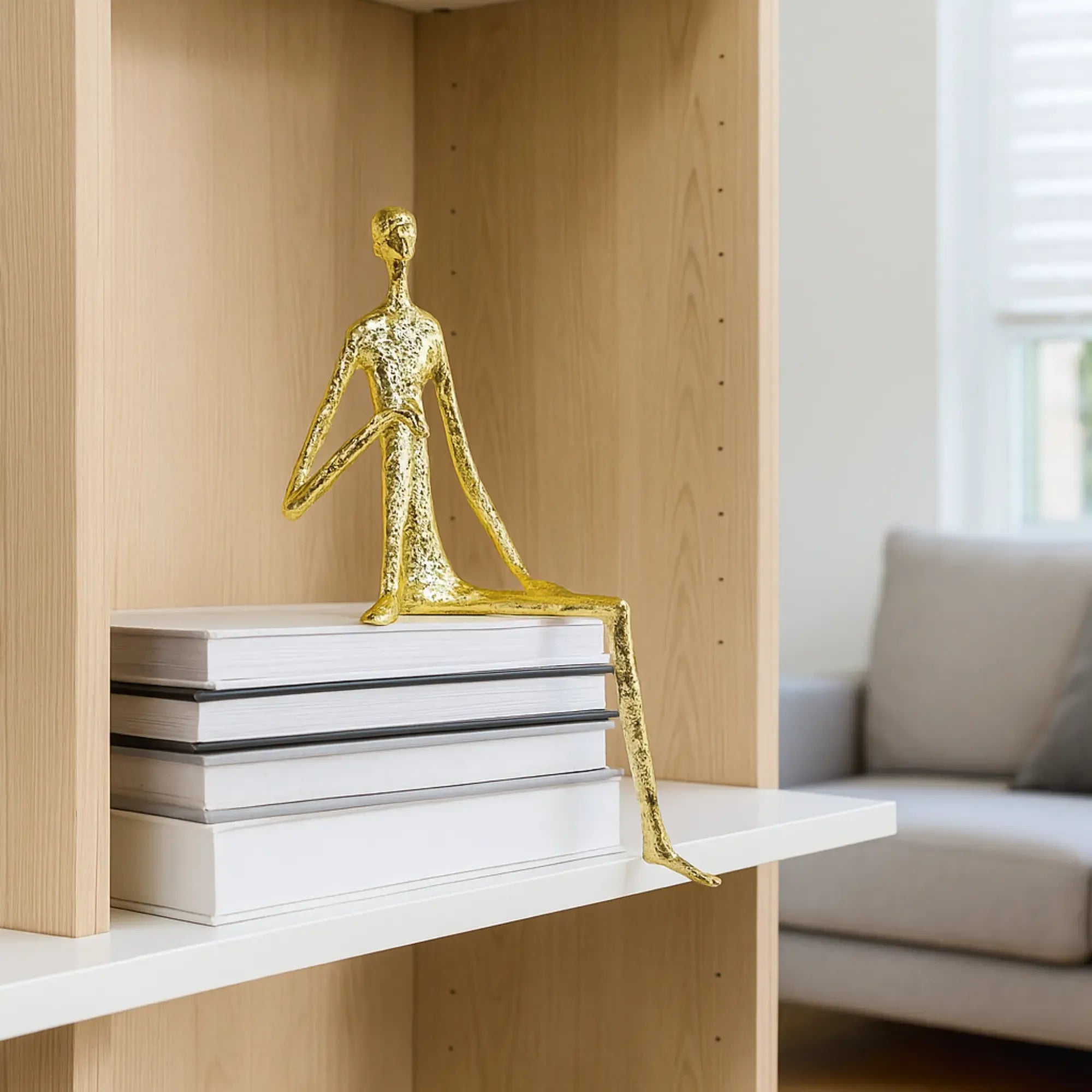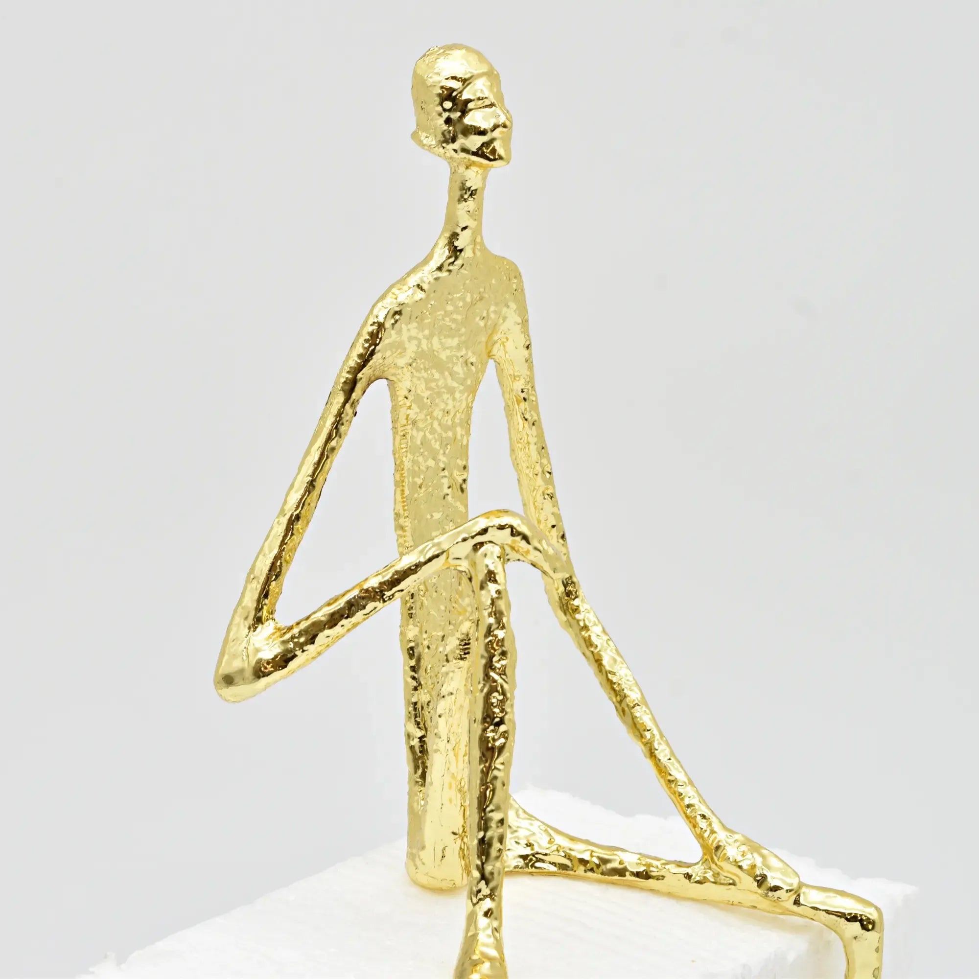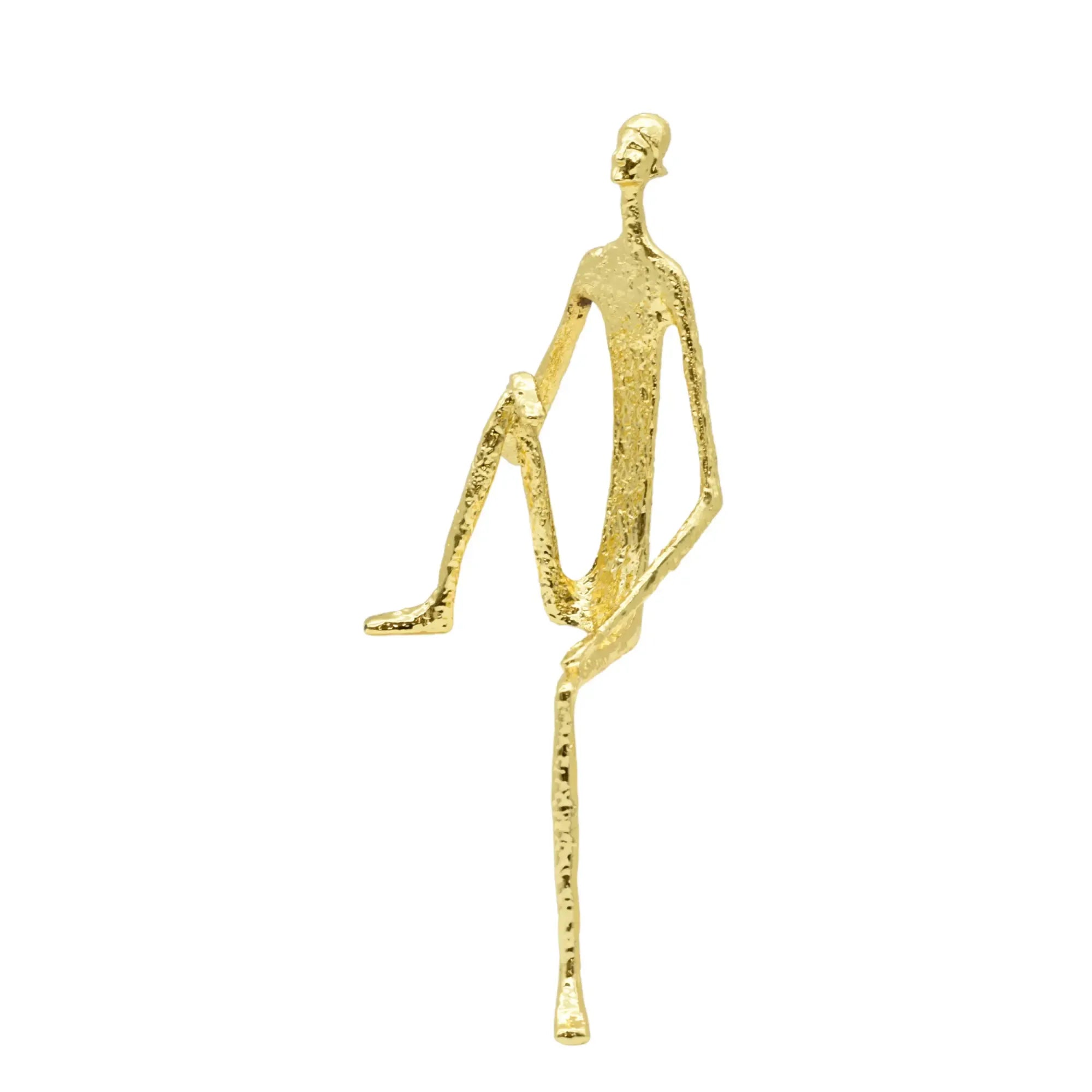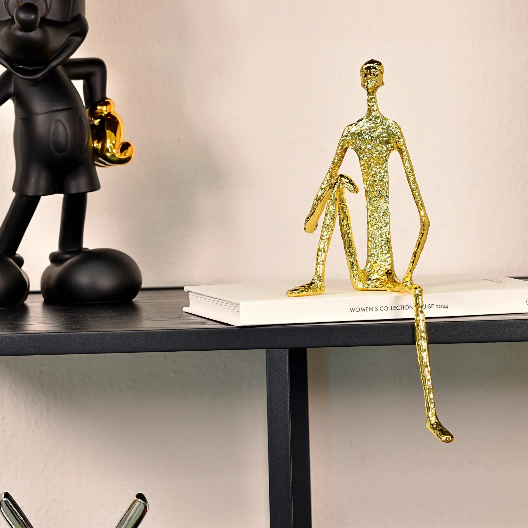 Reduziert, nachdenklich, ikonisch. Eine filigrane Menschenfigur nimmt Platz an der Kante – mit locker angewinkeltem Bein, entspanntem Rücken und einem Blick, der in die Ferne zu schweifen scheint. Die schlanke Linienführung und die strukturierte Oberfläche in edler Goldoptik verleihen der Figur eine skulpturale Präsenz, die trotz Leichtigkeit kraftvoll wirkt.