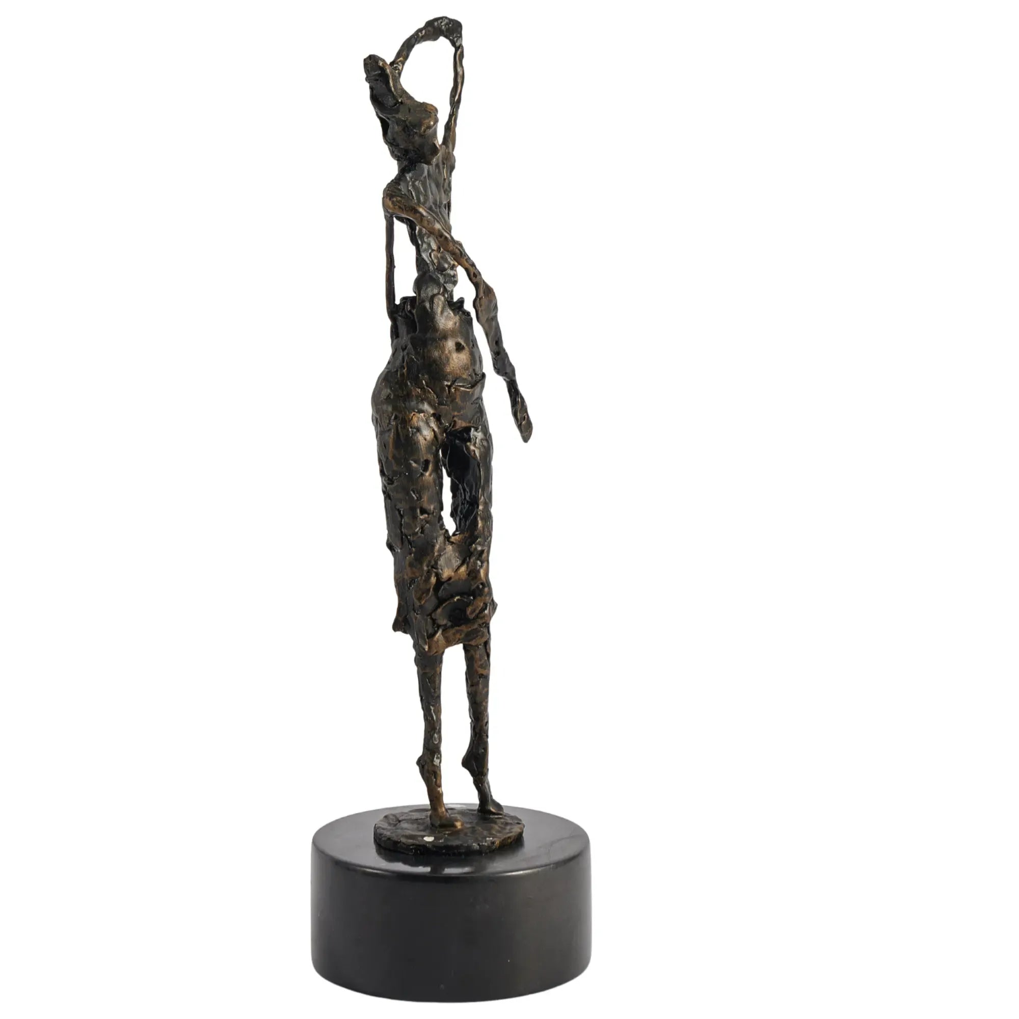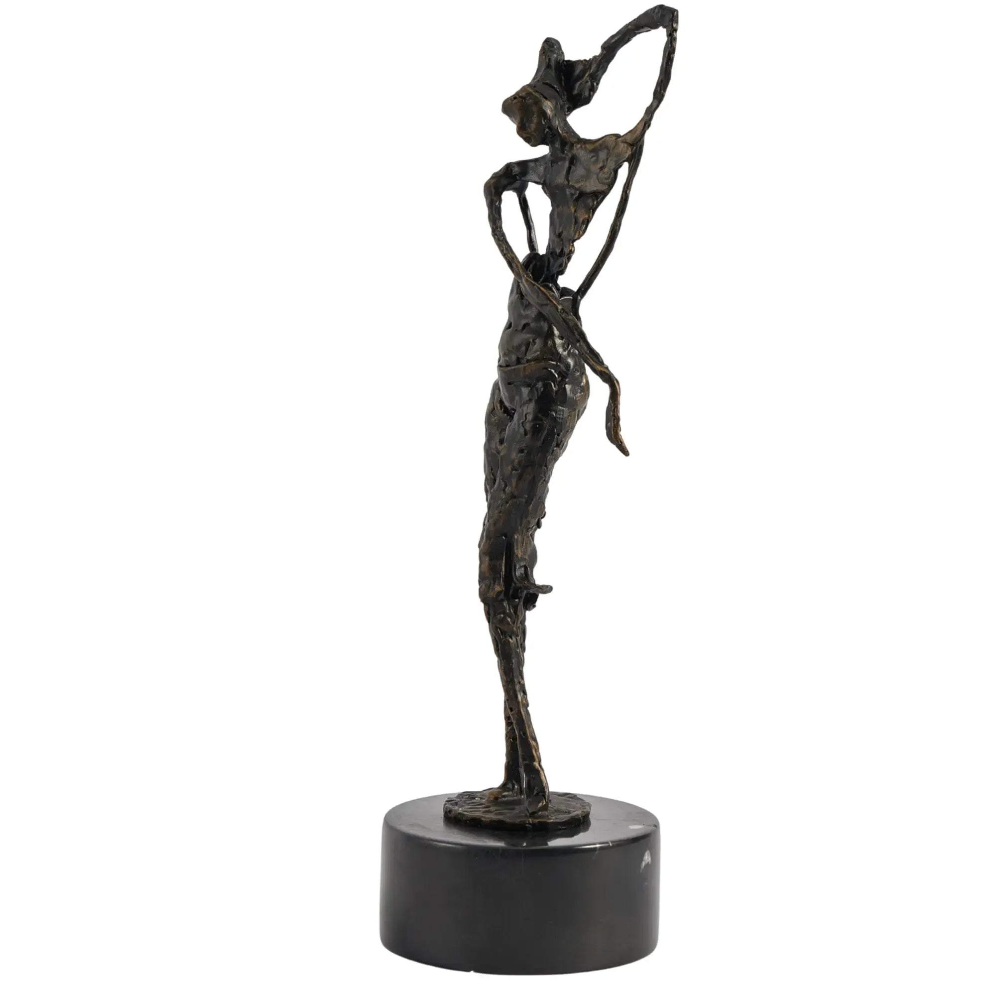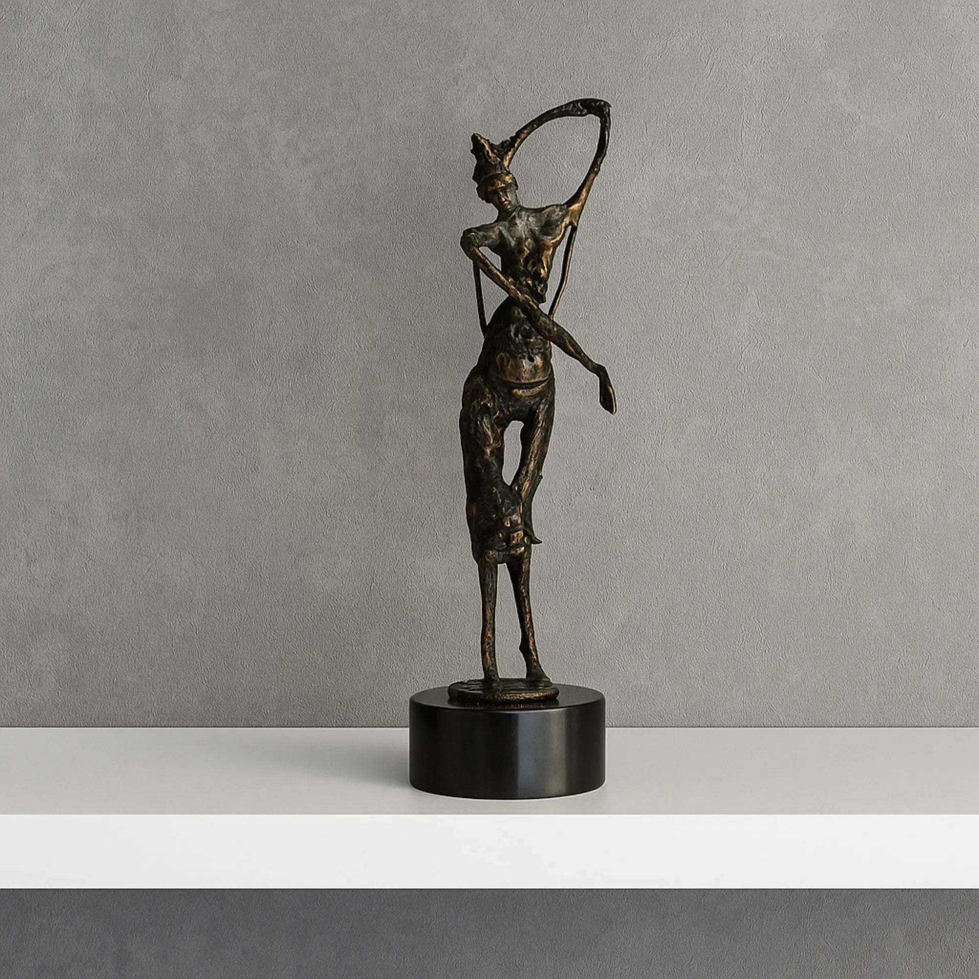 Die Choreia Aeterna ist eine exquisite abstrakte Frauenskulptur, die die Anmut und Eleganz des Tanzes in einer zeitlosen Form einfängt. Diese Skulptur, gefertigt aus hochwertigem Aluminium und veredelt in einem tiefen Dunkelbronze-Finish, verkörpert die fließenden Bewegungen einer Frau, die in einem Moment der reinen Freude und Freiheit posiert oder tanzt. Die weichen Handbewegungen und die dynamische Haltung der Figur verleihen jedem Raum eine Aura von Raffinesse und künstlerischem Ausdruck. Die Skulptur steht auf einem runden Marmorpodest, das ihre erhabene Präsenz unterstreicht und sie zu einem perfekten Mittelpunkt auf einer Kommode, einem Regal oder im Eingangsbereich macht.