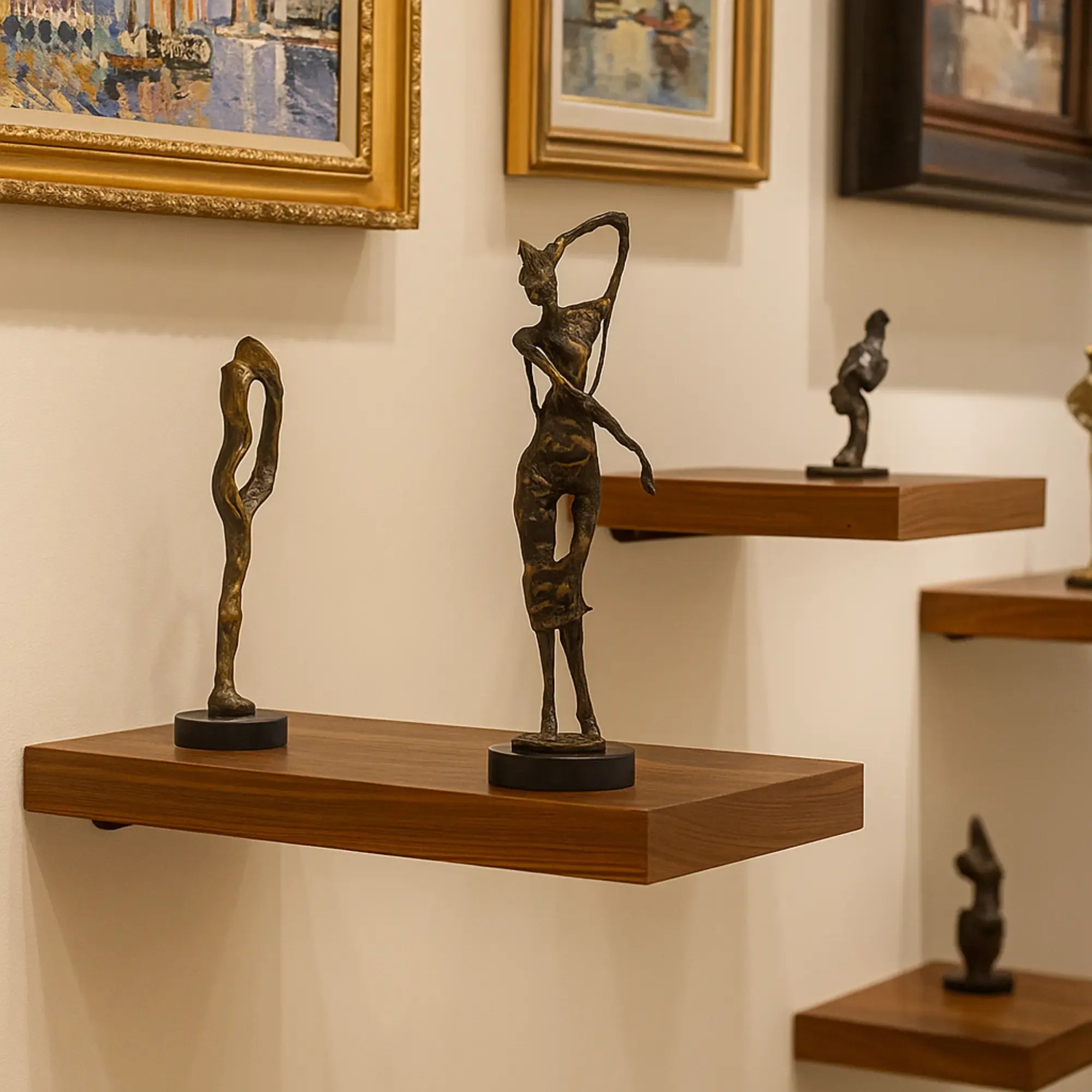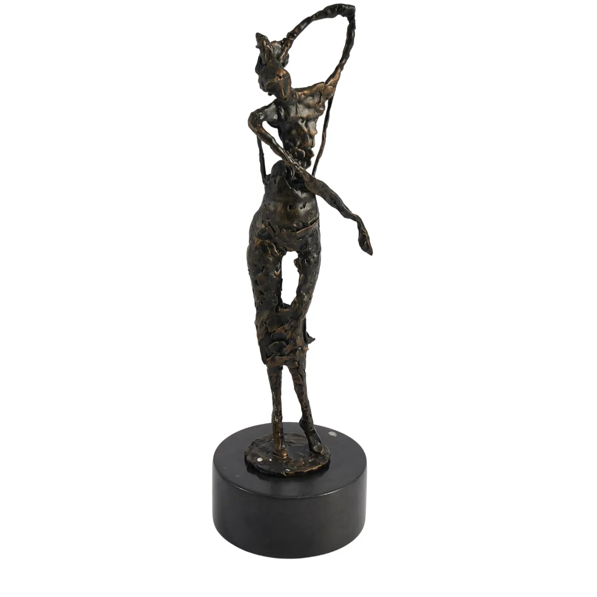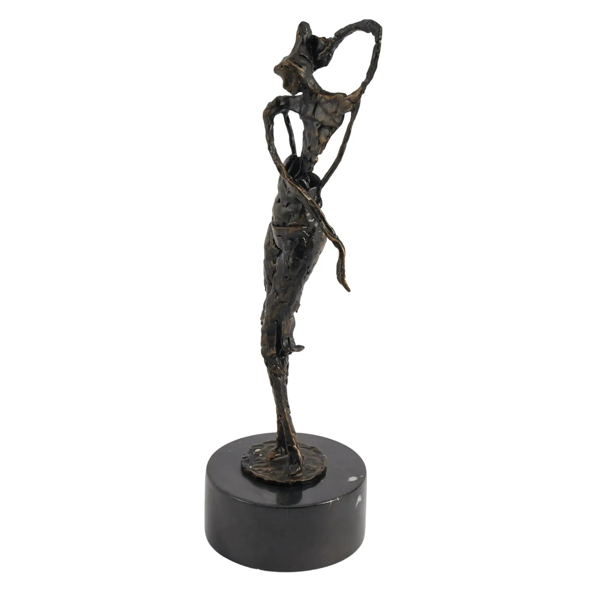 Die Choreia Aeterna ist eine exquisite abstrakte Frauenskulptur, die die Anmut und Eleganz des Tanzes in einer zeitlosen Form einfängt. Diese Skulptur, gefertigt aus hochwertigem Aluminium und veredelt in einem tiefen Dunkelbronze-Finish, verkörpert die fließenden Bewegungen einer Frau, die in einem Moment der reinen Freude und Freiheit posiert oder tanzt. Die weichen Handbewegungen und die dynamische Haltung der Figur verleihen jedem Raum eine Aura von Raffinesse und künstlerischem Ausdruck. Die Skulptur steht auf einem runden Marmorpodest, das ihre erhabene Präsenz unterstreicht und sie zu einem perfekten Mittelpunkt auf einer Kommode, einem Regal oder im Eingangsbereich macht.