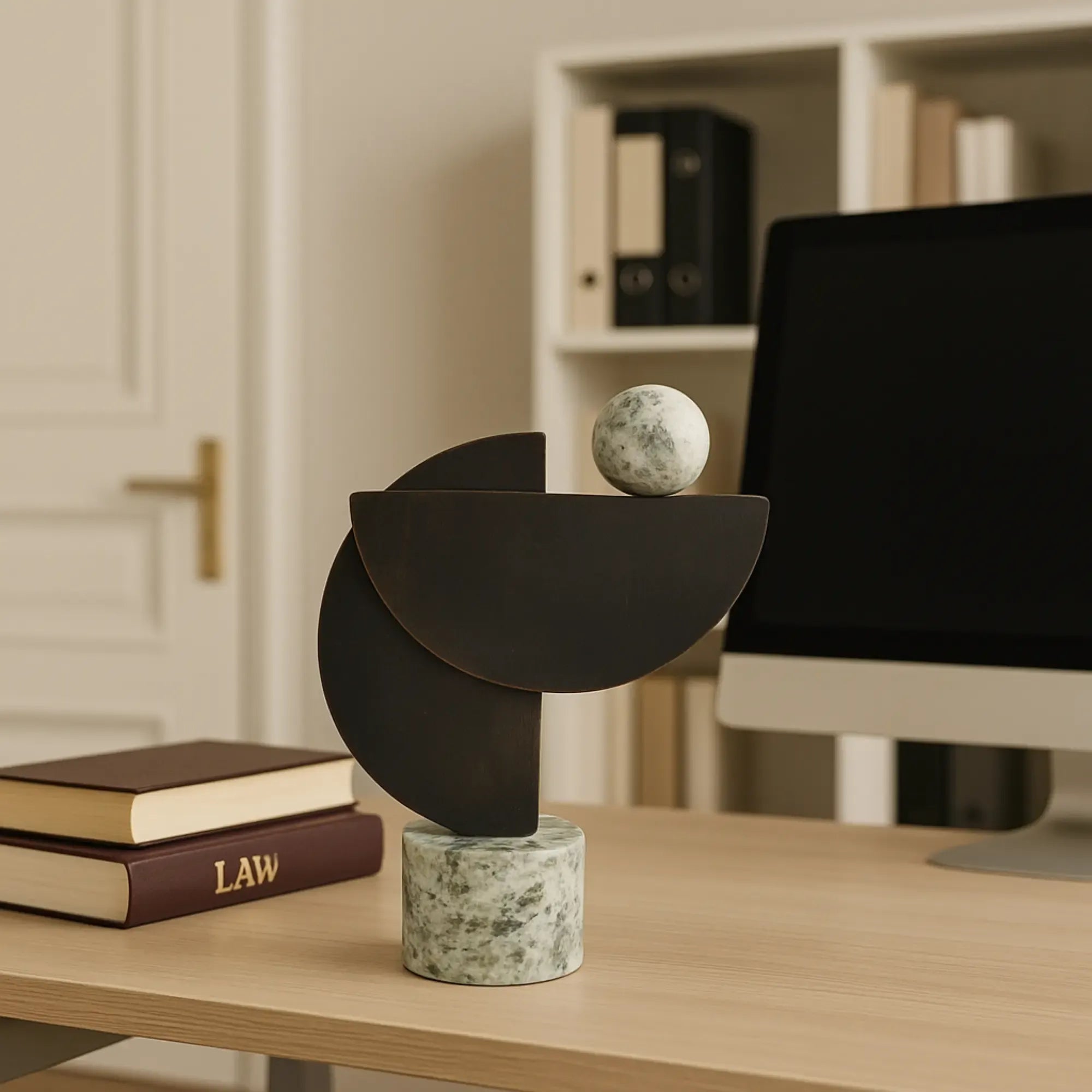 Geometrische Steinskulptur – die Sculpture Géométrique vereint modernes Design mit klassischer Handwerkskunst. Aus robustem Stahl in Antikbronze-Optik gefertigt und mit einem massiven grünen Marmorsockel kombiniert, entsteht ein spannungsvoller Mix aus rohem Material und raffinierter Formgebung. Die geometrischen Halbkreisformen und die polierte Natursteinkugel unterstreichen den Bauhaus-inspirierten Charakter und machen das Objekt zu einer skulpturalen Dekoration mit Designanspruch. Die Antikbronze-Patina verleiht dabei einen Hauch von Vintage, ohne an Modernität zu verlieren. Ideal für Sideboards, Galerieräume, Homeoffice oder Empfangsbereiche, ist dieses Kunstobjekt nicht nur ein dekorativer Akzent, sondern auch ein edles Geschenk für Sammler, Kunstliebhaber oder als Pokal für Vereine und Designpreise.