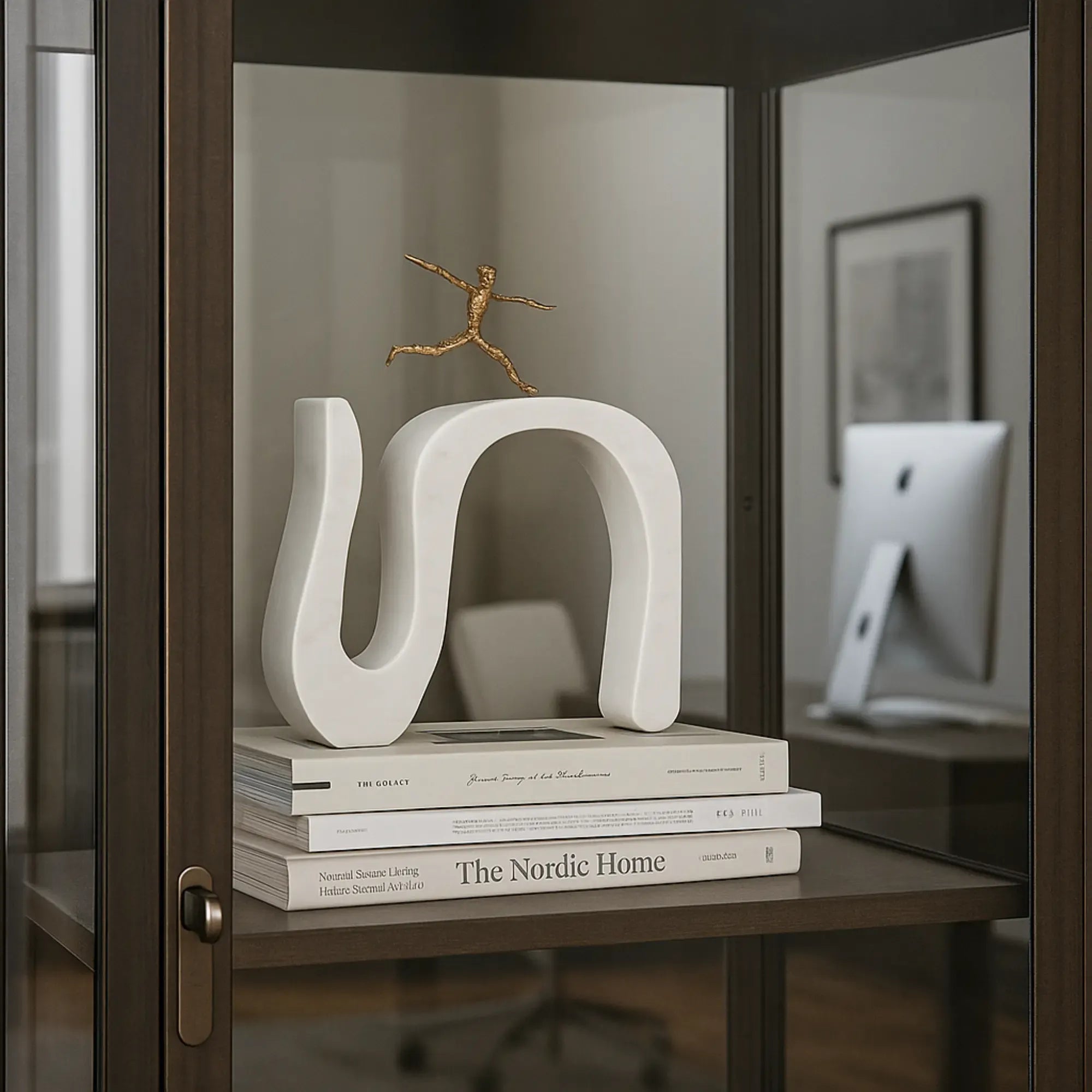 Gefertigt aus edlem Goldton-Material, kombiniert mit einer weißen Marmor-Sockelbasis in geschwungener S-Form. Die abstrahierte Silhouette einer springenden Frau symbolisiert Bewegung, Energie und Lebensfreude – ein Ausdruck von Erfolg und Balance.