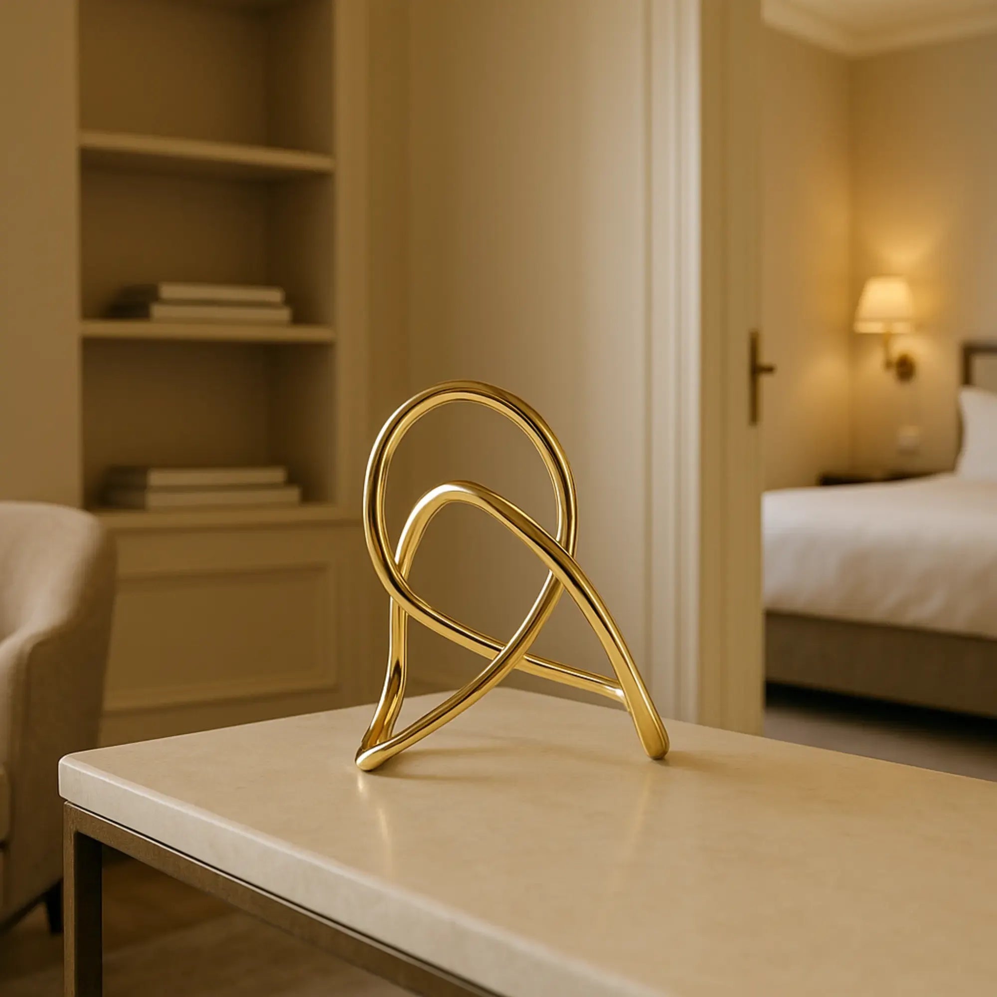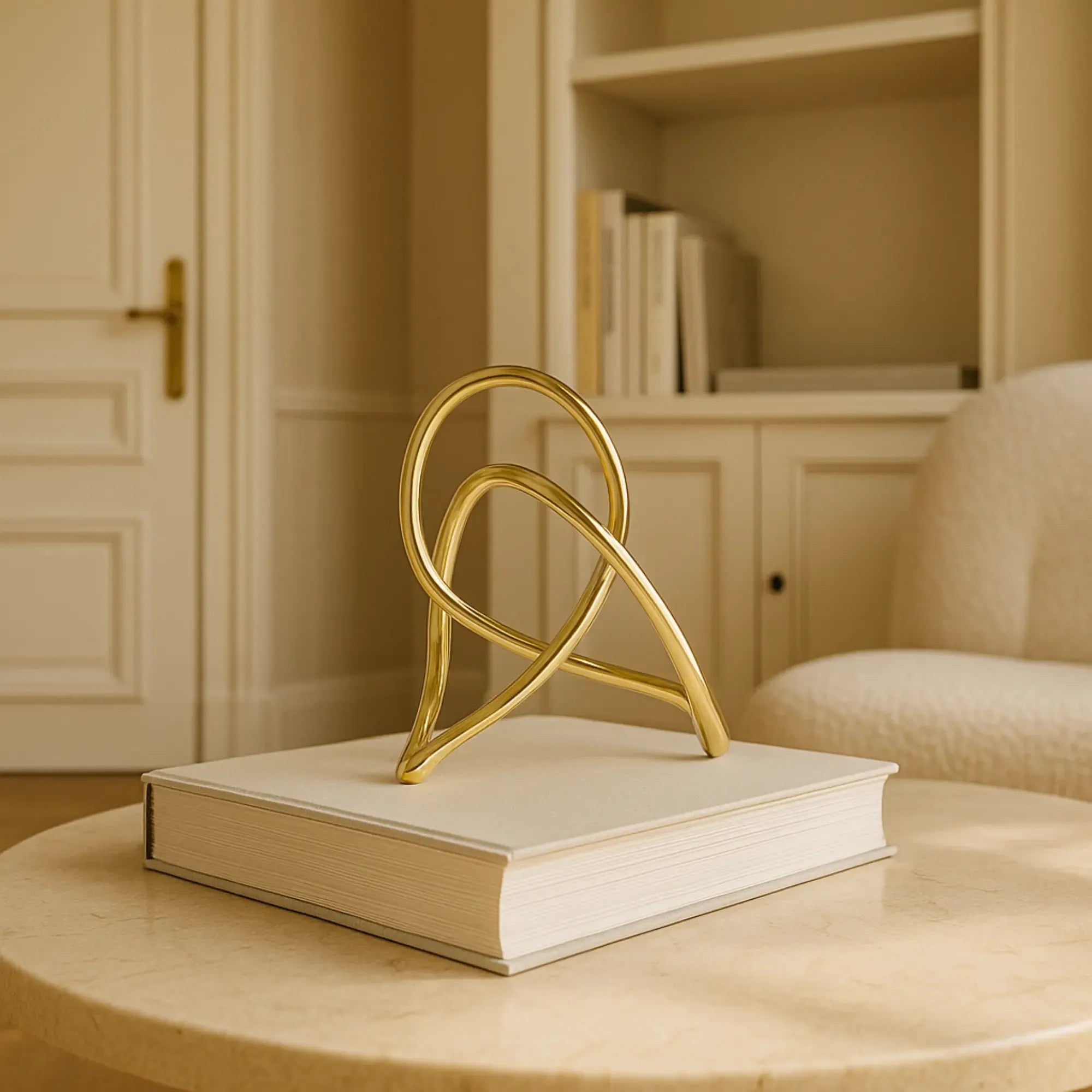 Das Golden Flow ist ein dekoratives Highlight aus hochwertigem Metall in edler Goldoptik, dessen fließende, verschlungene Form an einen Knoten oder das Symbol der Unendlichkeit erinnert. Die skulpturale Linienführung strahlt Leichtigkeit und Bewegung aus und bringt gleichzeitig eine elegante Tiefe in moderne Wohnräume. Ob als Buchstütze, Buchseitenhalter oder Designobjekt auf Sideboards, Schreibtischen oder in Regalen – die vielseitige Form macht diese Skulptur zu einem wandelbaren Element mit hohem stilistischen Anspruch. Besonders in Wohnzimmern, Homeoffices, Büros oder als Tischdeko für besondere Anlässe sorgt sie für einen modernen, luxuriösen Akzent. Ideal auch als leichte, kunstvolle Geschenkidee für Familie, Freund:innen oder zur Einweihung. Die Golden Flow Skulptur vereint abstrakte Kunst mit praktischer Funktionalität – ein Designstück, das vielfältige Dekorationsideen inspiriert und jedem Raum Charakter verleiht.