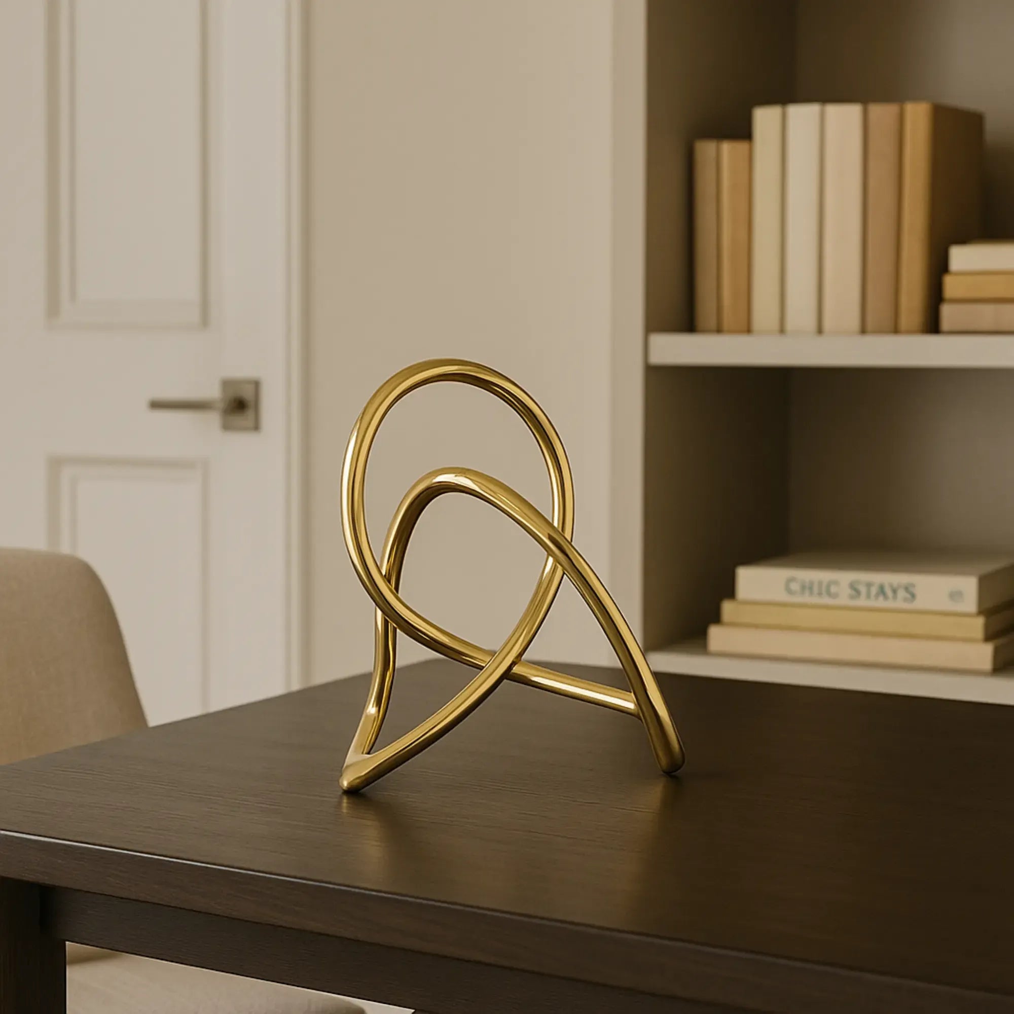 Knotenskulptur Messing, abstrakte Dekoration Gold, Unendlichkeit Dekoobjekt, modernes Wohnaccessoire, luxuriöse Tischdeko, handgefertigtes Designobjekt, Geschenkidee Einweihung, Dekoration Homeoffice.
