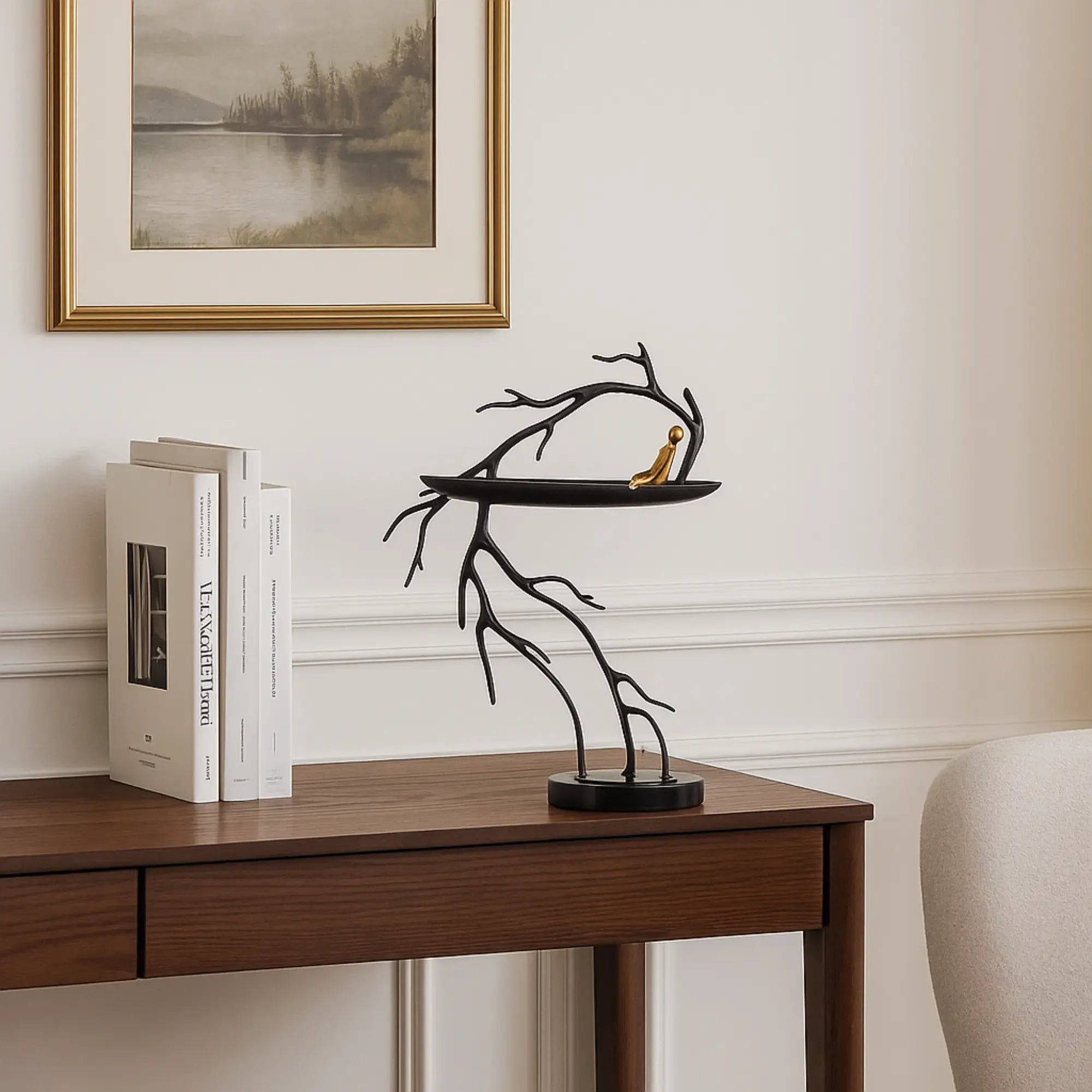 Das Dekorationsobjekt „Rameur – Mensch im Boot auf Baum“ verbindet moderne Dekofigur mit künstlerischem Ausdruck und tiefgründiger Symbolik. Die goldfarbene, handbemalte Figur sitzt in einem stilisierten Boot auf einem verzweigten schwarzen Metallbaum – eine außergewöhnliche Kombination aus Balance, Ästhetik und Ruhe. Die schwarze Marmorbasis sorgt für Stabilität und rundet das abstrakte Design mit eleganter Schwere ab. Diese kunstvolle Skulptur ist eine stilvolle Dekorationsidee für Wohnzimmer, Hausbibliothek, Regal oder Homeoffice. Ideal für außergewöhnliche Dekoideen, kunstvolle Wohnakzente oder als besonderes Geschenk zur Einweihung – ein edler Blickfang mit meditativer Wirkung und dekorativer Tiefe.