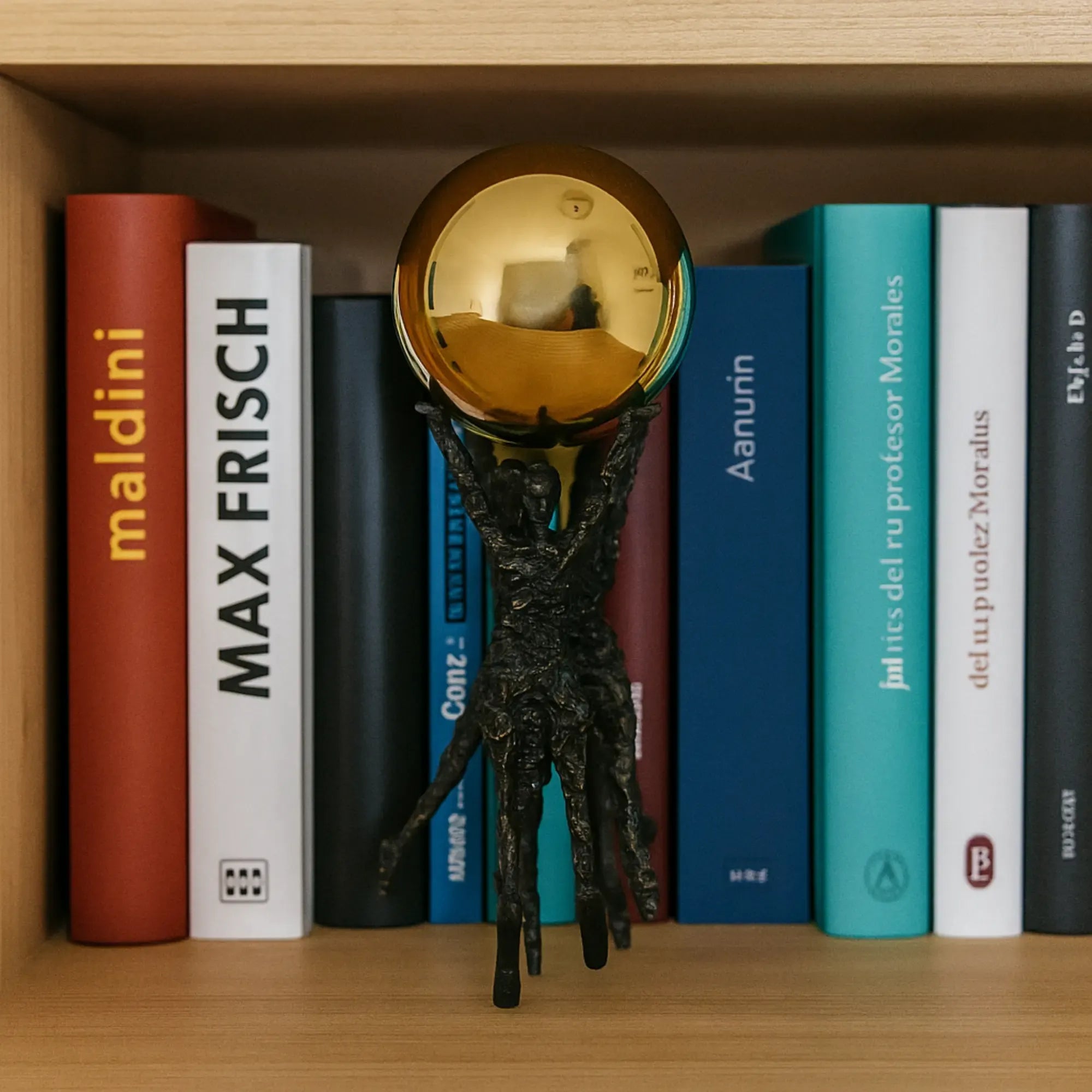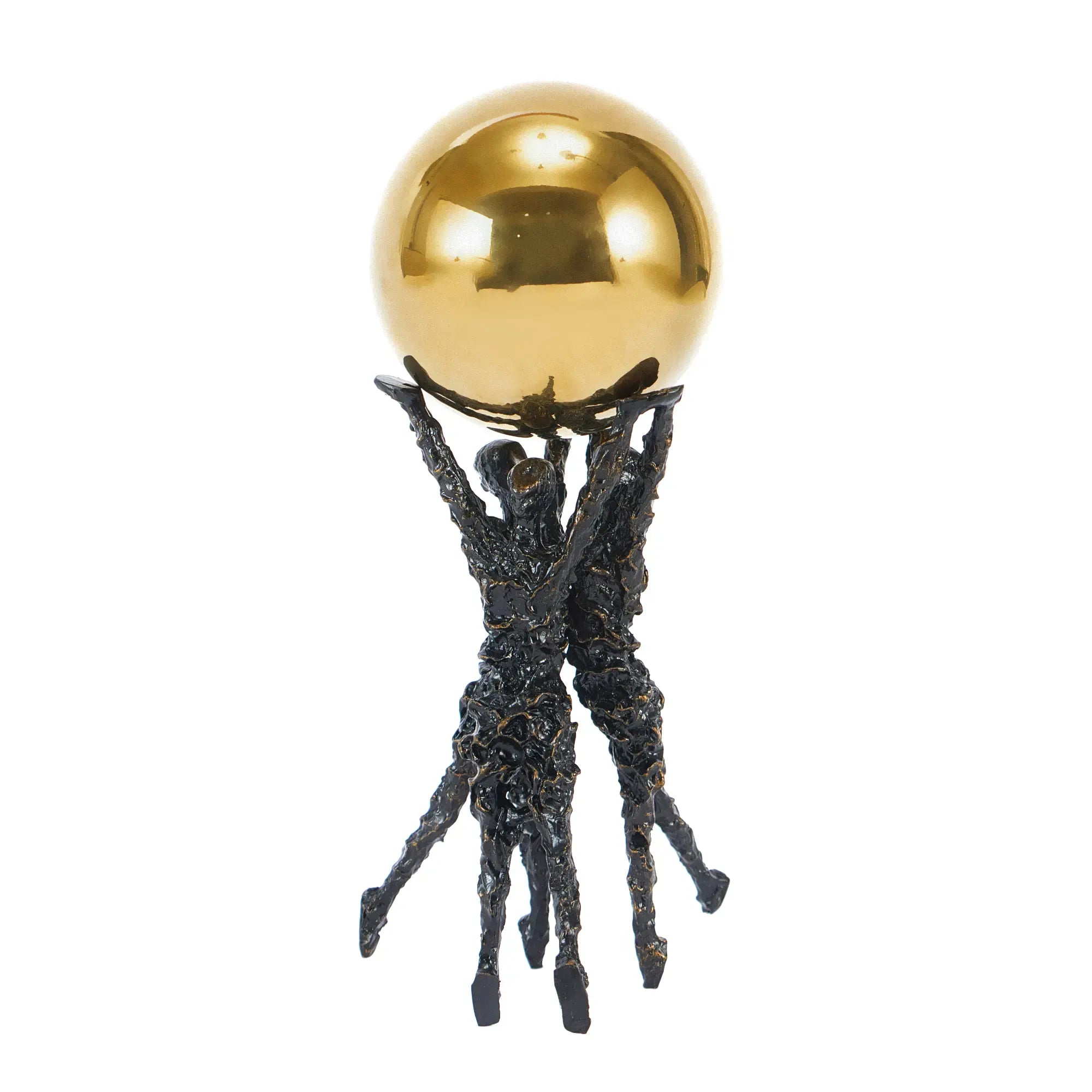 Menschenfiguren: Aus schwarzem Stahl mit feinen goldenen Elementen, die Kontrast und Eleganz schaffen.Kugel: Gefertigt aus hochwertigem Edelstahl in glänzendem Gold – das zentrale, harmonische Element des Objekts. Die abstrakte Darstellung von drei Menschen, die gemeinsam die Kugel halten, steht symbolisch für Freiheit, Zusammenhalt und Frieden.