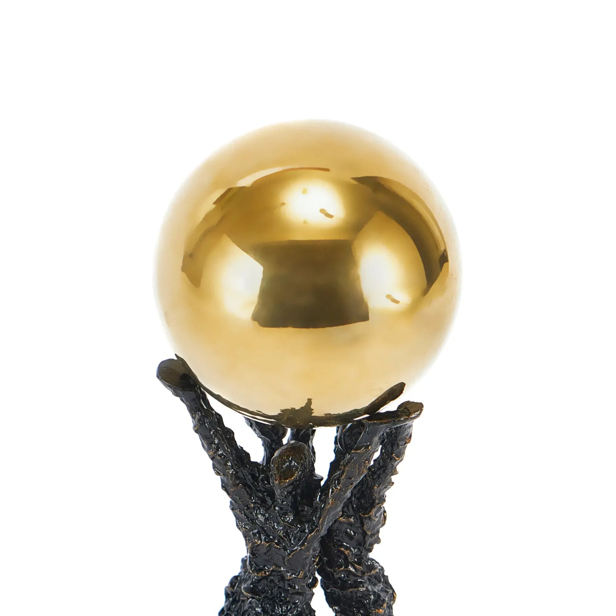 Diese Metallskulptur mit Goldkugel vermittelt eine starke, positive Botschaft von Gemeinschaft und Frieden, während sie gleichzeitig durch ihre abstrakte Ästhetik künstlerisch begeistert.