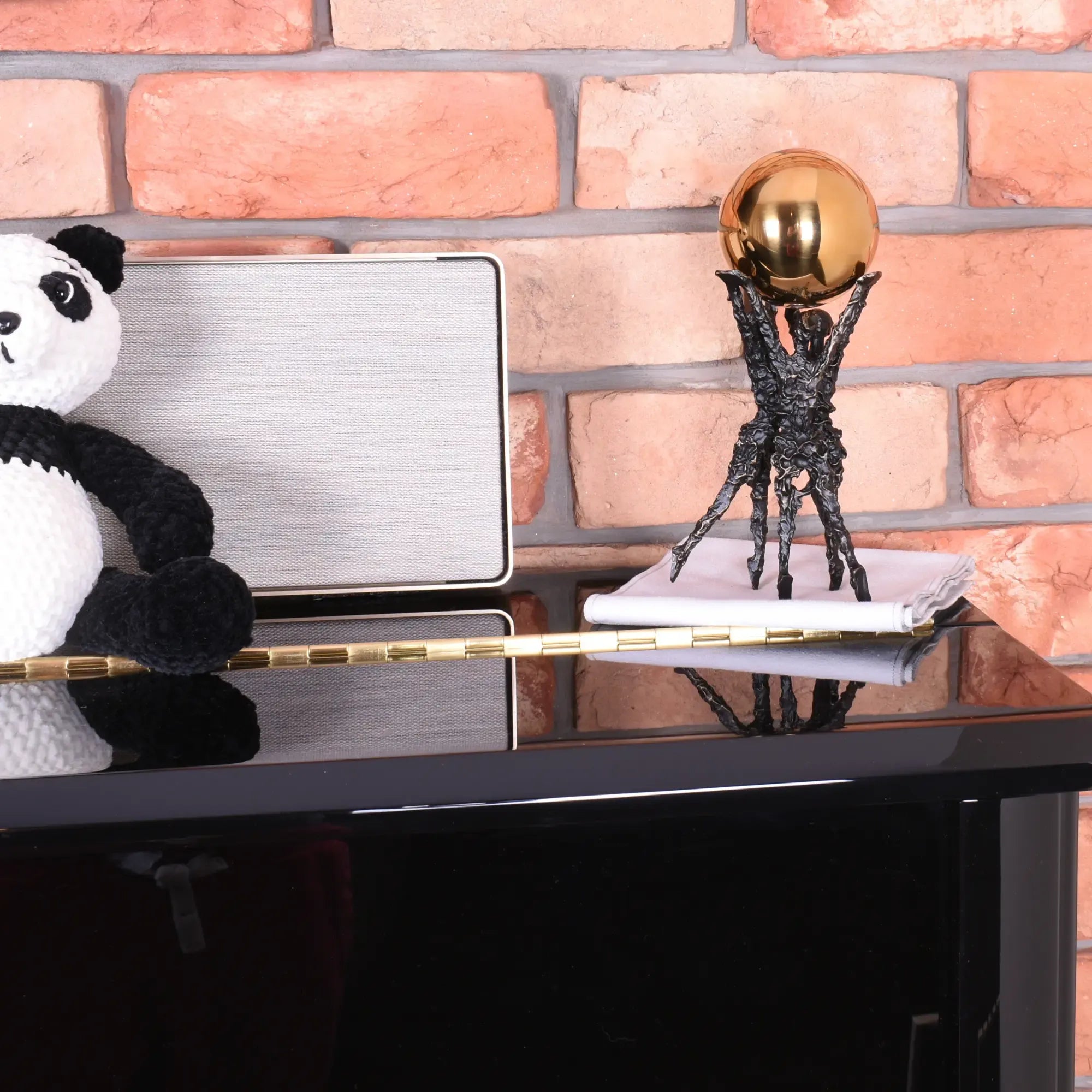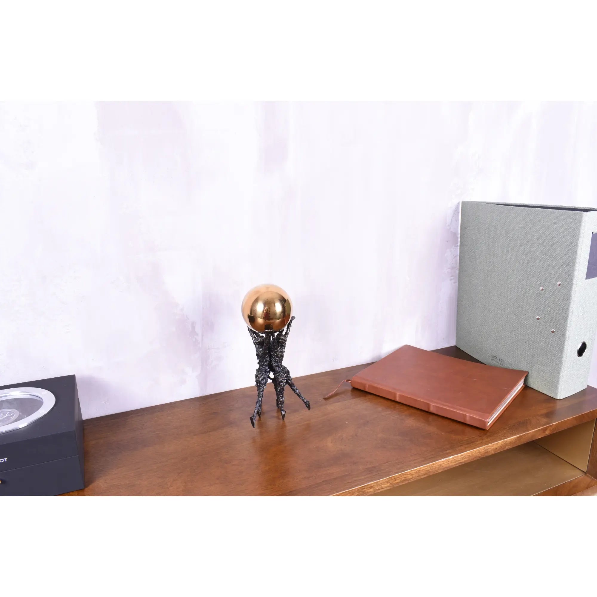 Das Dekorationsobjekt „Menschen Halten Kugel“ symbolisiert Freiheit, Teamgeist und Zusammenhalt in einer kraftvollen, abstrakten Form. Drei stilisierte schwarze Stahlfiguren tragen gemeinsam eine glänzende goldene Edelstahl-Kugel, die Einheit und Stärke verkörpert. Die kontrastreiche Kombination aus strukturierter Metallskulptur und glänzender Oberfläche verleiht dem Kunstwerk eine moderne und hochwertige Anmutung. Die goldenen Akzente setzen einen edlen Fokus und betonen die klare, zeitgemäße Formsprache. Als symbolischer Blickfang auf Tisch, Regal, im Wohnzimmer, Empfangsbereich oder Büro, strahlt diese Metallskulptur mit Goldkugel Harmonie, Motivation und Inspiration aus. Ideal als Geschenk für Führungskräfte, Teamleiter, für Firmenjubiläen oder als emotionales Kunstobjekt für moderne Einrichtungen.