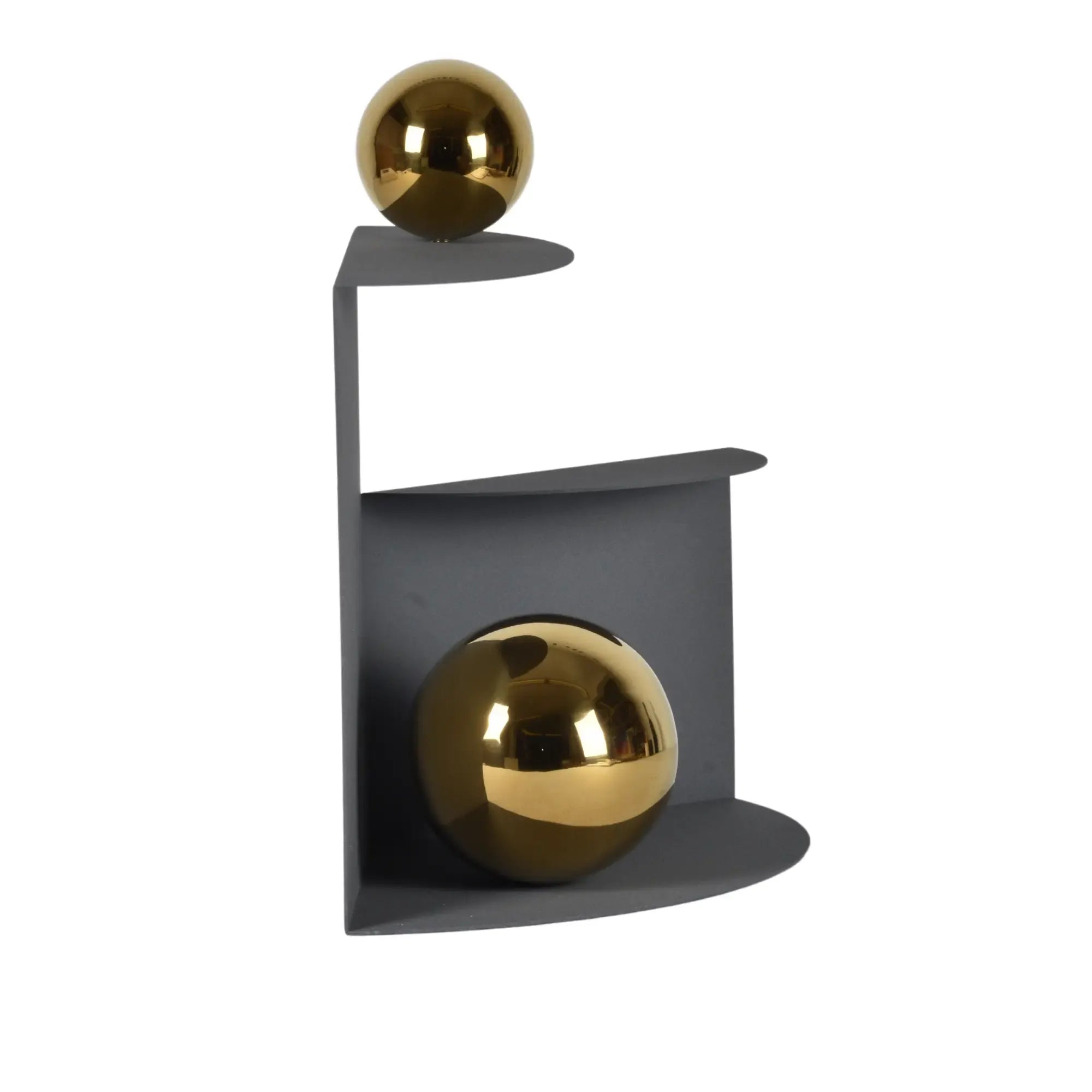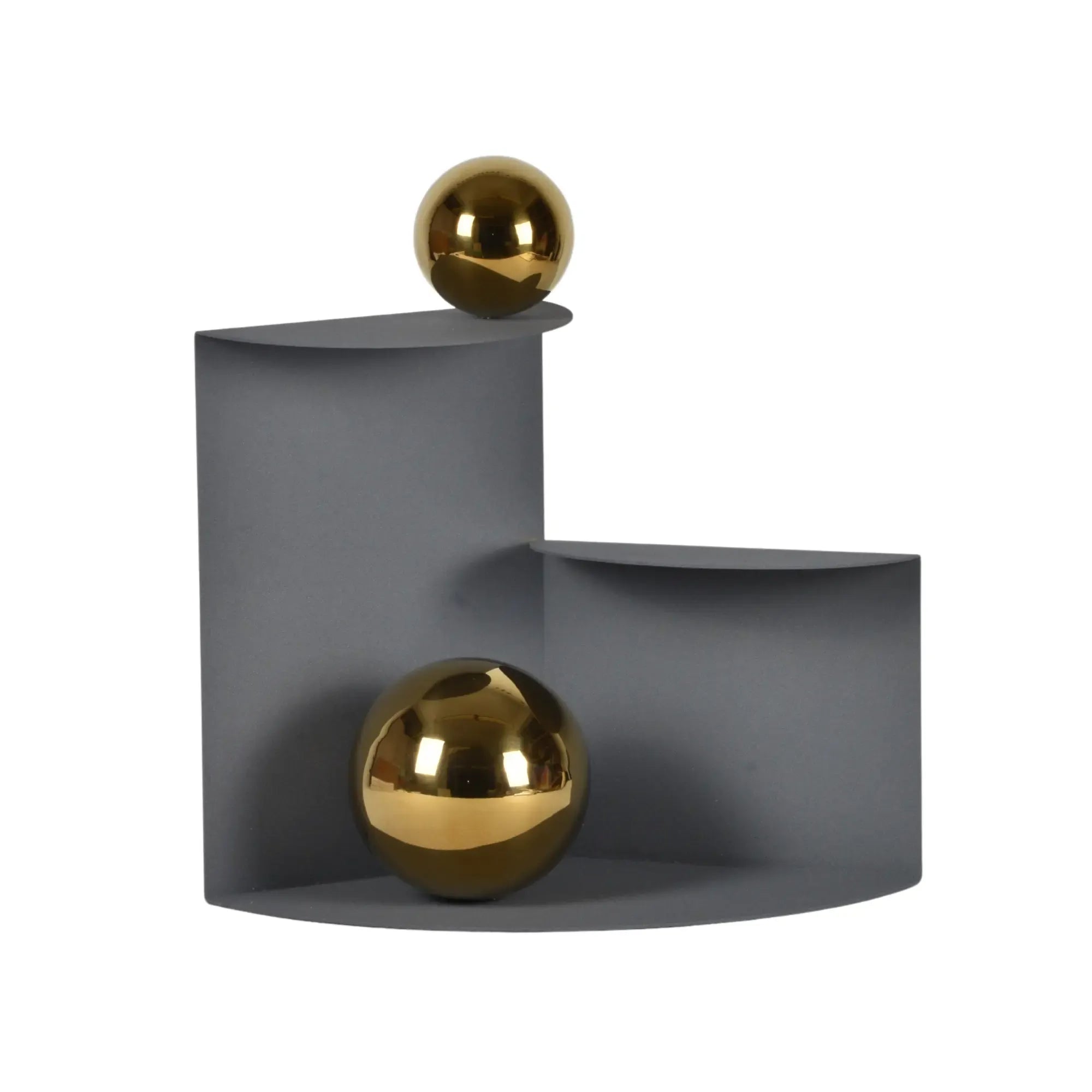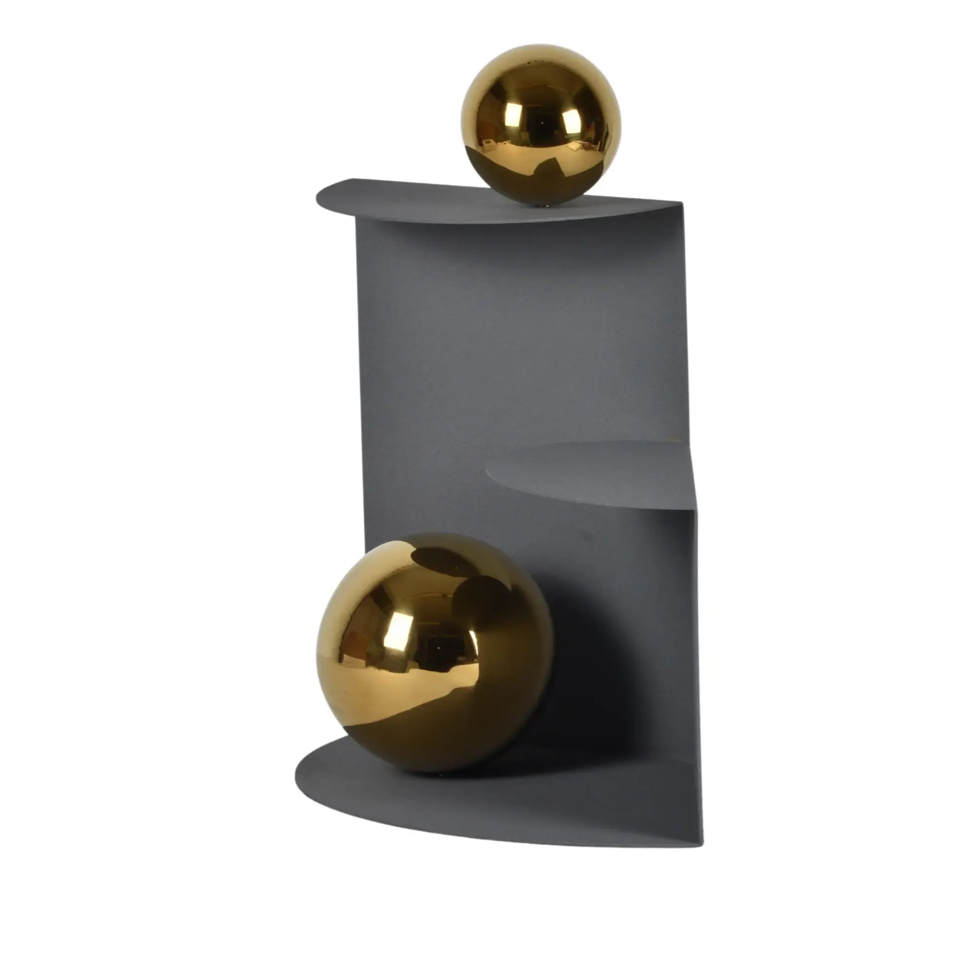 Deko-Objekt Équilibre Géométrique vereint minimalistisches Design und skulpturale Eleganz in einem modernen Kunstobjekt. Die architektonische Struktur aus mattem Stahl trägt zwei glänzende Edelstahlkugeln in Goldoptik, die in perfektem Gleichgewicht ruhen. Diese geometrische Skulptur spielt mit Kontrasten – zwischen mattem Grau und spiegelnder Goldoberfläche, zwischen Stabilität und Leichtigkeit. Sie lässt sich nicht nur als Dekoskulptur, sondern auch funktional als Buchstütze einsetzen – ideal für Regale, Sideboards oder Tische. Ein stilvoller Hingucker für Wohnzimmer, Büros oder Empfangsbereiche, der moderne Kunst, Geometrie und Luxus verbindet. Auch als hochwertiges Geschenk zur Einweihung begeistert dieses Objekt Designliebhaber und Ästhetikfans gleichermaßen.