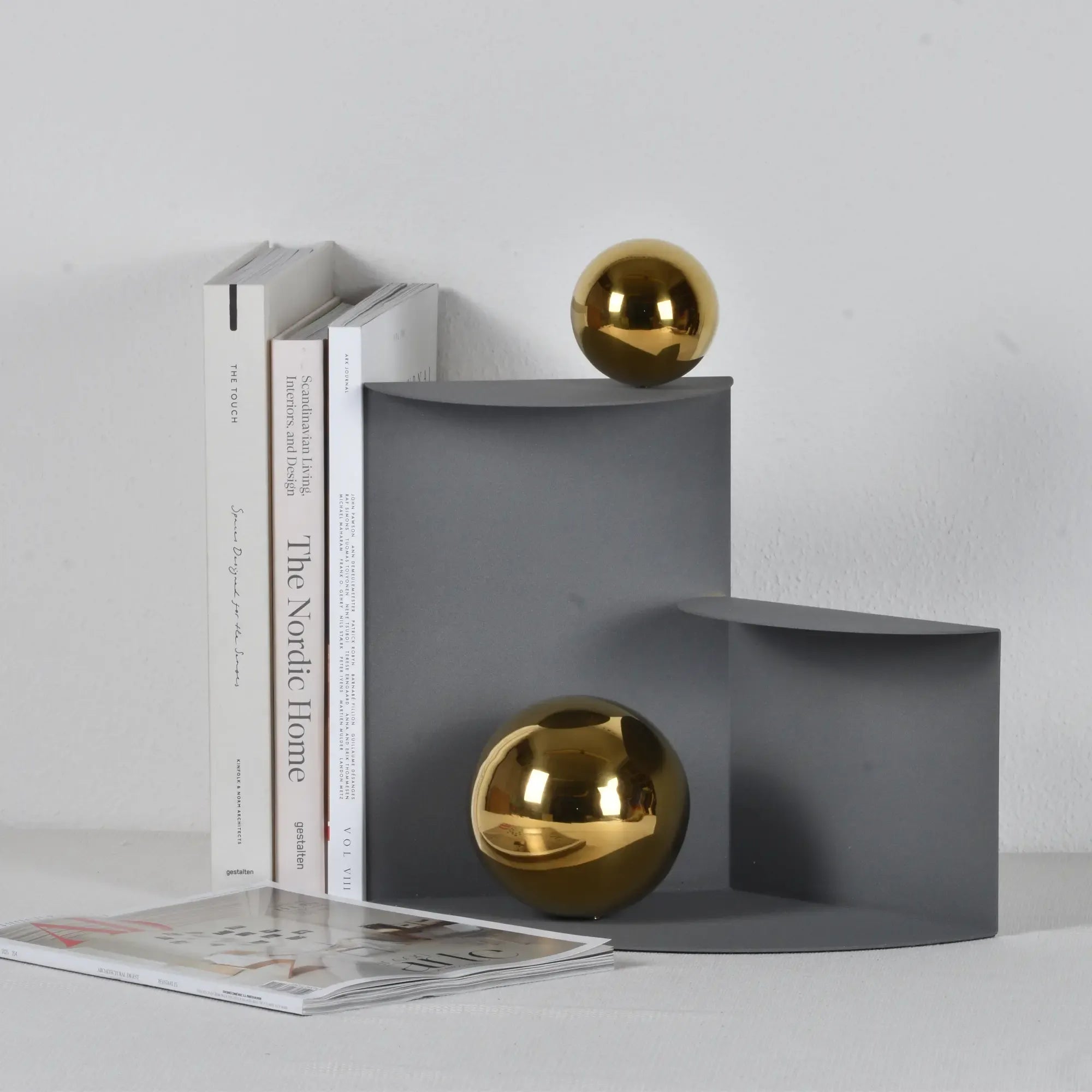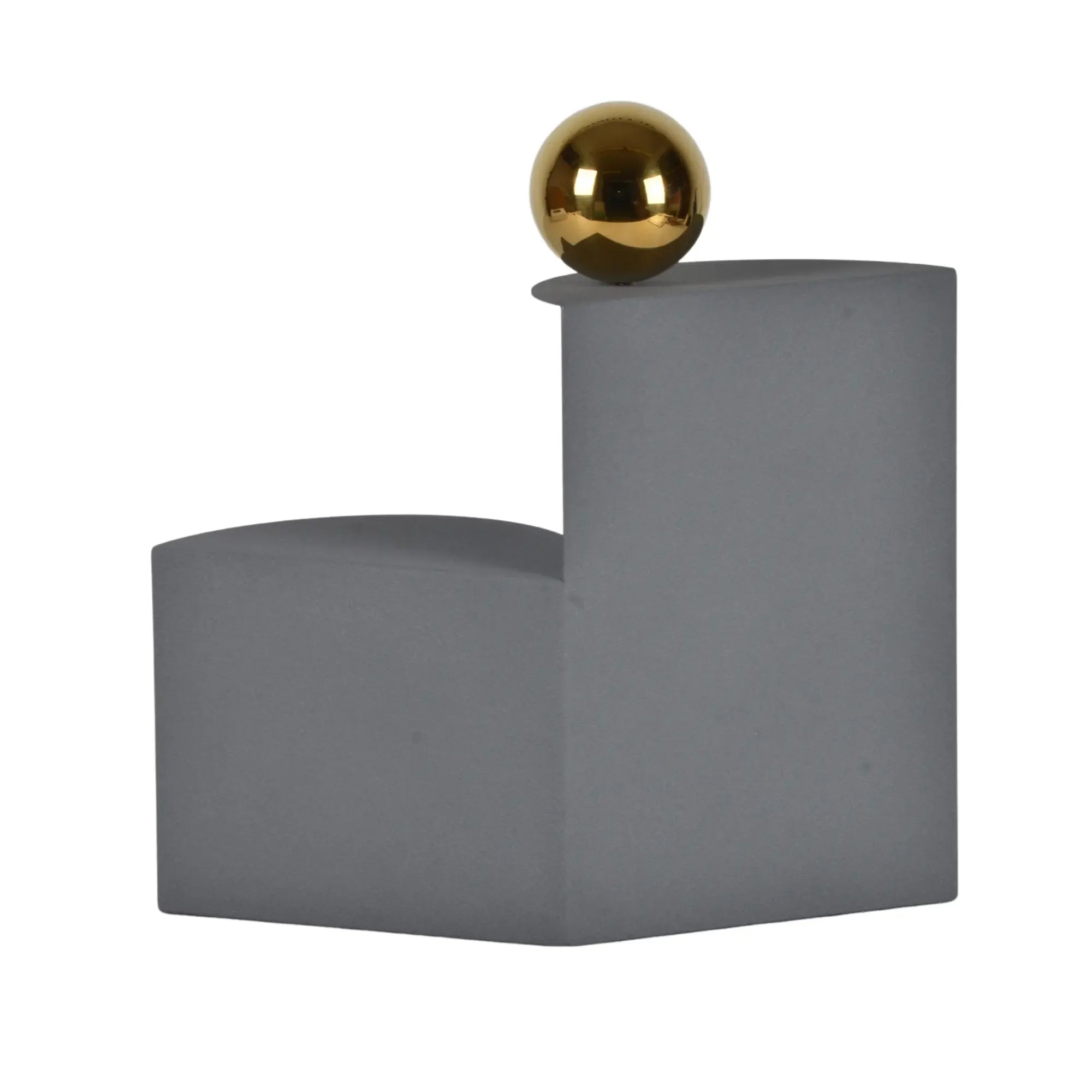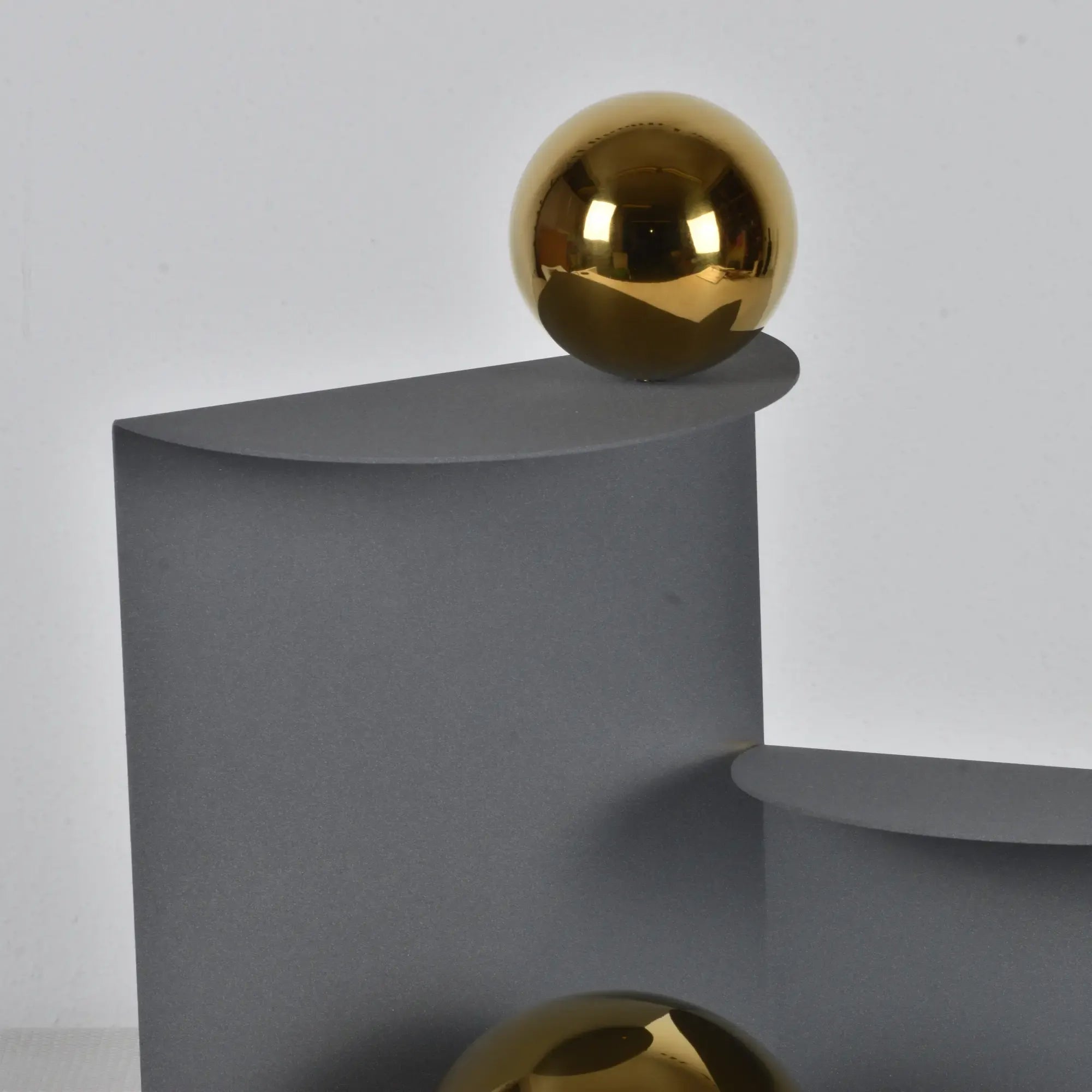 Deko-Objekt Équilibre Géométrique vereint minimalistisches Design und skulpturale Eleganz in einem modernen Kunstobjekt. Die architektonische Struktur aus mattem Stahl trägt zwei glänzende Edelstahlkugeln in Goldoptik, die in perfektem Gleichgewicht ruhen. Diese geometrische Skulptur spielt mit Kontrasten – zwischen mattem Grau und spiegelnder Goldoberfläche, zwischen Stabilität und Leichtigkeit. Sie lässt sich nicht nur als Dekoskulptur, sondern auch funktional als Buchstütze einsetzen – ideal für Regale, Sideboards oder Tische. Ein stilvoller Hingucker für Wohnzimmer, Büros oder Empfangsbereiche, der moderne Kunst, Geometrie und Luxus verbindet. Auch als hochwertiges Geschenk zur Einweihung begeistert dieses Objekt Designliebhaber und Ästhetikfans gleichermaßen.