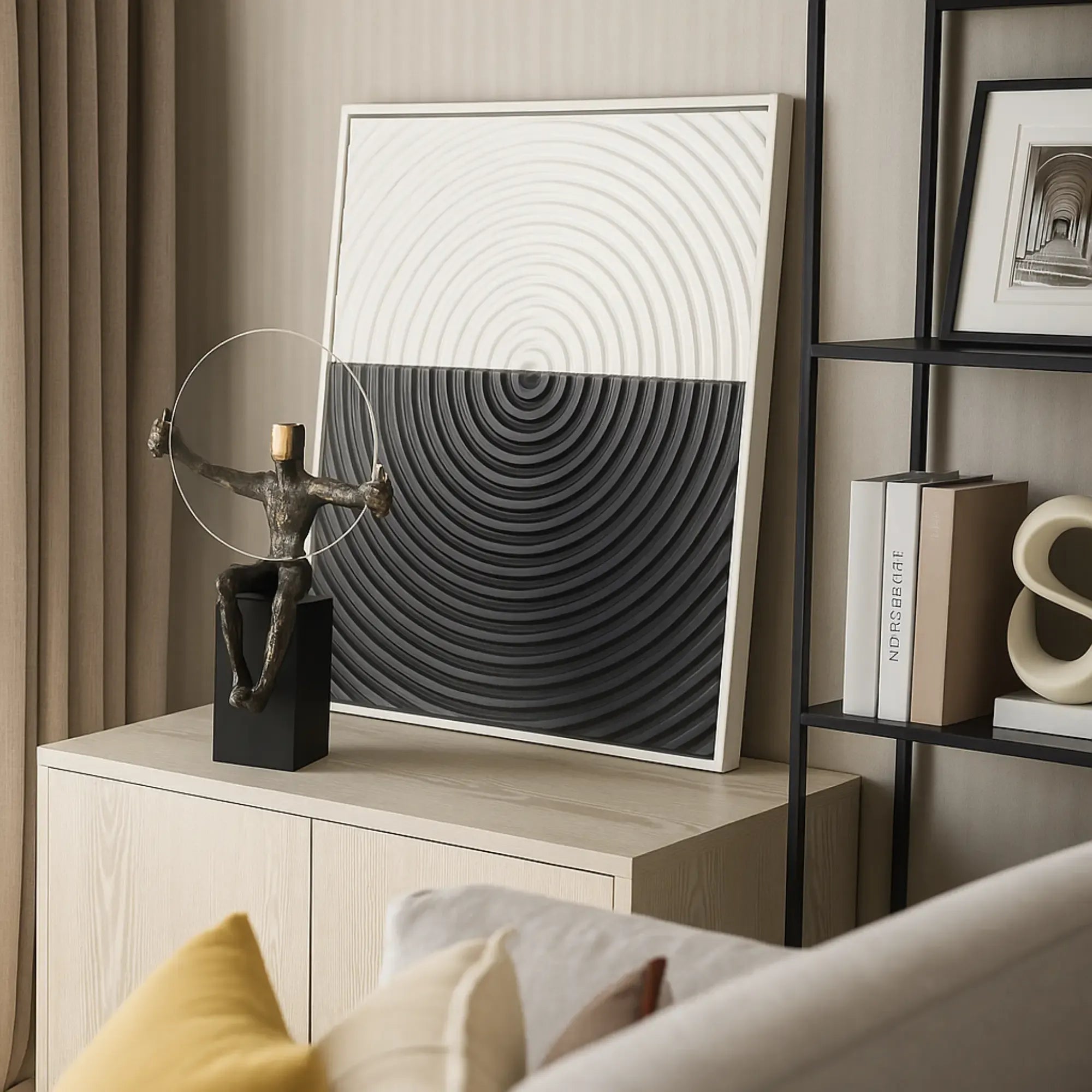 Hochwertige Antikbronze-Farbe kombiniert mit Stahl, Harz und einem transparenten Acryl-Kreis – langlebig, ausdrucksstark und modern interpretiert.