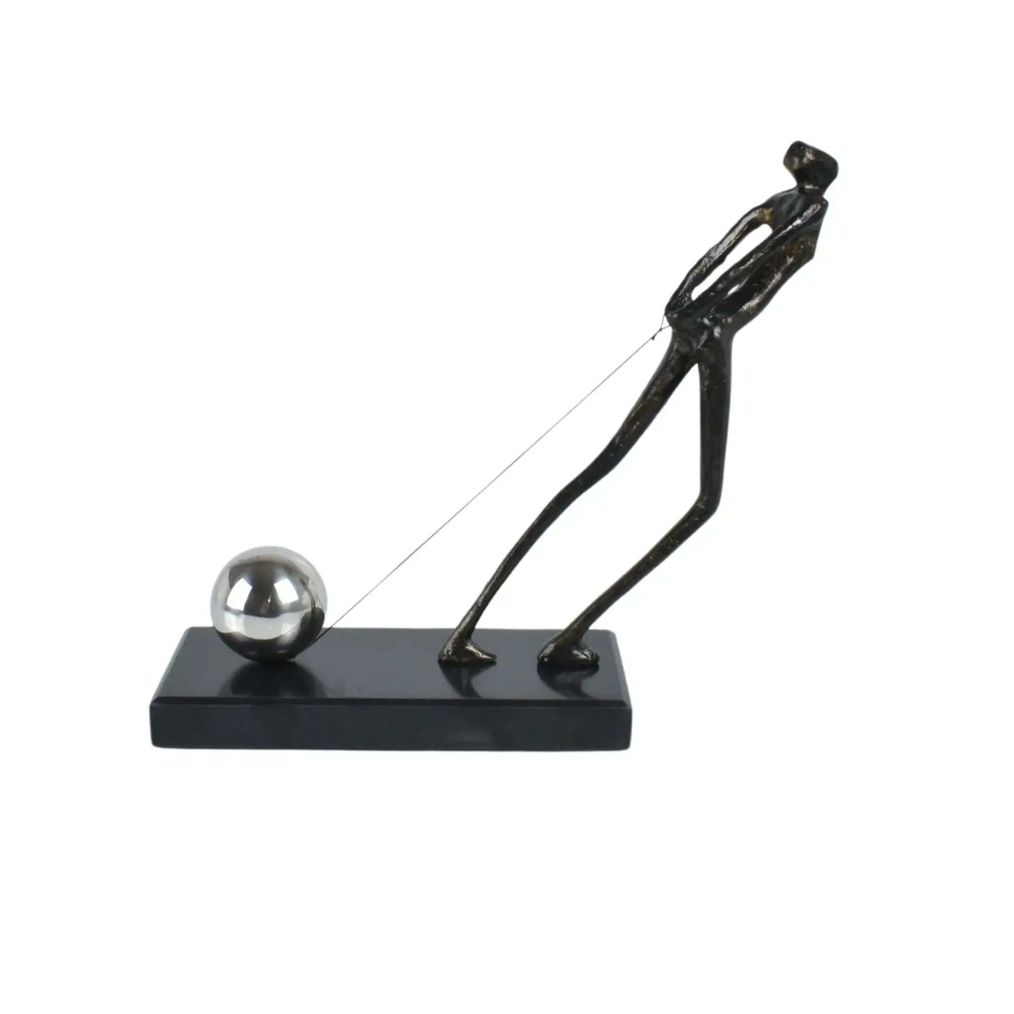 Figur aus hochwertigem Stahl, glänzende Edelstahlkugel und ein massives Marmorgestell – ein stilvoller Materialmix mit klarer Aussagekraft.