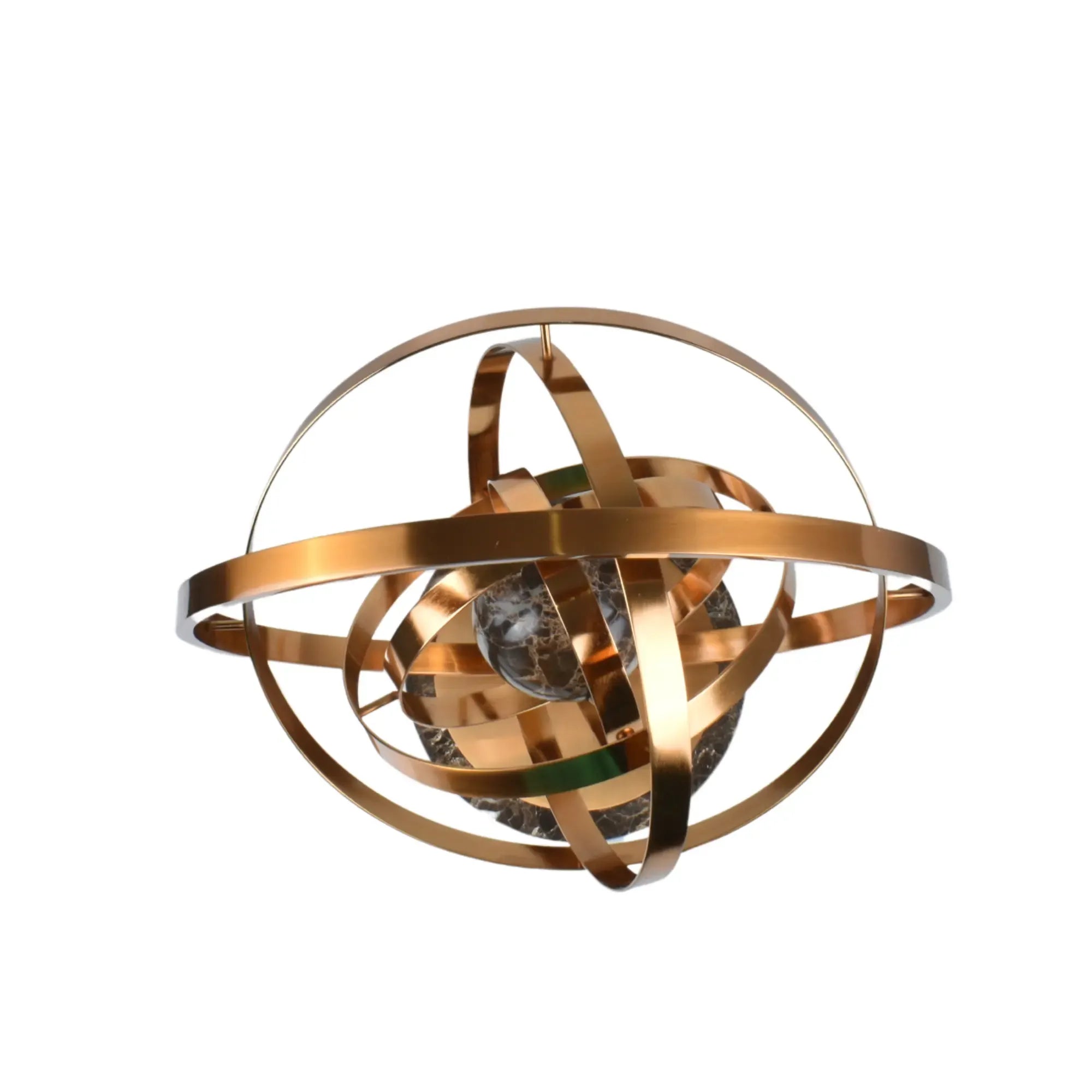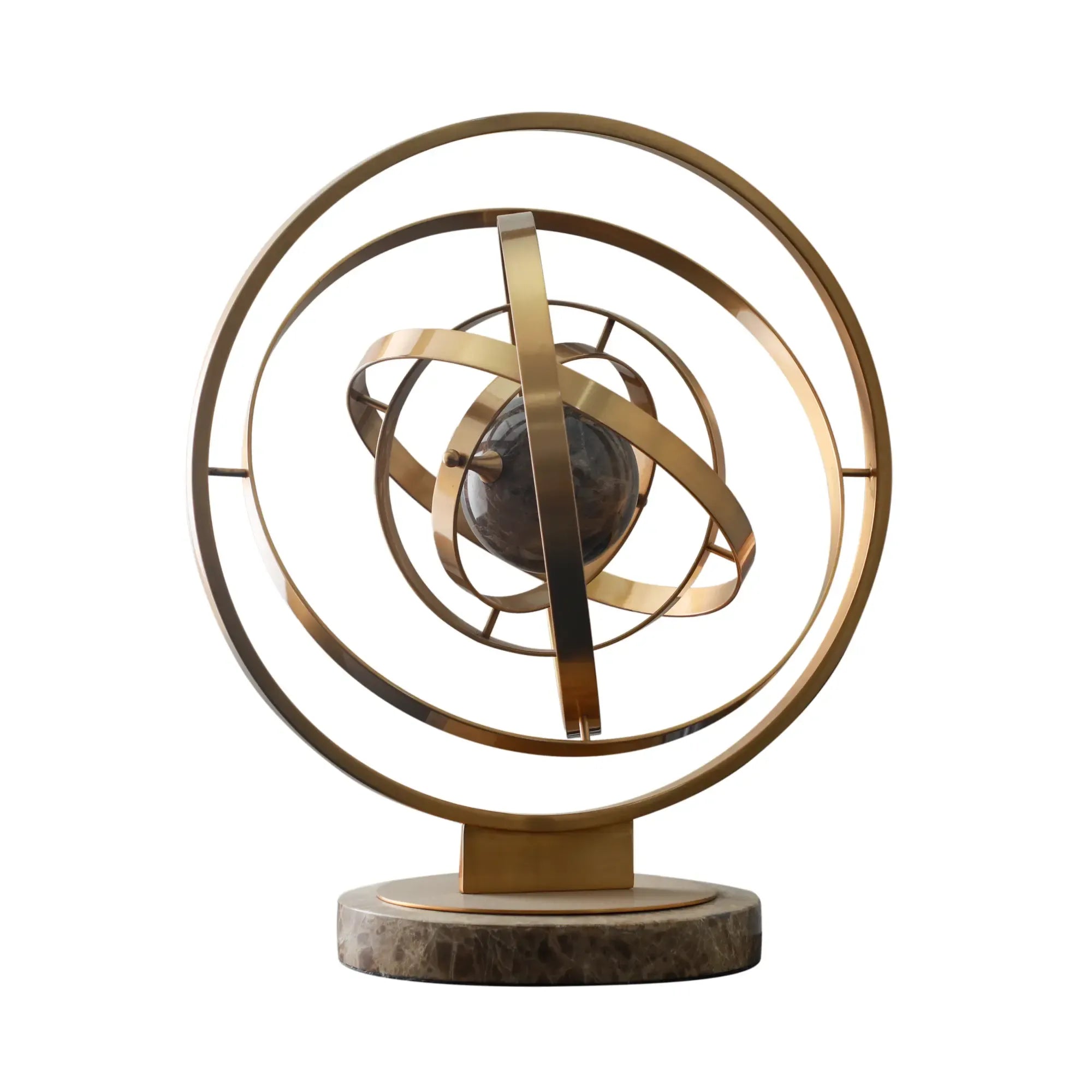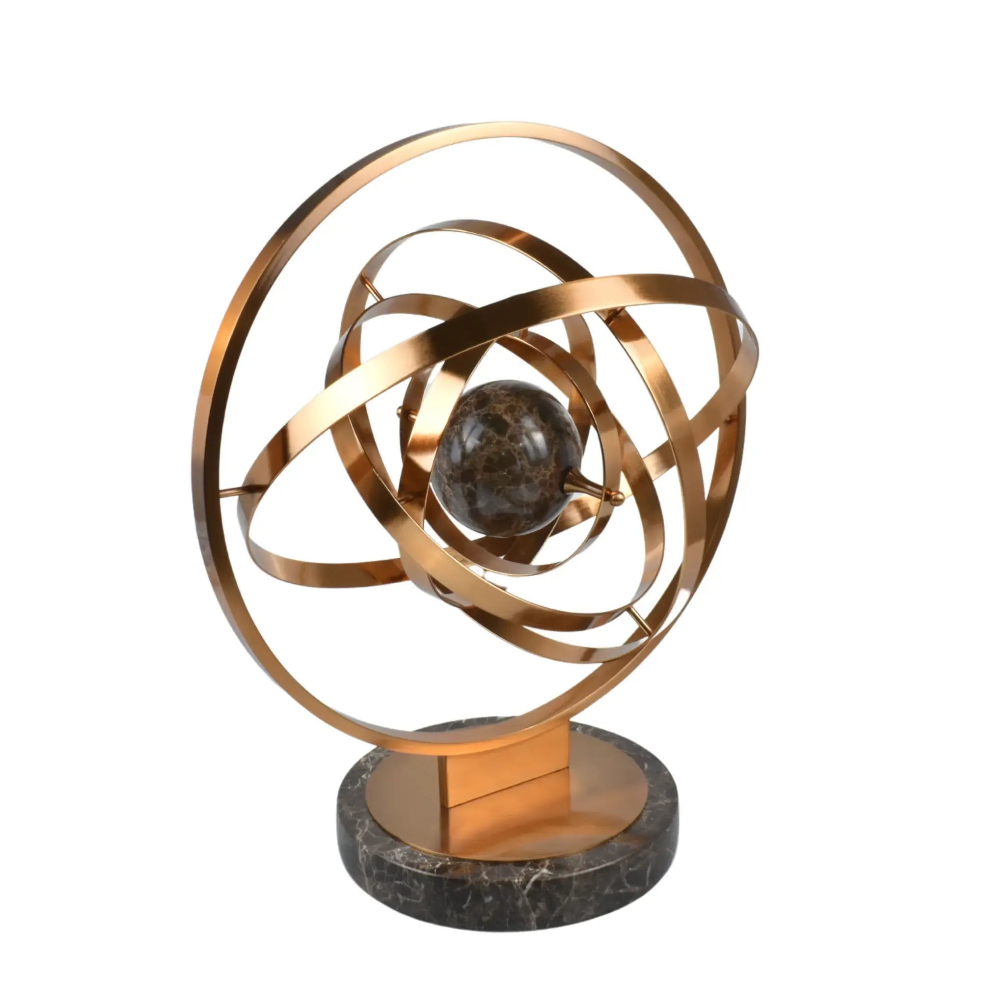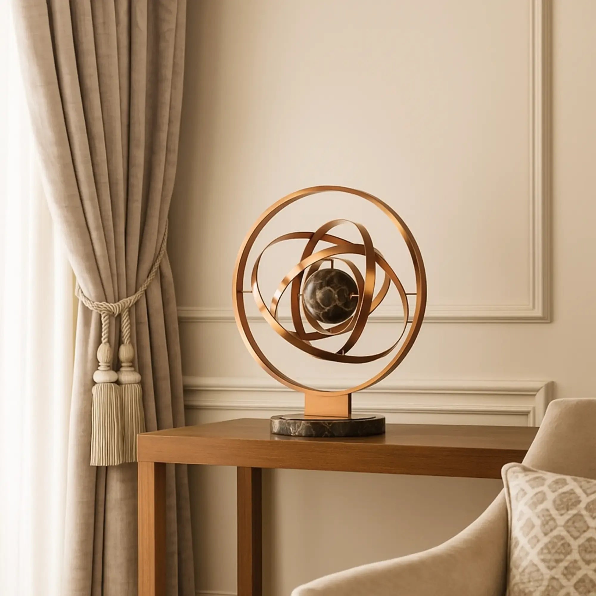 Die abstrakte Skulptur „AliaMondo“ besticht durch klare, moderne Linien und eine elegante Komposition aus braunem Marmor mit beiger Naturmaserung. Umrahmt wird die zentrale Marmorkugel von fein gearbeiteten Ringen in Antikgold, die an eine kosmische Sphärenstruktur erinnern und dem Objekt einen Hauch von Luxus und Tiefe verleihen.