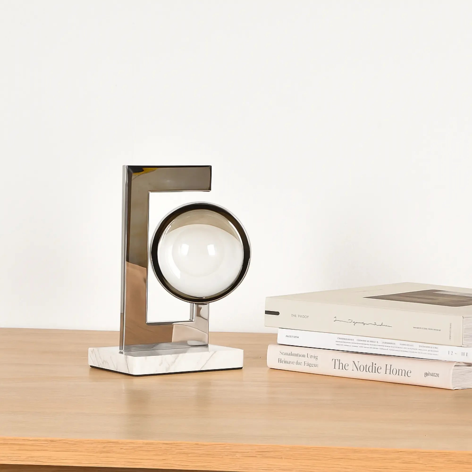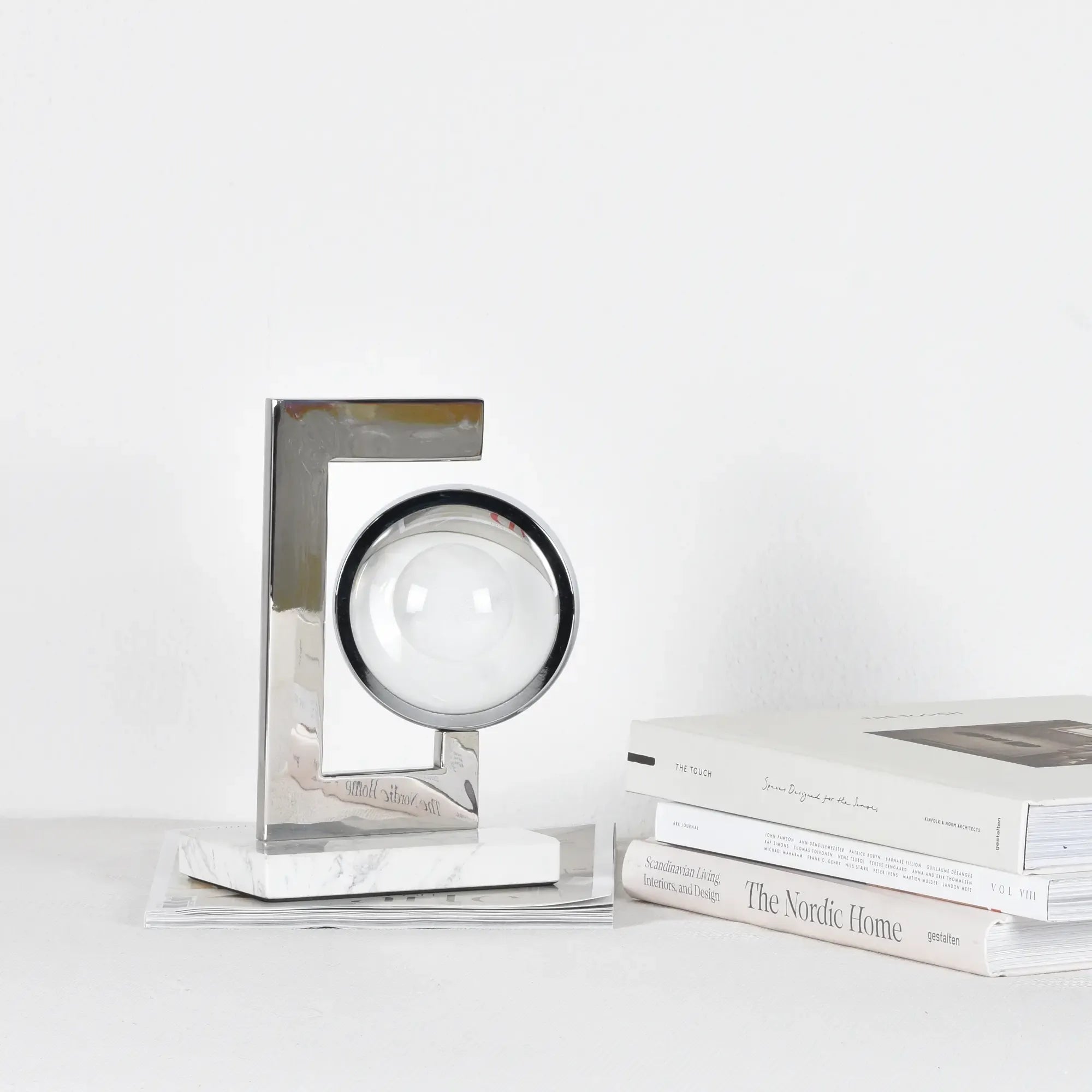 Gefertigt aus hochwertigem weißem Marmor mit grauer Maserung, kombiniert mit silbernem Edelstahl in moderner G-Form. Die zentrale Glaskugel enthält eine klare Kristallkugel mit 3D-Optik – edel, massiv und handgearbeitet.