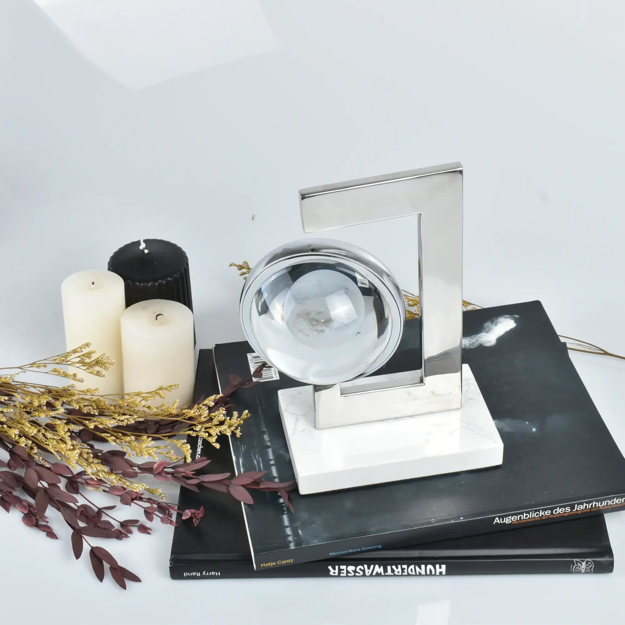 Gefertigt aus hochwertigem weißem Marmor mit grauer Maserung, kombiniert mit silbernem Edelstahl in moderner G-Form. Die zentrale Glaskugel enthält eine klare Kristallkugel mit 3D-Optik – edel, massiv und handgearbeitet.