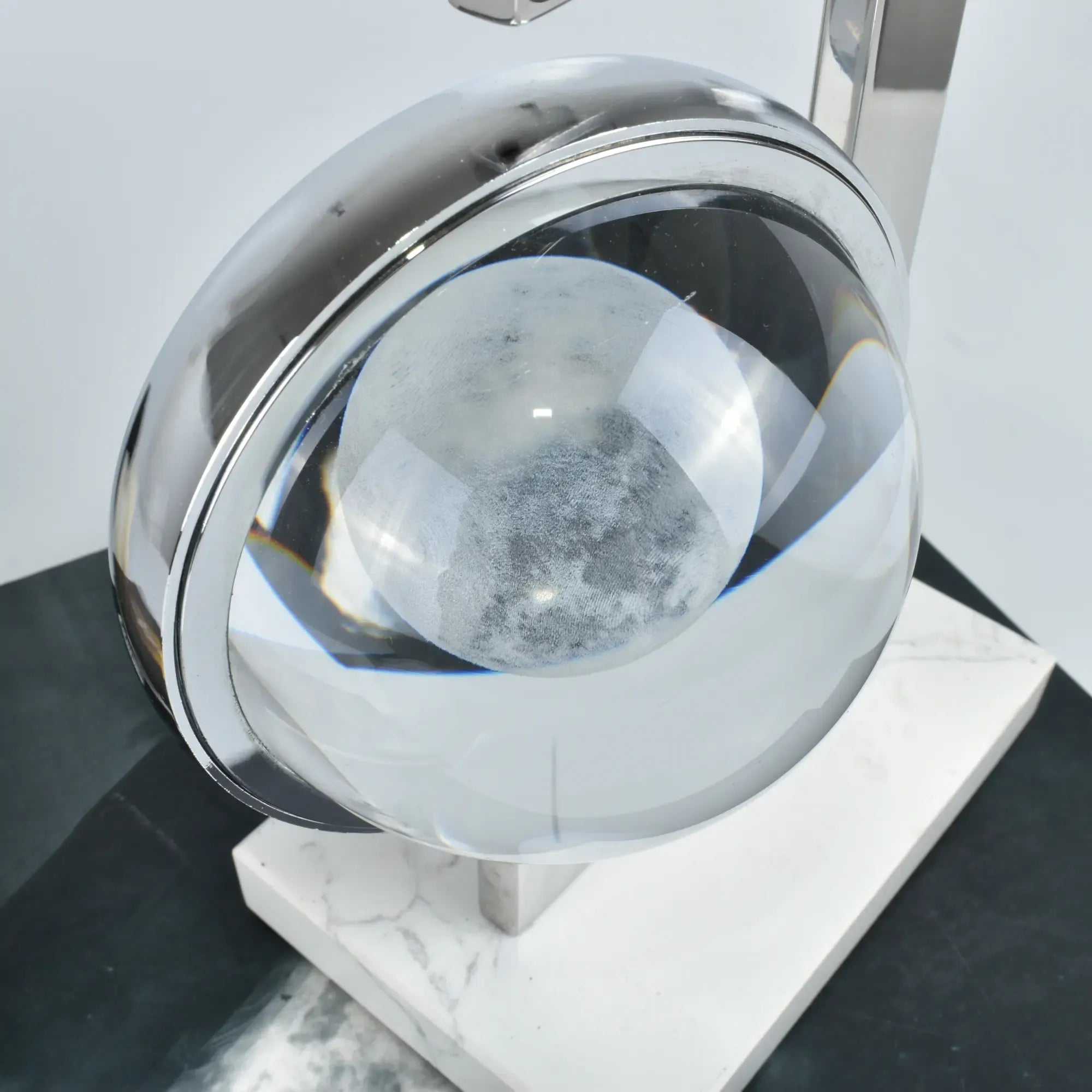 Innovatives Zusammenspiel von Metall, Glas und Kristall – die Kugel erinnert an Mond oder Erde und erzeugt durch die Transparenz eine mystische, moderne Ausstrahlung.