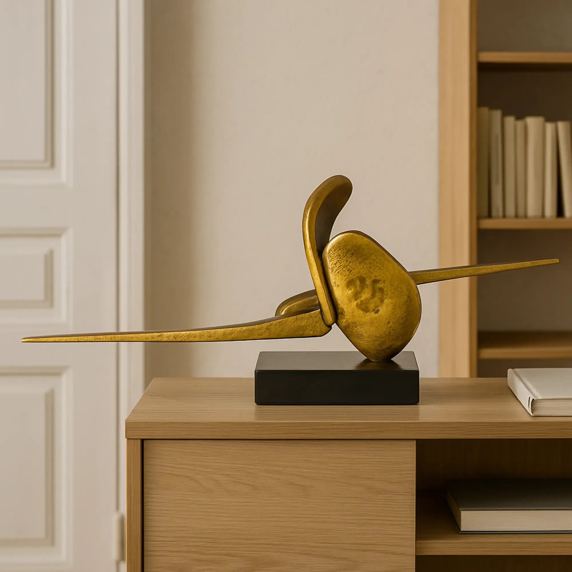 Der schwere Marmorsockel sorgt für sicheren Stand, auch auf Sideboards, Regalen oder Podesten. Die Skulptur bleibt stabil und wirkt zugleich leicht.