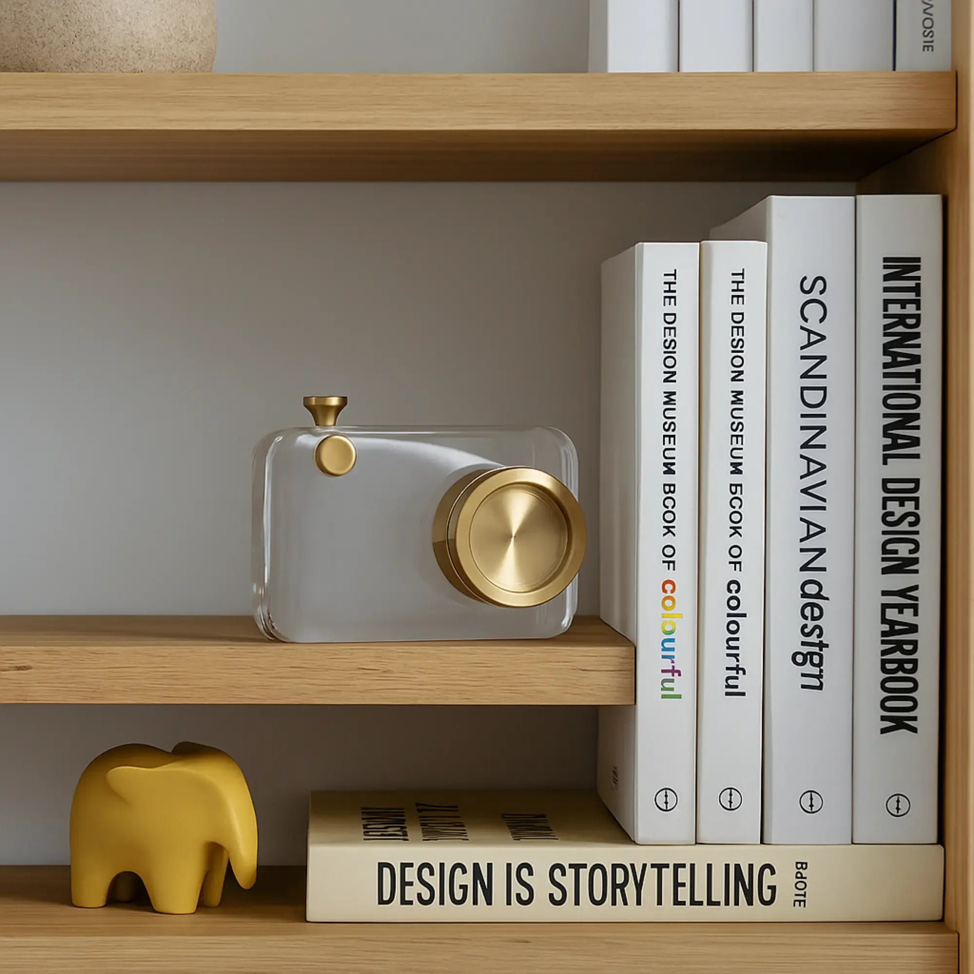 Die Kameraform ist modern und minimalistisch, mit goldenen Akzenten, die Eleganz und Raffinesse signalisieren. Perfekt für Liebhaber von Fotografie und Kunst.