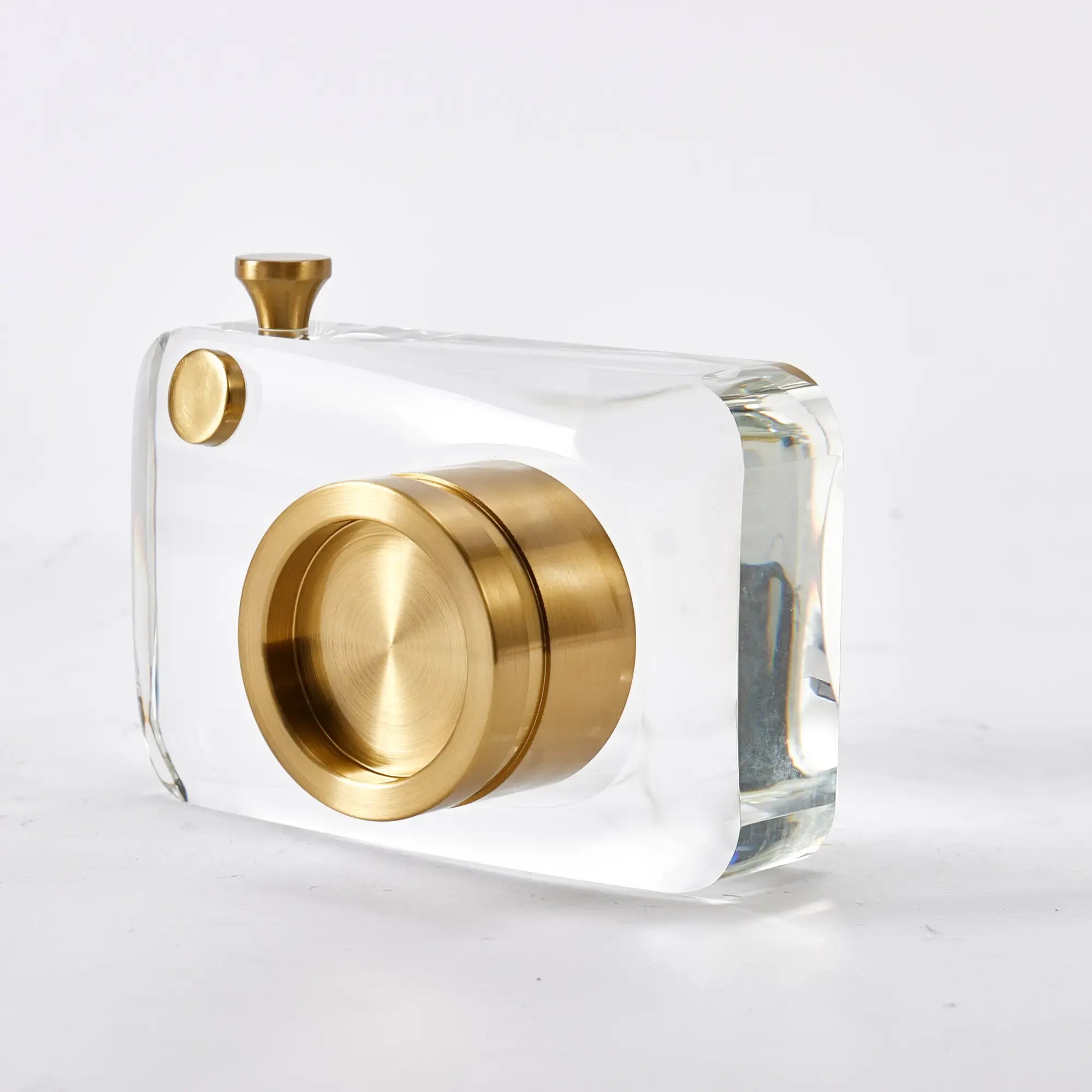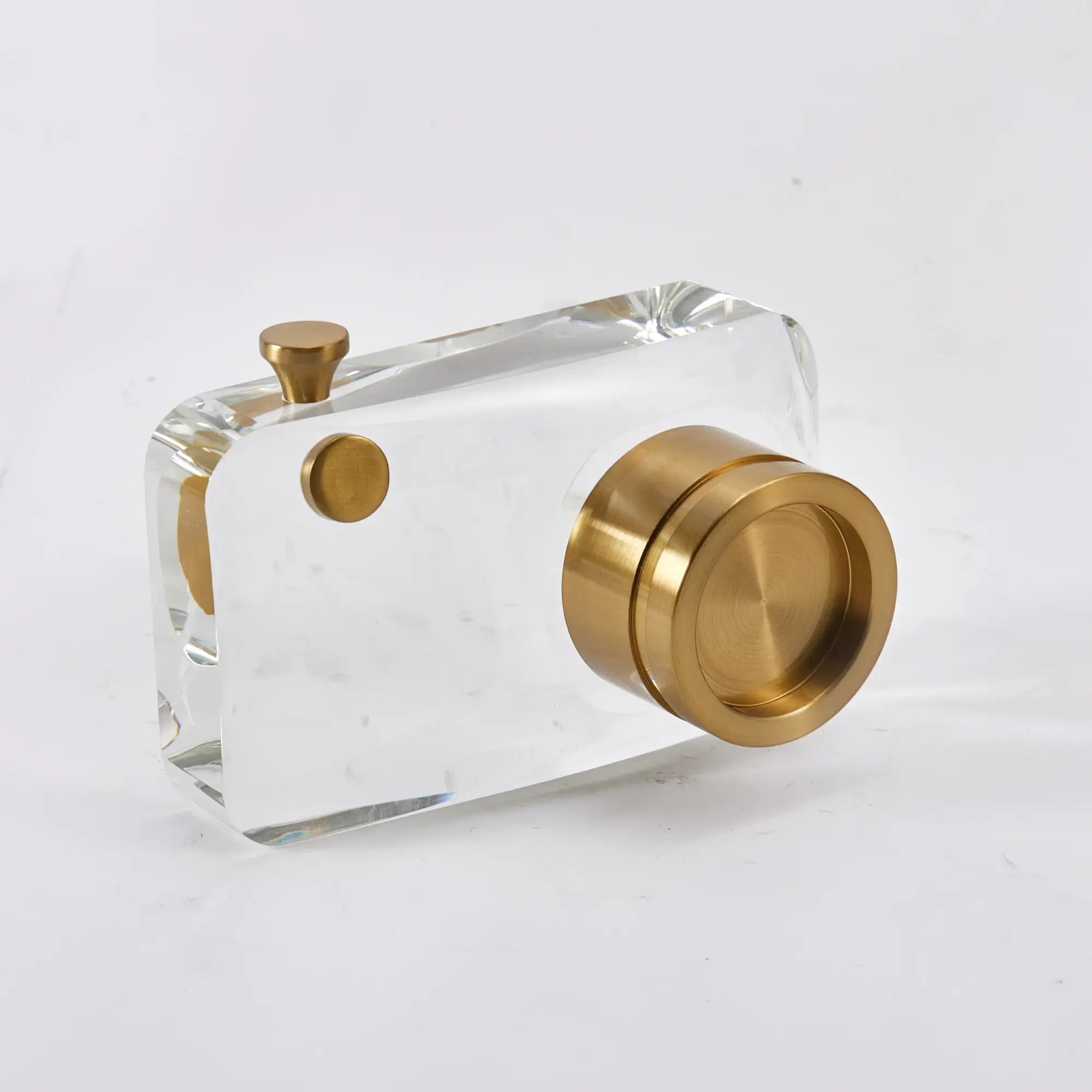 Diese exquisite Kristallkamera, verziert mit edlen goldenen Elementen, verbindet modernes Design mit einem Hauch von luxuriöser Eleganz. Ihr abstrakter Stil macht sie zu einem herausragenden Dekorationsstück, das in jedem Raum einen unverwechselbaren Akzent setzt. Ob auf einem Regal, einer Kommode oder einem Sideboard – dieses Kunstwerk zieht garantiert alle Blicke auf sich.