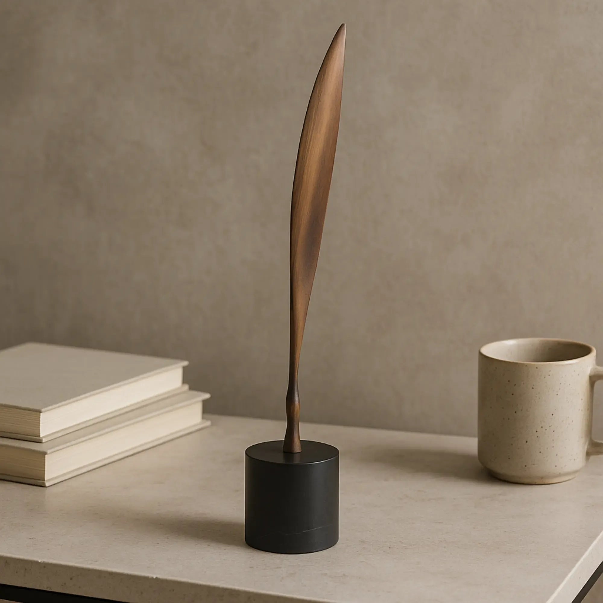 Elegance Sculpt ist eine stilvolle Skulptur in Federform, die Leichtigkeit und Stabilität in perfekter Balance vereint. Das bronzefarbene Messing-Element schwebt förmlich über dem massiven Sockel aus schwarzem Marmor und erinnert in seiner geschwungenen Form an eine abstrahierte Feder – Symbol für Eleganz, Bewegung und Inspiration. Diese Design Skulptur mit Bronzefinish ist ideal als edles Dekoobjekt für Sideboards, Bücherregale oder Empfangsbereiche. Auch auf Schreibtischen sorgt sie für eine stilvolle Note – eine ideale Dekoidee für moderne Arbeitsplätze, kreative Studios oder elegante Hotelinterieurs. Der Kontrast zwischen glänzendem Metall und dunklem Naturstein verleiht ihr eine starke Präsenz – ob im modernen Loft, klassischen Interieur oder stilvollen Office. Elegance Sculpt ist nicht nur ein Kunstobjekt, sondern auch ein symbolisches Geschenk für Designliebhaber oder Poesiebegeisterte – ein handgefertigter Blickfang mit Bedeutung und Charakter.