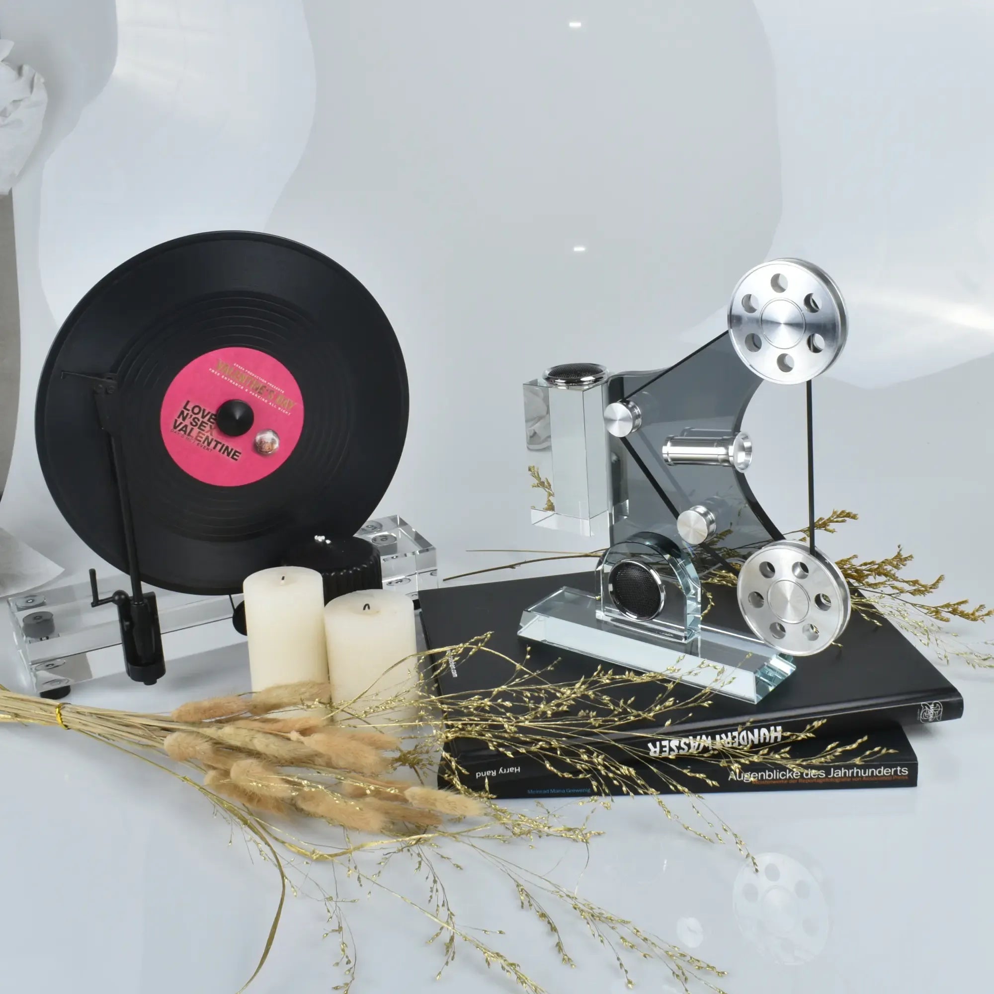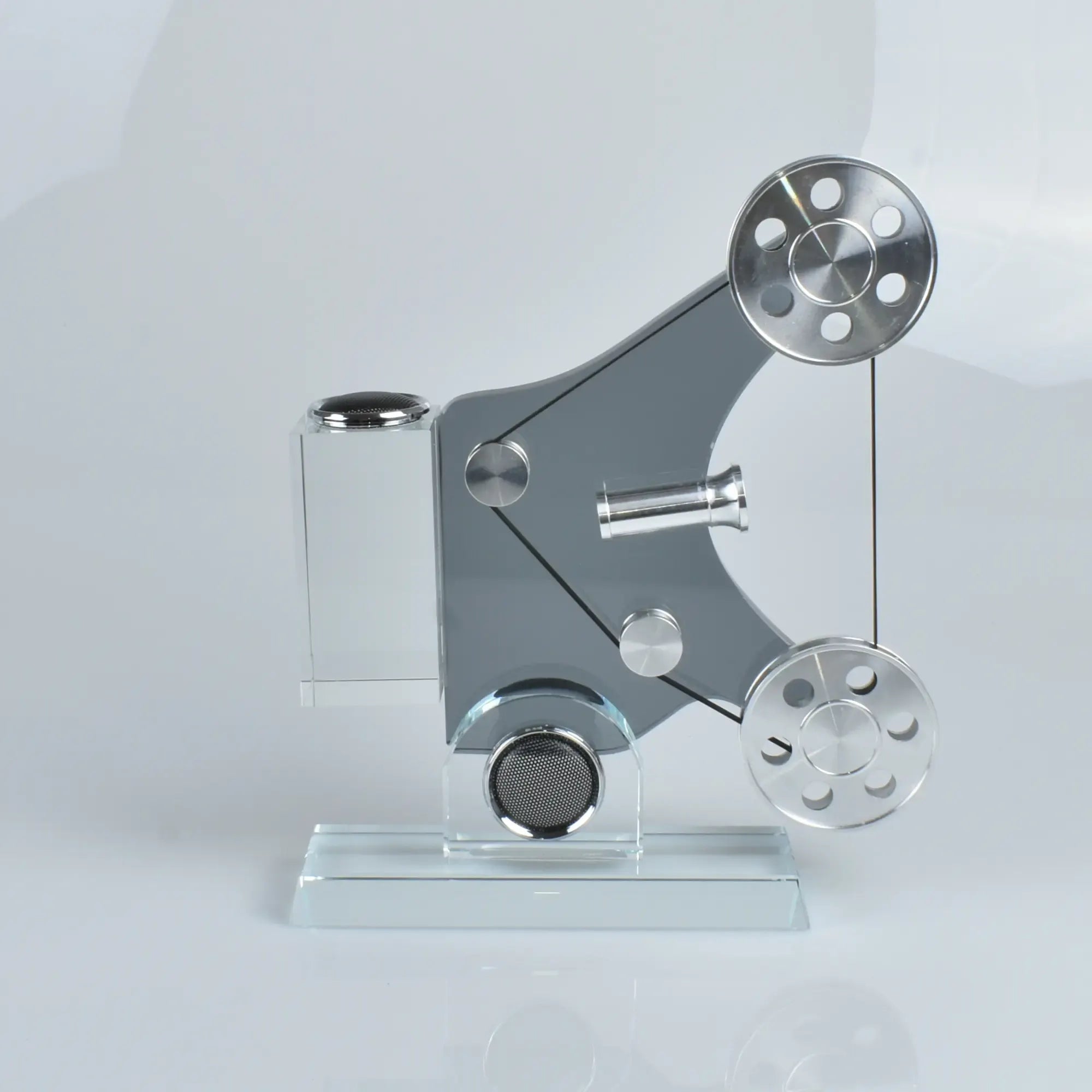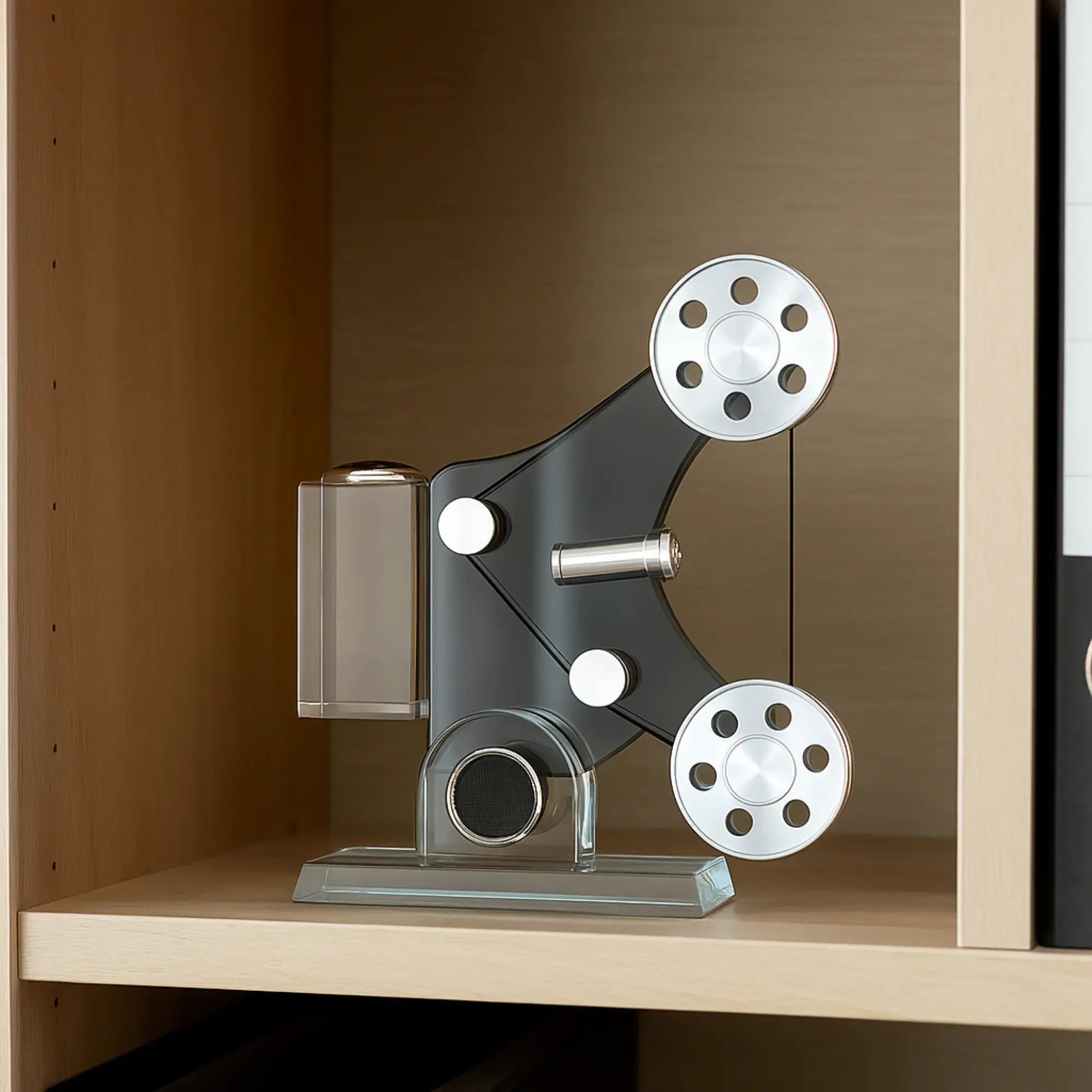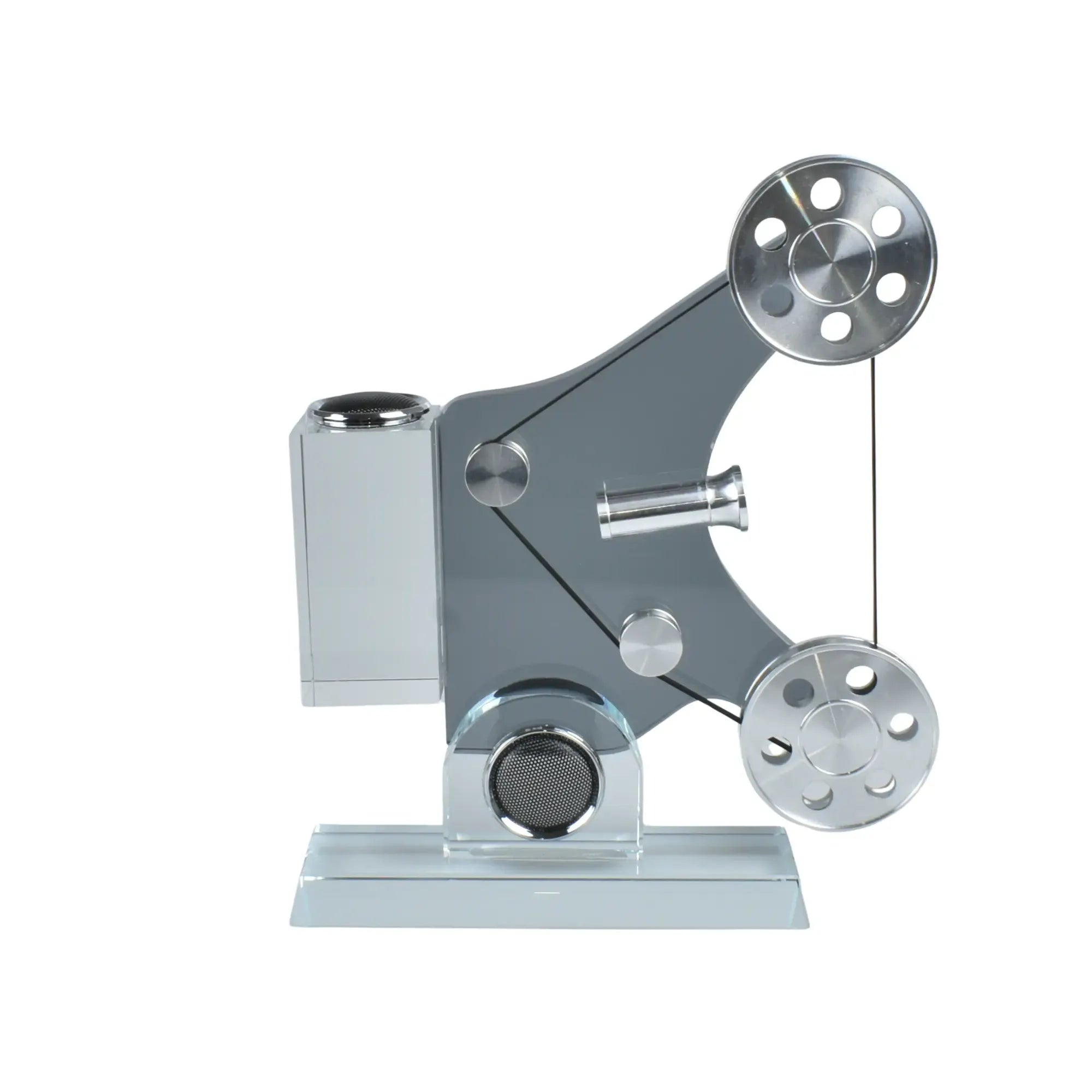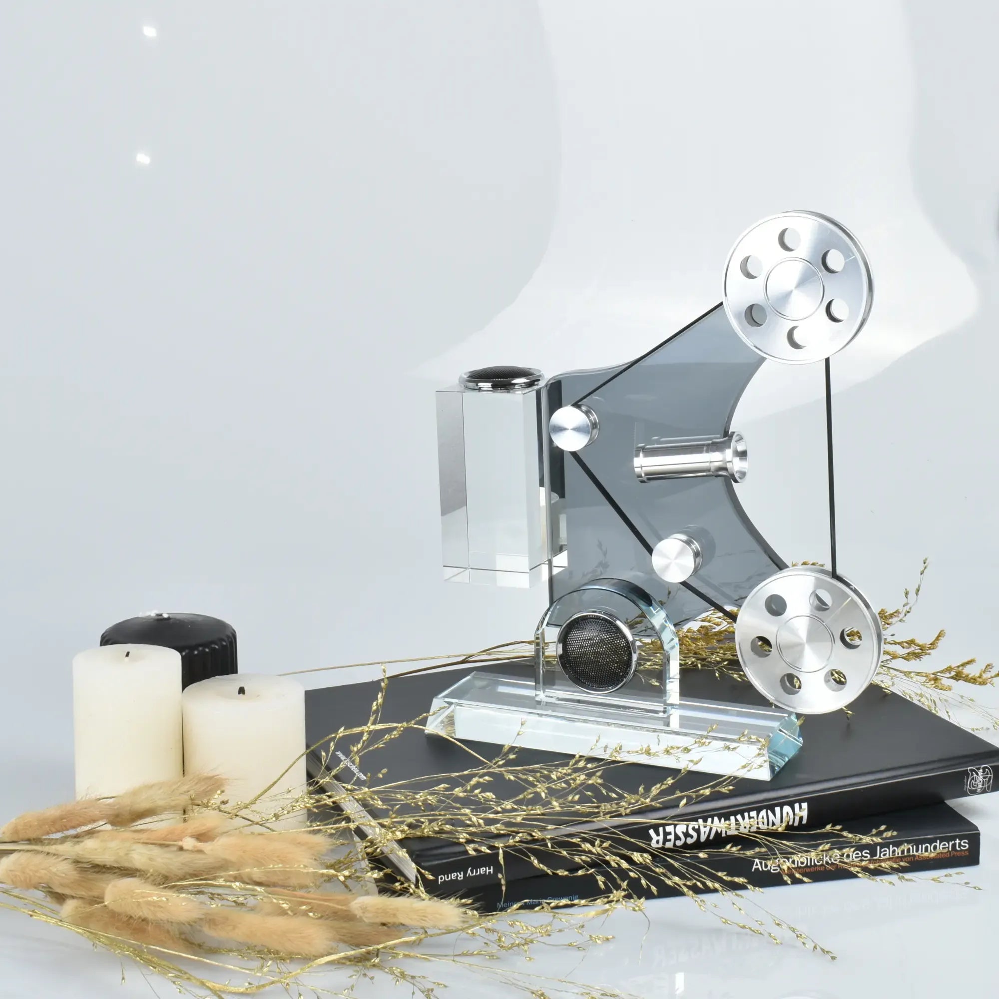 Filmprojektor-inspiriertes Design, hochwertiges Acryl mit Metallkomponenten, minimalistisch und stilvoll, einzigartiges Dekoobjekt für technikaffine Ästheten, modernes Wohnaccessoire mit Retro-Vibe – ein nostalgisches Highlight und außergewöhnliches Einweihungsgeschenk.