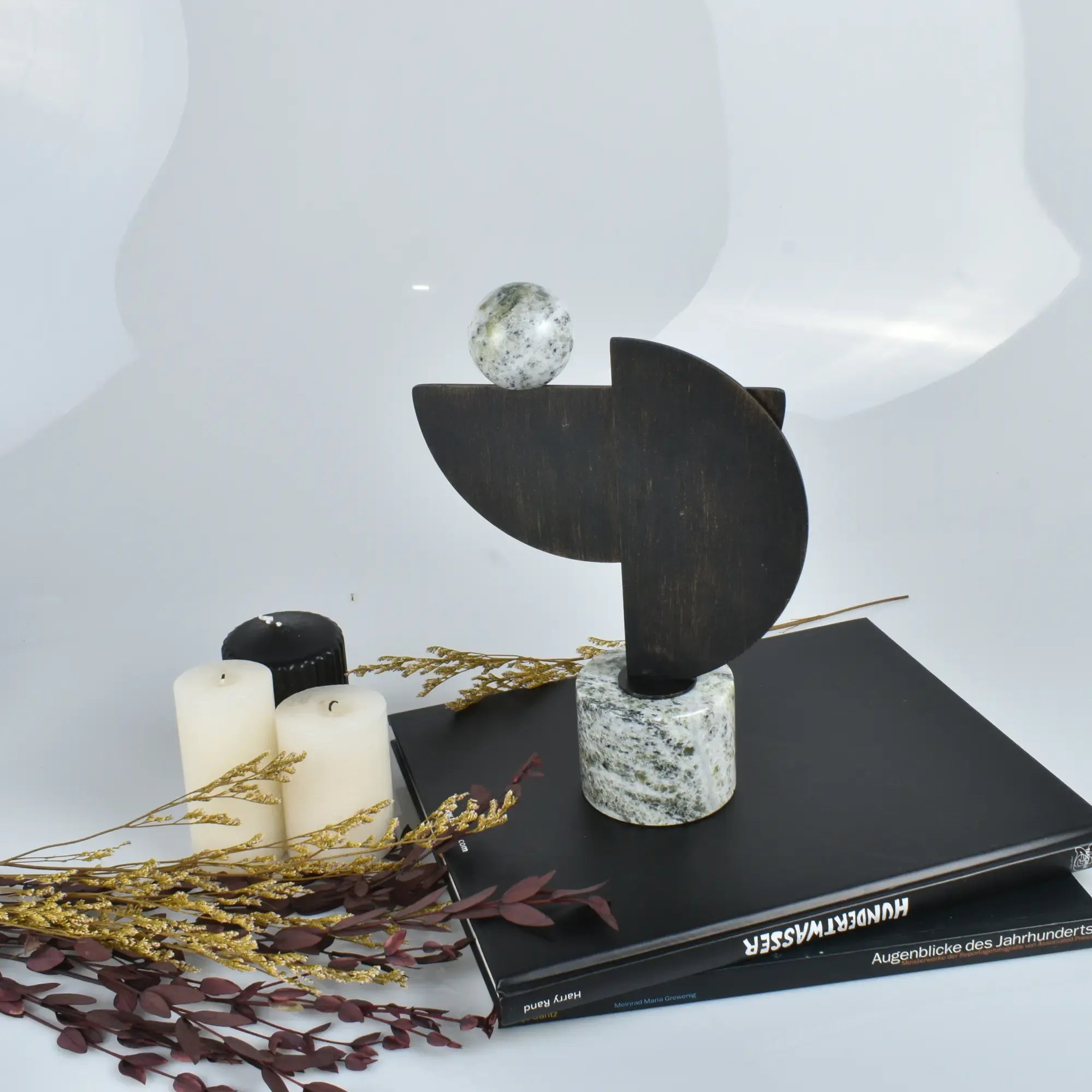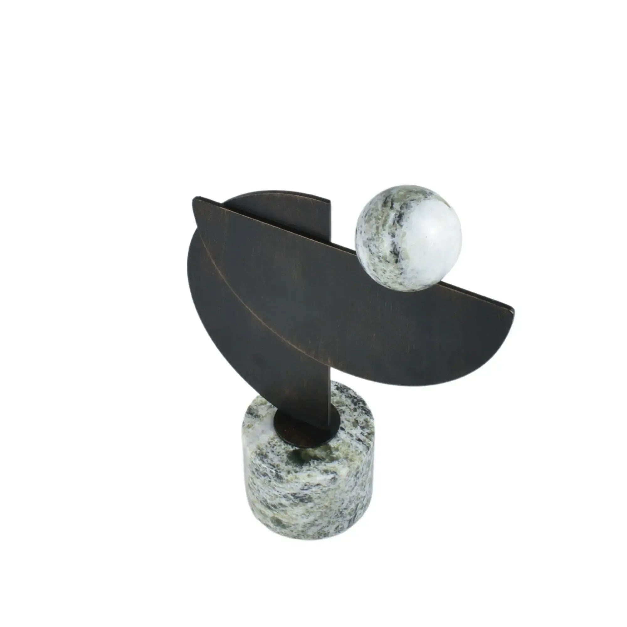 Geometrische Steinskulptur – die Sculpture Géométrique vereint modernes Design mit klassischer Handwerkskunst. Aus robustem Stahl in Antikbronze-Optik gefertigt und mit einem massiven grünen Marmorsockel kombiniert, entsteht ein spannungsvoller Mix aus rohem Material und raffinierter Formgebung. Die geometrischen Halbkreisformen und die polierte Natursteinkugel unterstreichen den Bauhaus-inspirierten Charakter und machen das Objekt zu einer skulpturalen Dekoration mit Designanspruch. Die Antikbronze-Patina verleiht dabei einen Hauch von Vintage, ohne an Modernität zu verlieren. Ideal für Sideboards, Galerieräume, Homeoffice oder Empfangsbereiche, ist dieses Kunstobjekt nicht nur ein dekorativer Akzent, sondern auch ein edles Geschenk für Sammler, Kunstliebhaber oder als Pokal für Vereine und Designpreise.