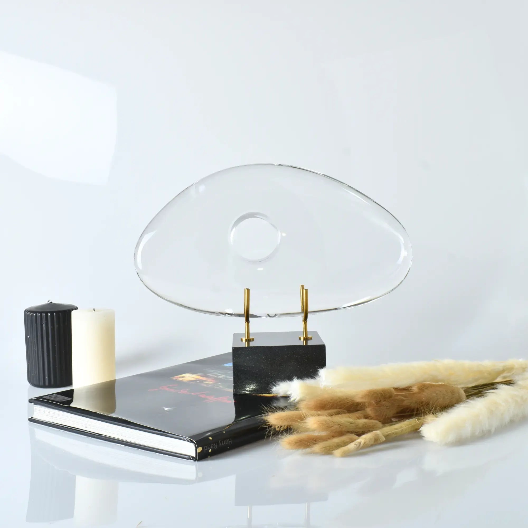 Das Dekorationsobjekt „Nuvole“ überzeugt mit schlichter Eleganz und zeitloser Wirkung. Die klare, organisch geformte Glasdekoration mit zentraler Öffnung erinnert an einen schwebenden Tropfen oder eine Wolke – eine moderne, abstrakte Dekoration mit besonderer Leichtigkeit. Getragen wird sie von zwei filigranen goldfarbenen Halterungen, die in einem massiven, schwarzen Steinsockel verankert sind – ein spannender Kontrast aus Klarheit, Glanz und Stabilität. Diese handgefertigte Glasform ist besonders schwer und vielseitig einsetzbar. Sie passt perfekt in Bücherregale, sieht beeindruckend auf Arbeitstischen aus und fügt sich harmonisch in Büros, Anwaltskanzleien, Hotels oder Wohnzimmer ein. Nuvole ist ein hochwertiges Kunstobjekt für stilvolle Dekorationsideen zu Hause oder im Arbeitsumfeld. Als elegantes Geschenk zur Einweihung, für Freunde oder Mitarbeiter, bleibt es ein ewiger Blickfang, der Ruhe, Design und Klasse ausstrahlt.
