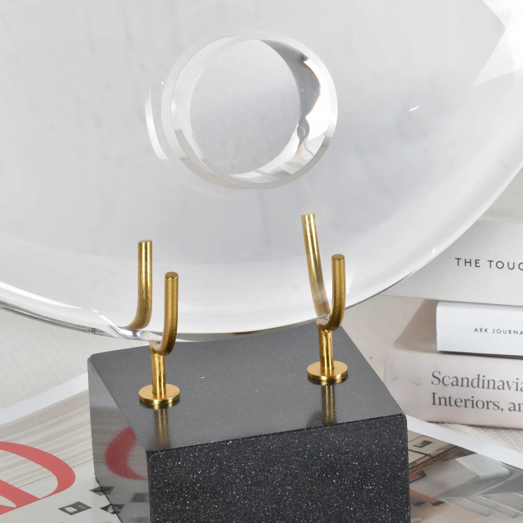 Hochwertiger Kristall in klarer Tropfenform mit offener Mitte – elegant, modern und faszinierend. Der schwarze Marmorsockel sorgt für Stabilität, die Antikgold-Halterung verleiht dem Objekt luxuriösen Charakter.