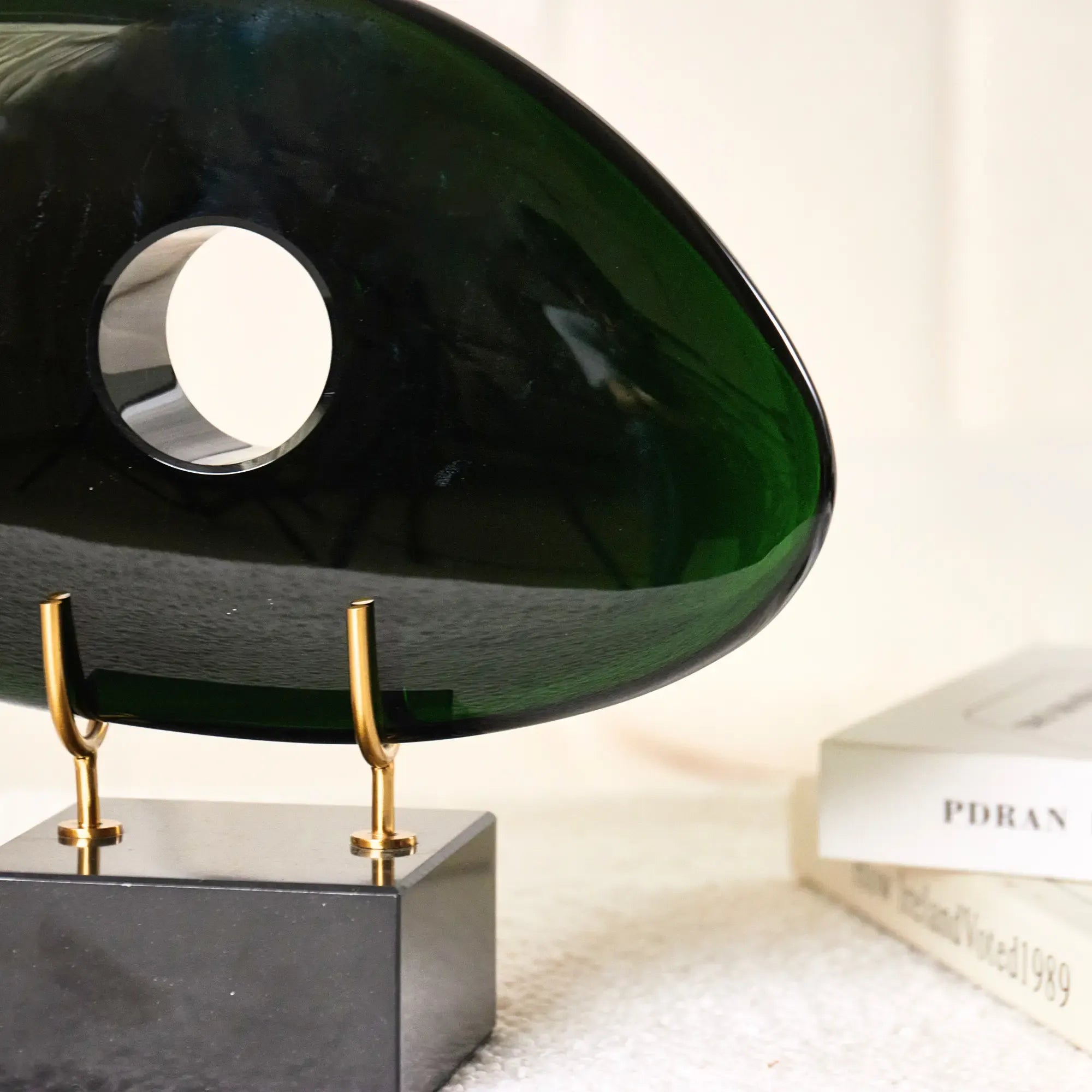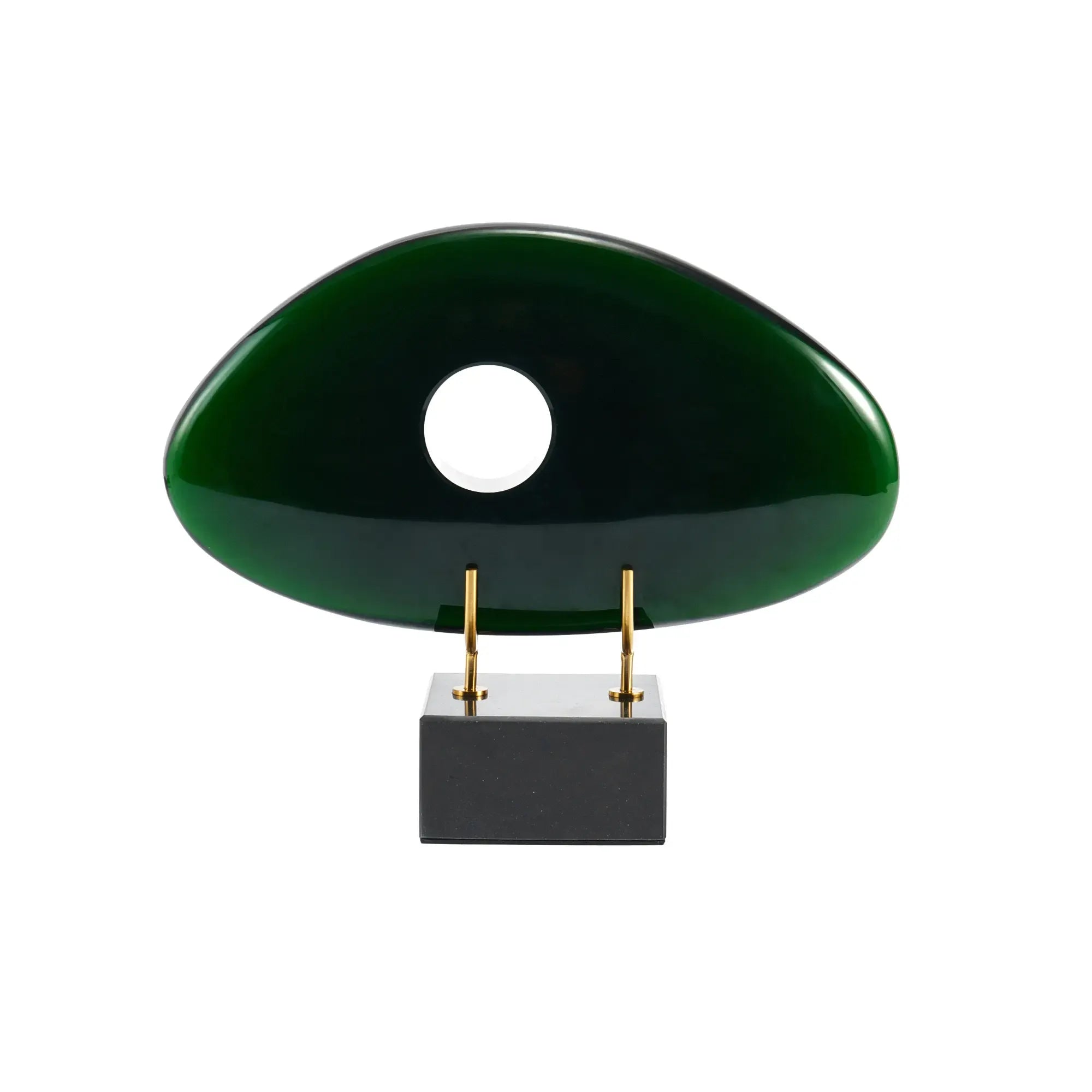 Verde Vision ist eine ausdrucksstarke Glas-Skulptur in tiefem Grün, die mit ihrer organischen Form und dem zentralen Durchbruch moderne Ästhetik und symbolische Tiefe vereint. Der glatt polierte Kristallkörper mit seinem harmonisch geschwungenen Design zieht sofort die Blicke auf sich – ein echtes Statement-Piece für stilvolle Interiors. Getragen wird das Kunstwerk von einem soliden Marmor-Sockel, ergänzt durch filigrane, goldfarbene Metallhalterungen, die dem Objekt Leichtigkeit und Eleganz verleihen. Als Teil einer Sammlung wie Nuvole oder als eigenständige Dekoskulptur mit Sockel setzt Verde Vision besondere Akzente auf Sideboards, in Regalen oder Empfangsbereichen. Ideal für moderne Wohnräume, stilvolle Büros, Hotel-Lobbys oder Designliebhaber, die Wert auf Form, Materialität und symbolische Präsenz legen – ein hochwertiges Kunstobjekt aus grünem Glas, das moderne Gestaltung mit luxuriöser Ausstrahlung verbindet.