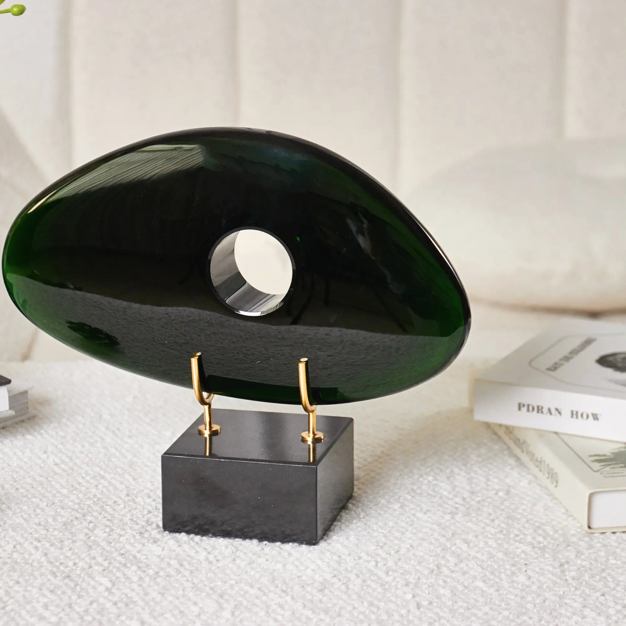 Verde Vision ist eine ausdrucksstarke Glas-Skulptur in tiefem Grün, die mit ihrer organischen Form und dem zentralen Durchbruch moderne Ästhetik und symbolische Tiefe vereint. Der glatt polierte Kristallkörper mit seinem harmonisch geschwungenen Design zieht sofort die Blicke auf sich – ein echtes Statement-Piece für stilvolle Interiors. Getragen wird das Kunstwerk von einem soliden Marmor-Sockel, ergänzt durch filigrane, goldfarbene Metallhalterungen, die dem Objekt Leichtigkeit und Eleganz verleihen. Als Teil einer Sammlung wie Nuvole oder als eigenständige Dekoskulptur mit Sockel setzt Verde Vision besondere Akzente auf Sideboards, in Regalen oder Empfangsbereichen. Ideal für moderne Wohnräume, stilvolle Büros, Hotel-Lobbys oder Designliebhaber, die Wert auf Form, Materialität und symbolische Präsenz legen – ein hochwertiges Kunstobjekt aus grünem Glas, das moderne Gestaltung mit luxuriöser Ausstrahlung verbindet.